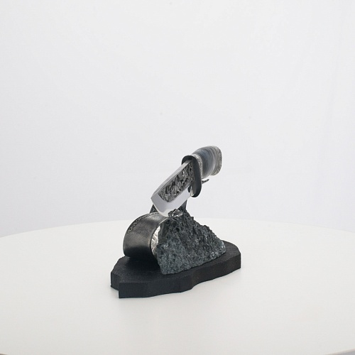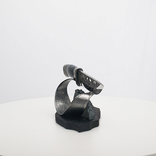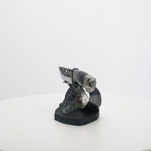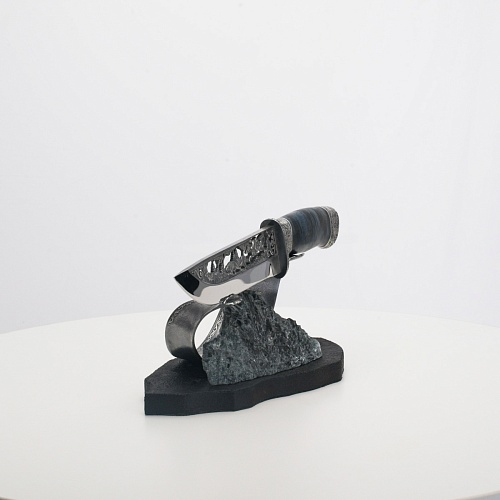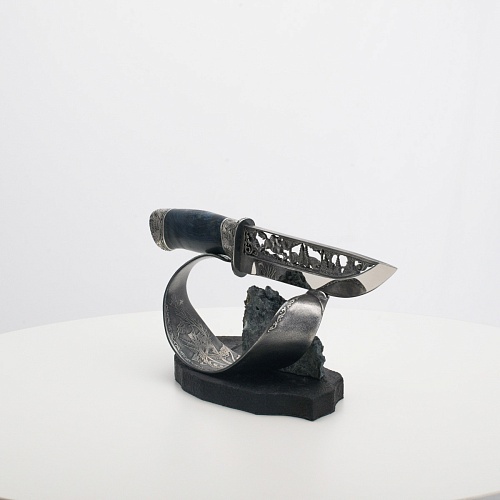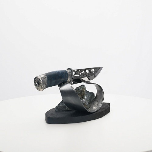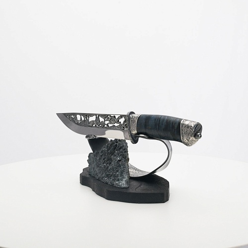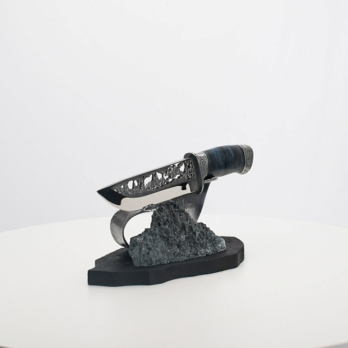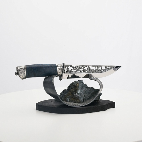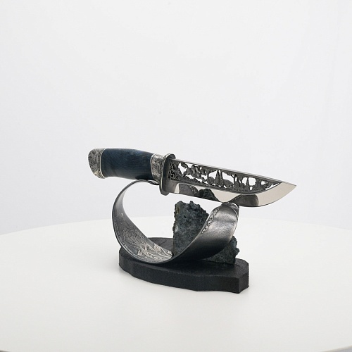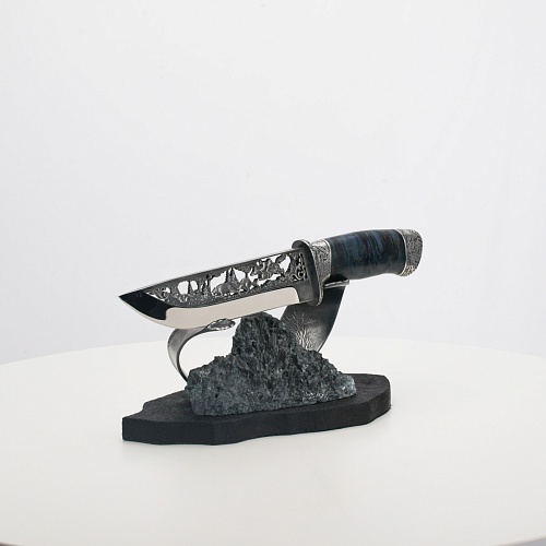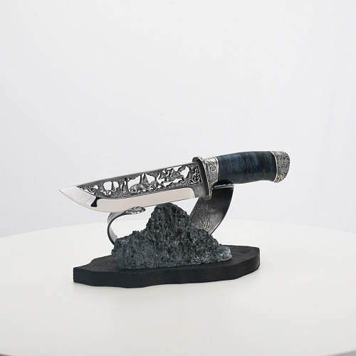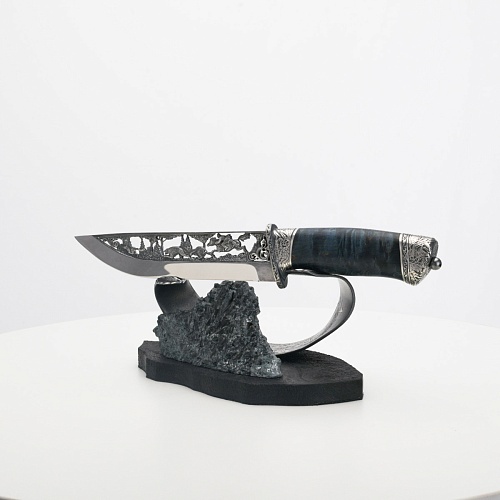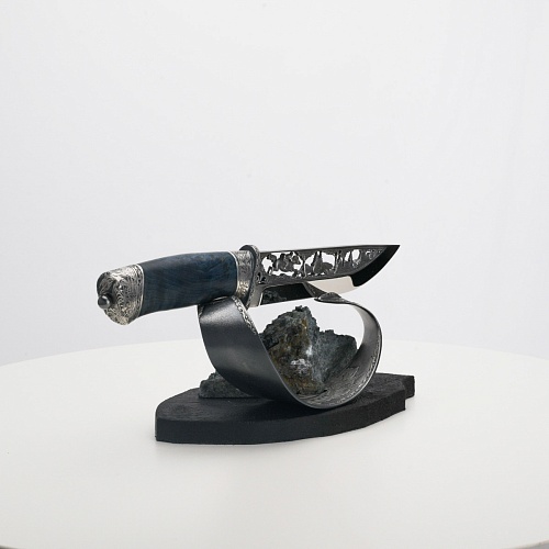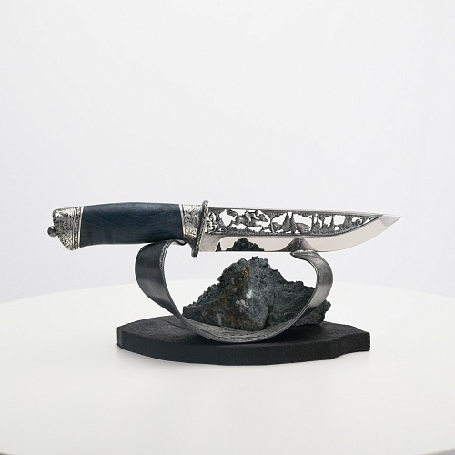 Погоня за лисами показана на искусно выполненном просечном клинке – охотничьи собаки, называемые лисогонами или красногонами, догоняют лисицу, конь несет охотника изо всех сил вперед в погоне за ценной добычей. Сложность и тонкость работы мастеров, изготовивших просечной клинок с гравировкой, можно оценить по тому факту, насколько детально выполнены все элементы и передан азарт охотника. Рукоять ножа выполнена из стабилизированной карельской березы синего цвета, навершие и гарда покрыты серебром и украшены растительными орнаментами, изображениями леса, гор, лесных троп. В композицию входит сложная, оригинальная подставка. На деревянной основе, символизирующей землю, стоит минерал индиголит – редкая разновидность турмалина интенсивно-синей окраски, назван по своему цвету индиго. Цвет индиголита синий, темно-синий, синевато-черный. В старину в России этот камень называли баусом, часто его называют синим турмалином. Сам нож возвышается над металлической деталью в виде завитка, украшенного лесными пейзажами и покрытого серебром.