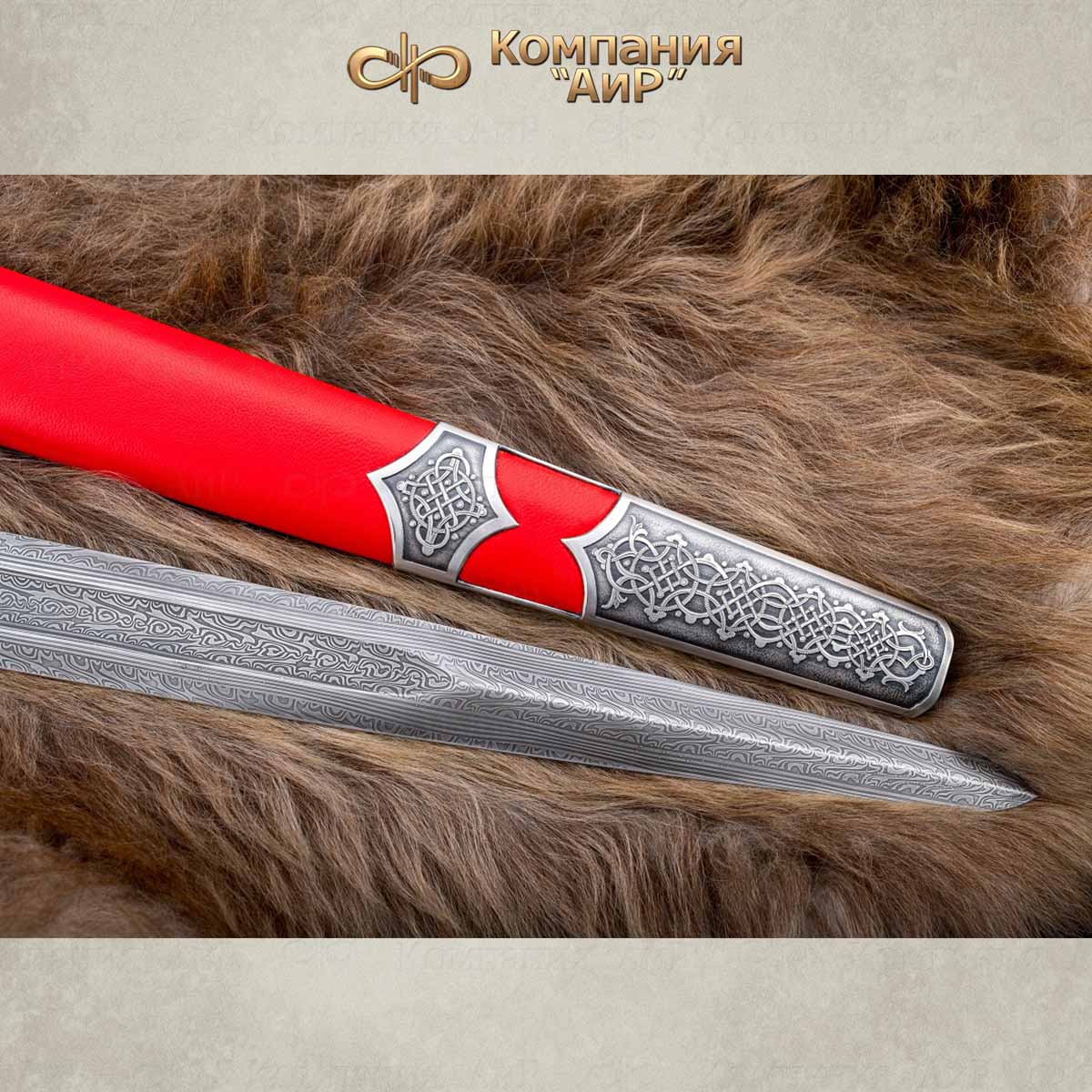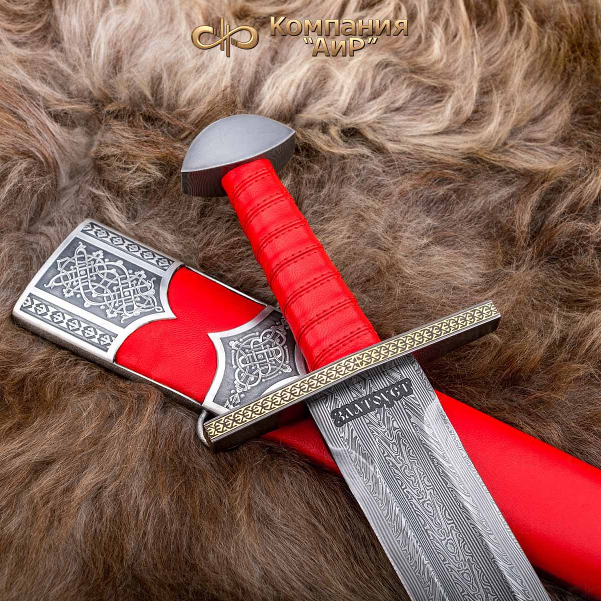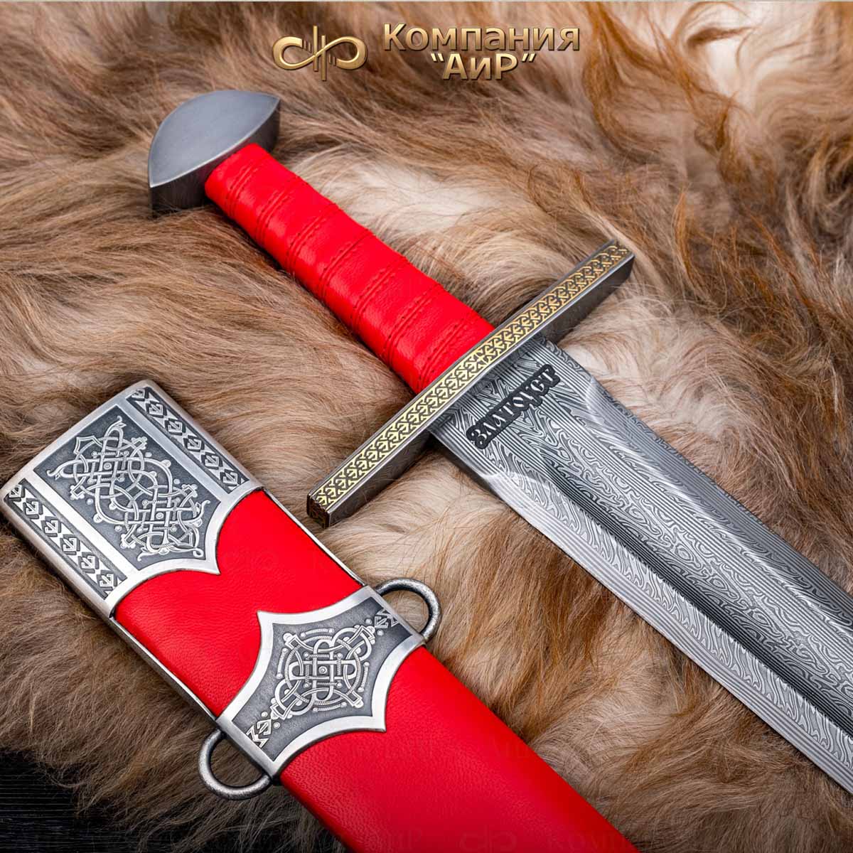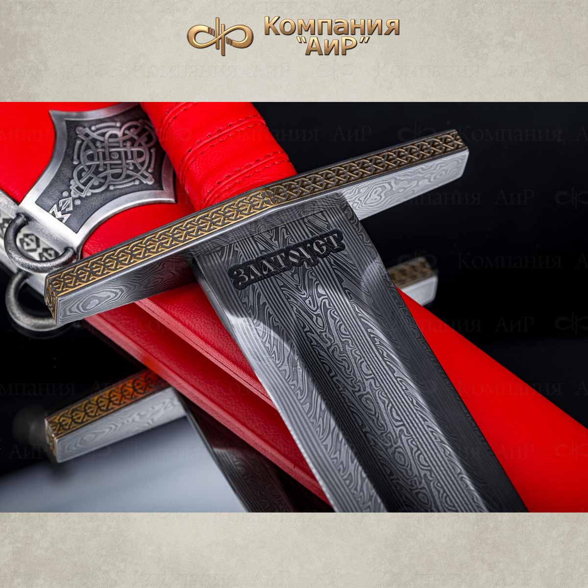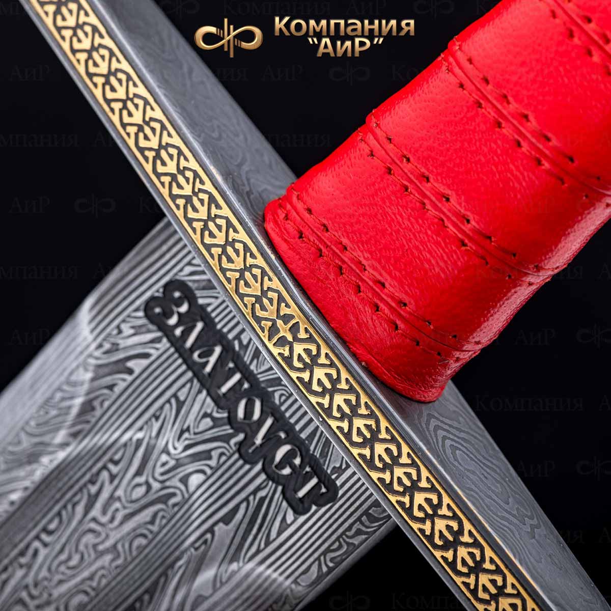 Меч «Святогор» изготовлен из углеродистого дамаска Zladinox (ZD-0801). В качестве прототипа «Святогора» взят средневековый европейский меч. Клинок выполнен из дамаска с узором «Турецкий». На лицевой стороне клинка выгравировано слово «Златоуст», на оборотной стороне – фирменный знак Компании «АиР». Рукоять и гарда выполнены из дамаска с узором «Дикий». Рукоять и комбинированные ножны обтянуты натуральной кожей красного цвета. Гарда украшена славянским орнаментом, покрытым золотом высшей пробы. Устье, обоймица и наконечник ножен покрыты серебром с эффектом благородного патинирования, украшены древнерусскими узорами и символами.