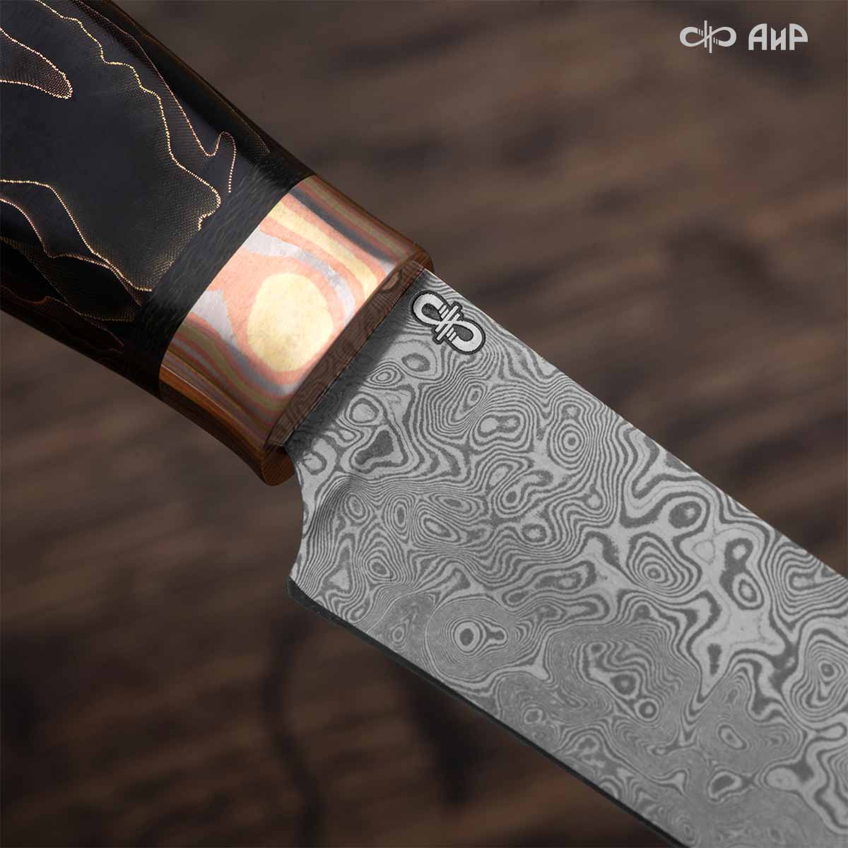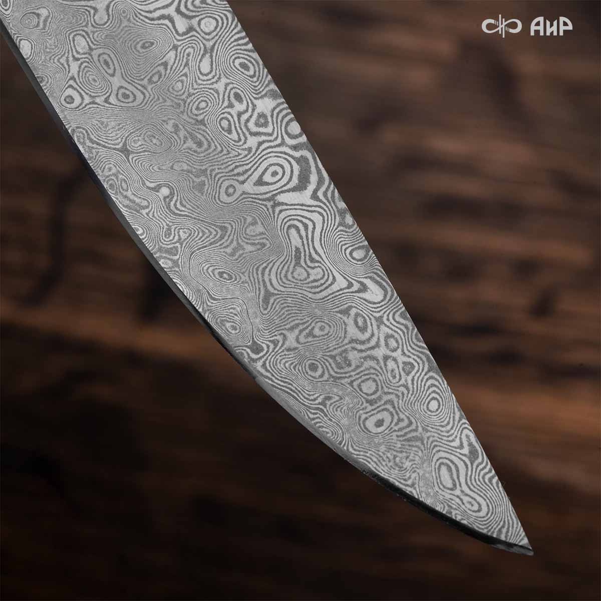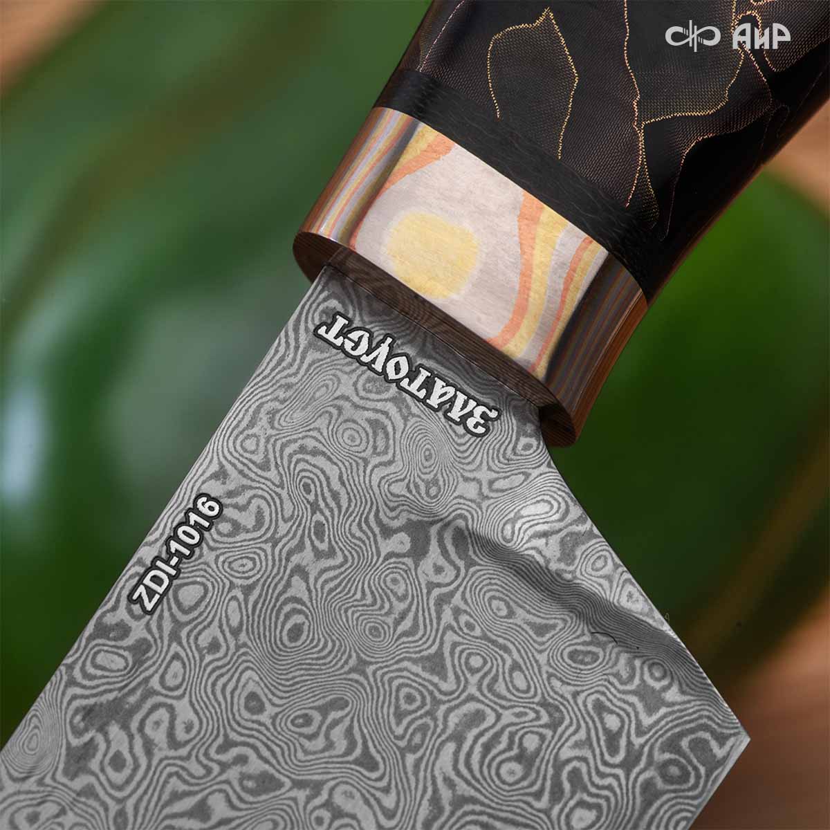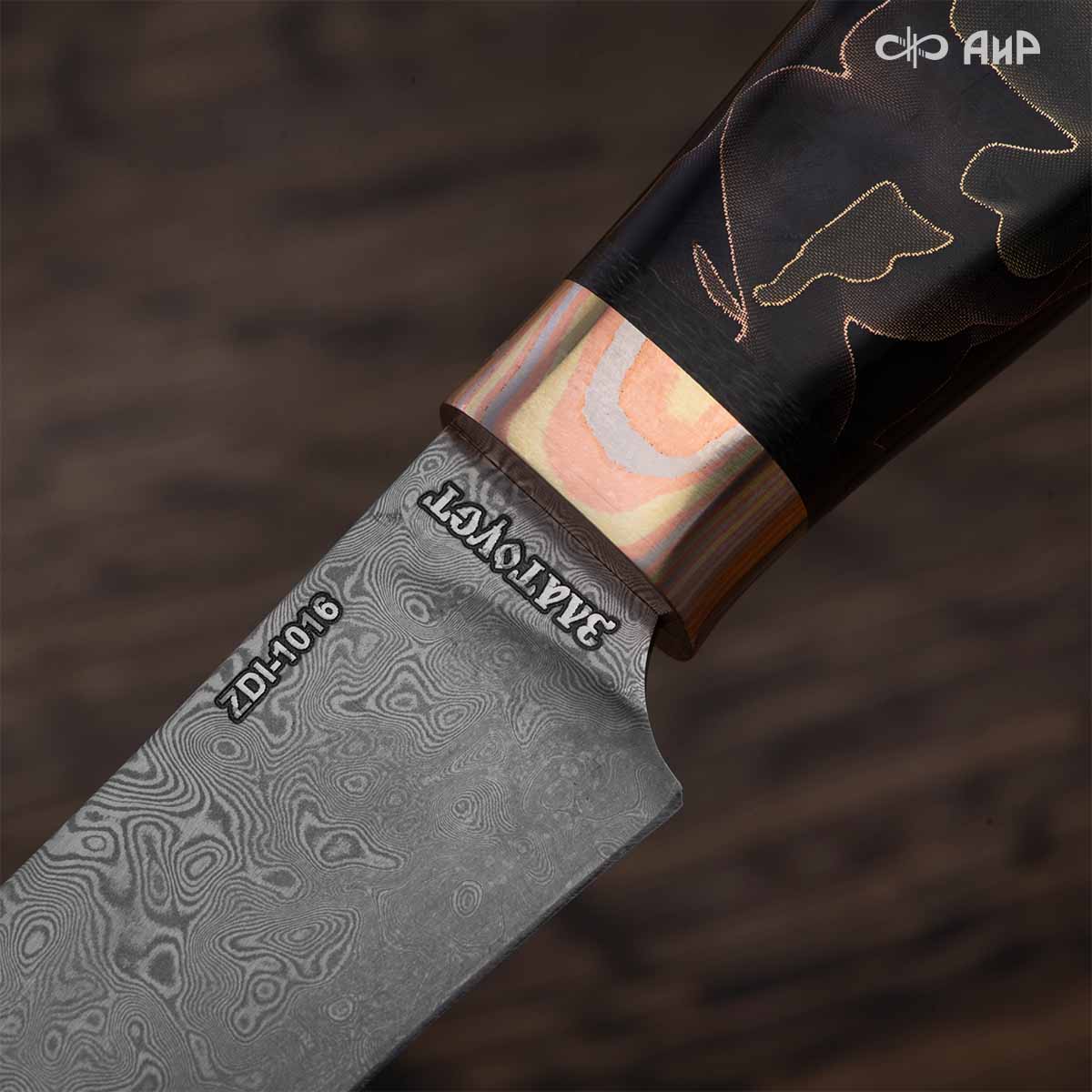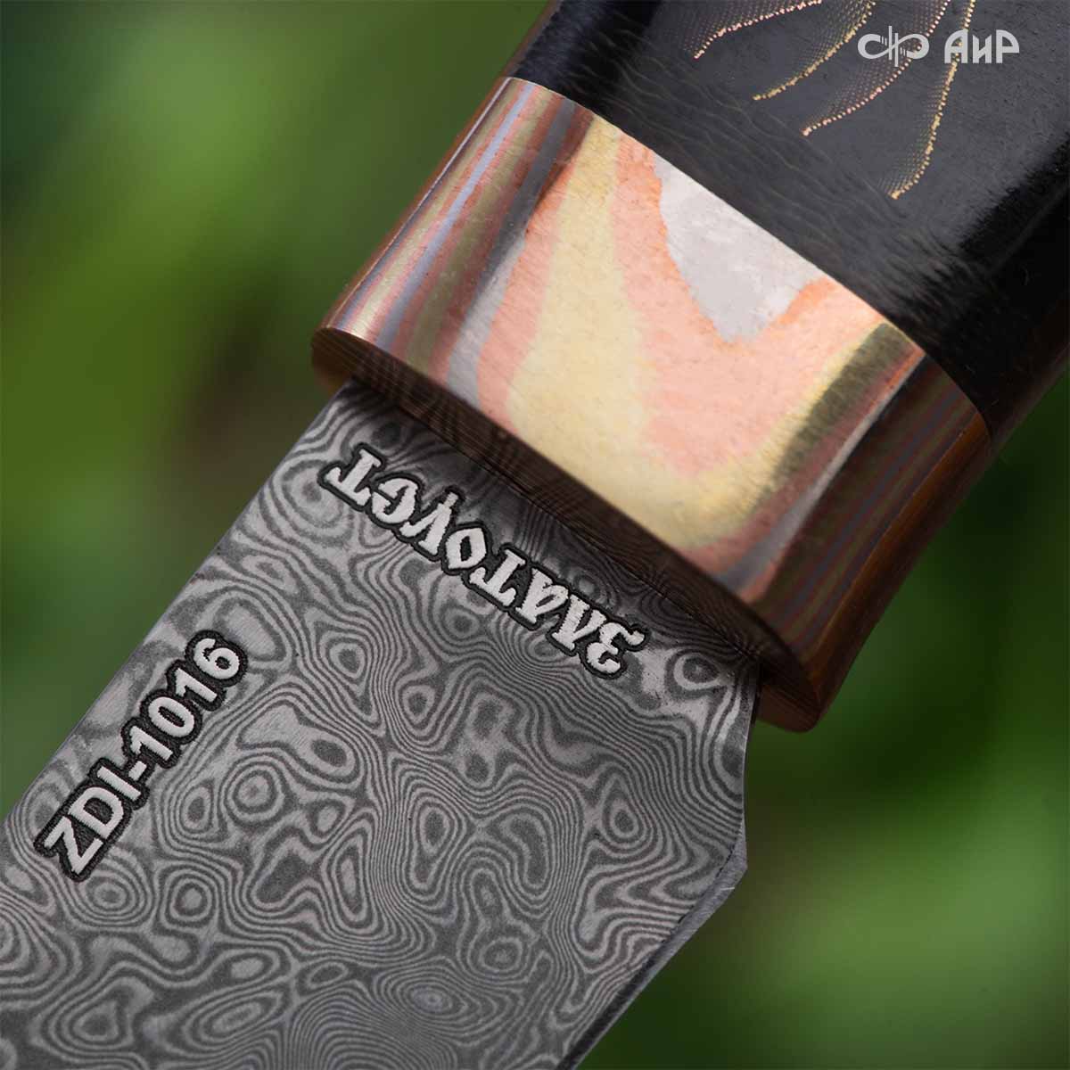 Клинок из атмосферостойкой композиционной (дамасской) стали Zladinox нашего производства. Zladinox (ZLAtoust + Damast + INOX - adable) – под таким названием продукция Компании «АиР» получила признание на европейском рынке ножовщиков после участия в международных выставках IWA, Macher Messe Solingen, S.I.C.A.C. (Париж).