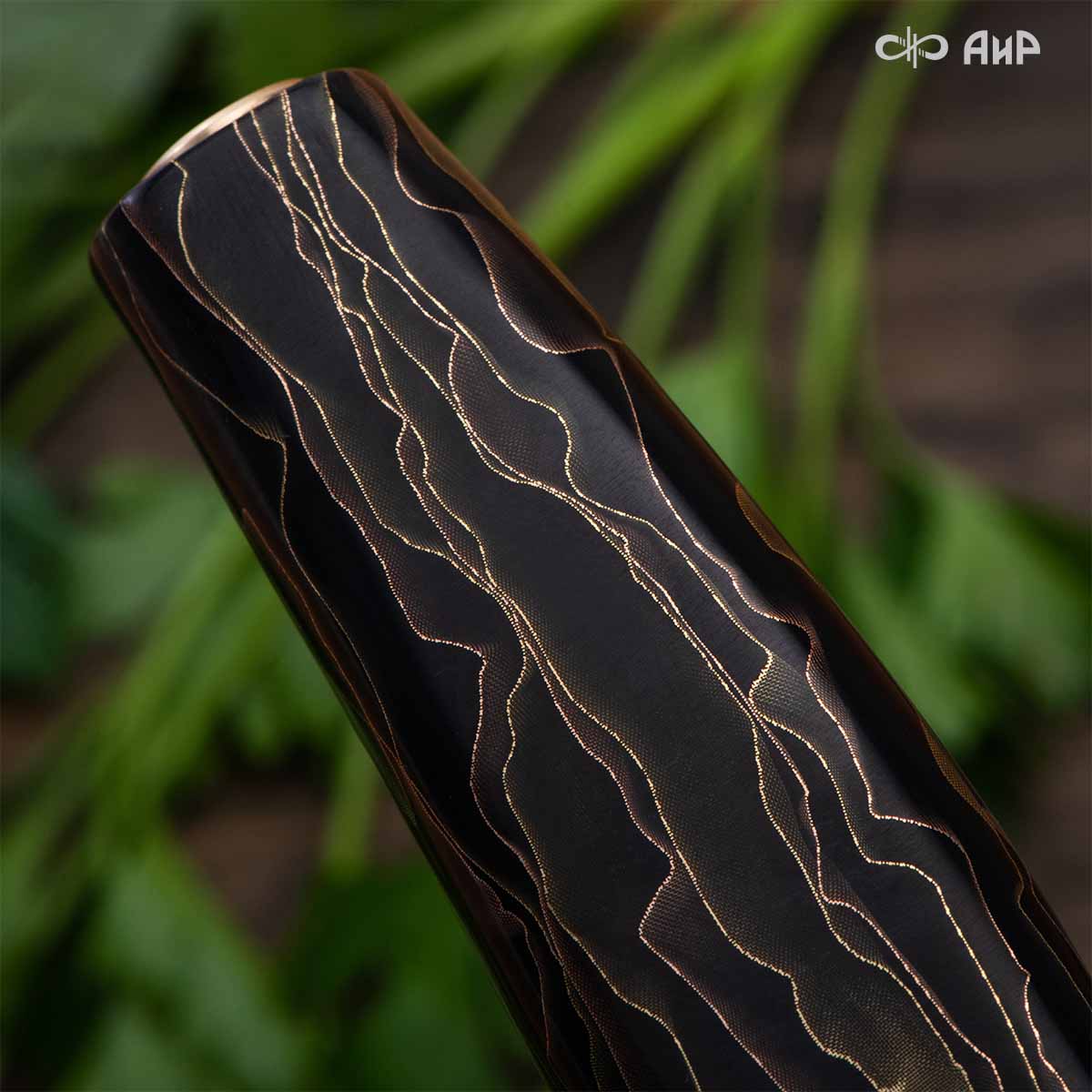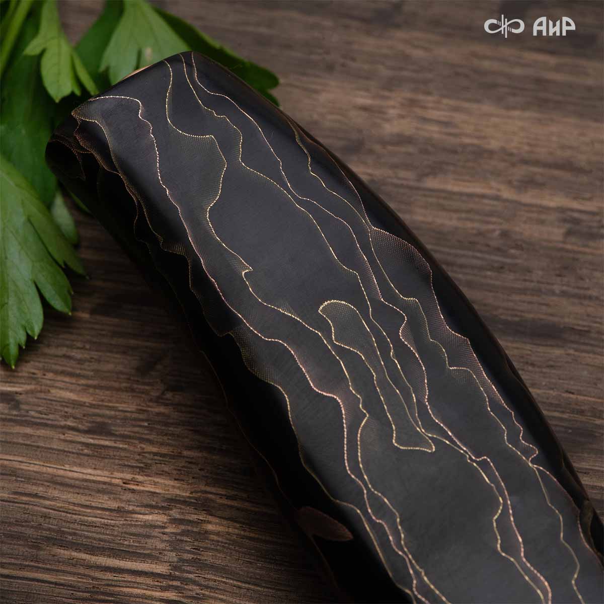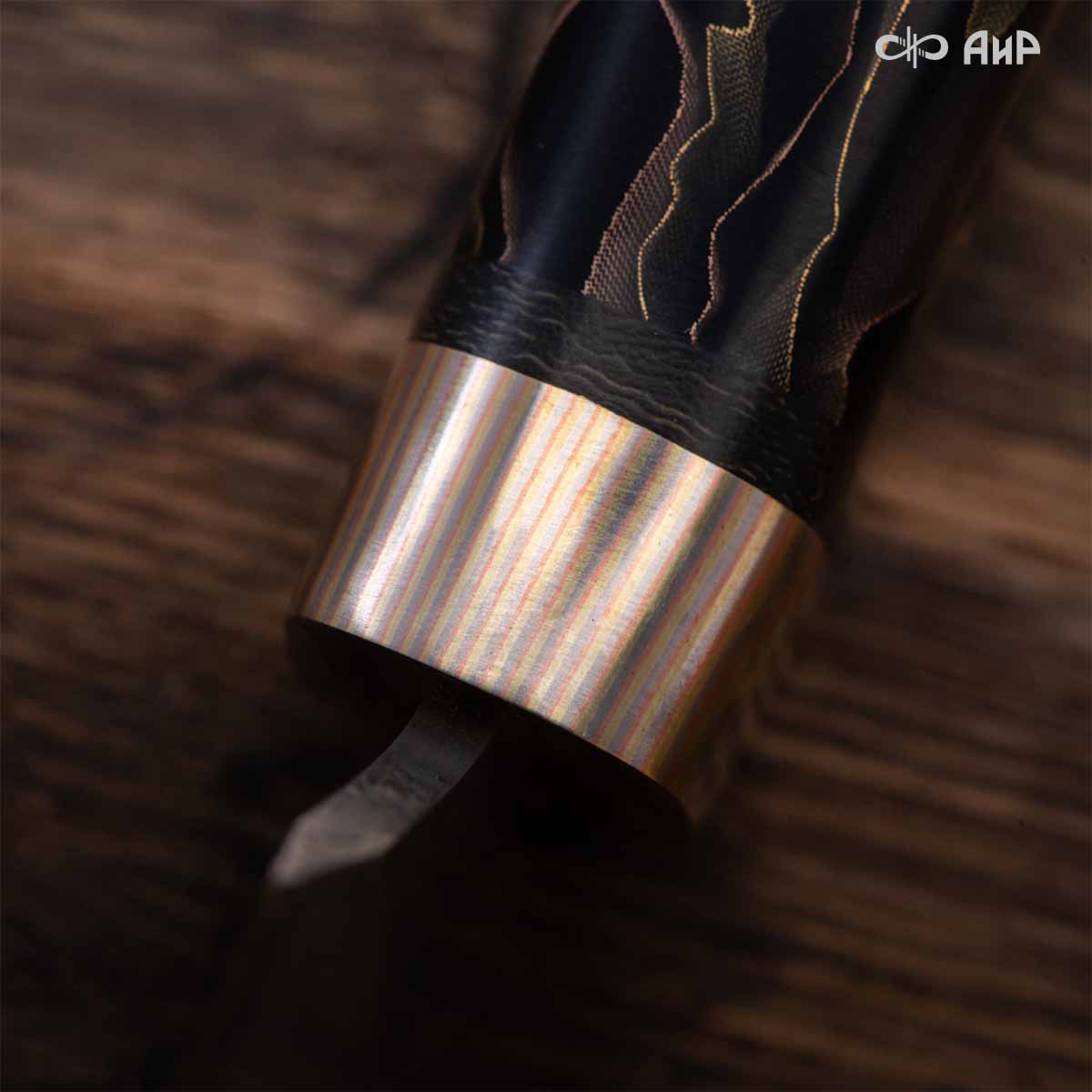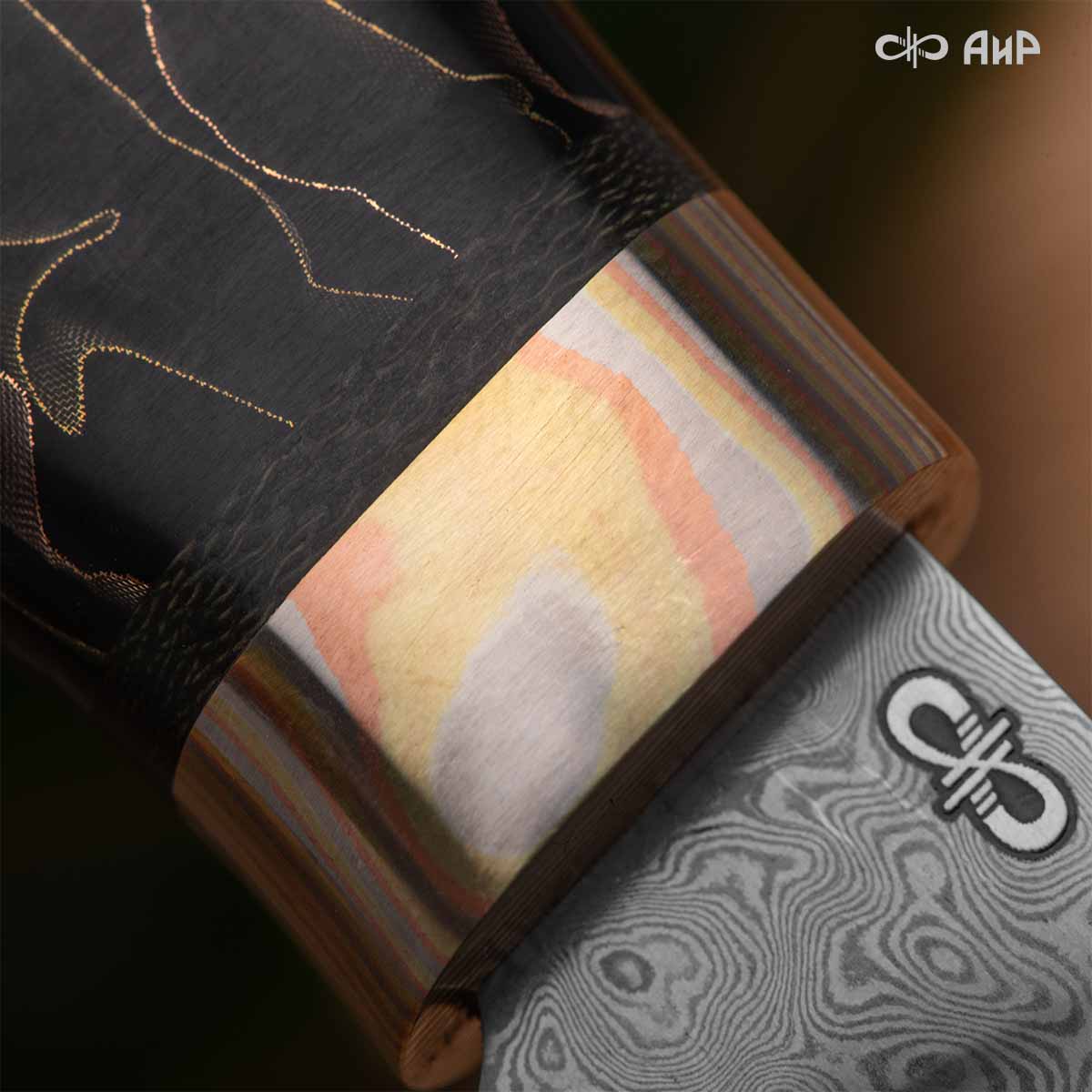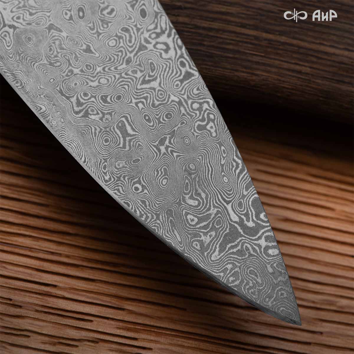 Клинок из атмосферостойкой композиционной (дамасской) стали Zladinox нашего производства. Zladinox (ZLAtoust + Damast + INOX - adable) – под таким названием продукция Компании «АиР» получила признание на европейском рынке ножовщиков после участия в международных выставках IWA, Macher Messe Solingen, S.I.C.A.C. (Париж).