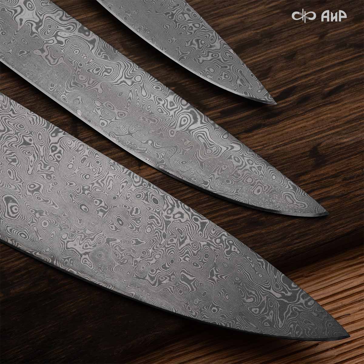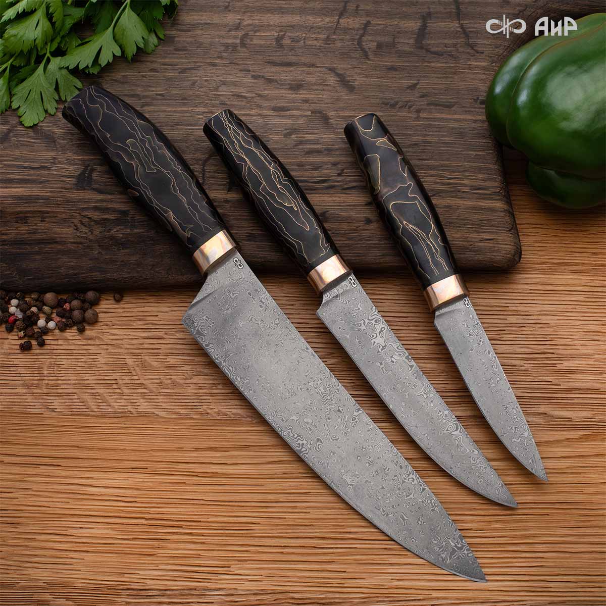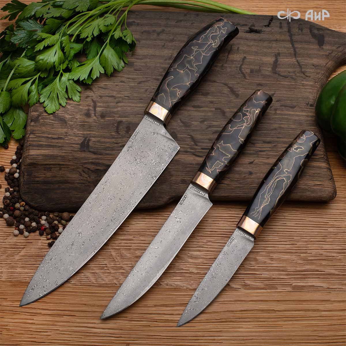 В набор входят следующие ножи: нож "Поварской", нож "Овощной" и нож "Овощной малый". Кастомная заточка
