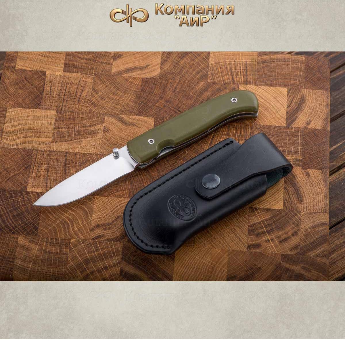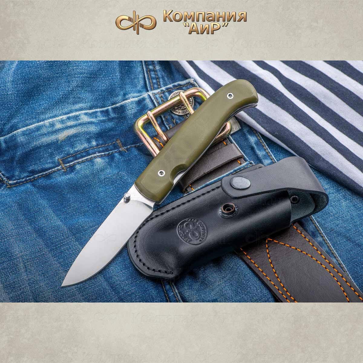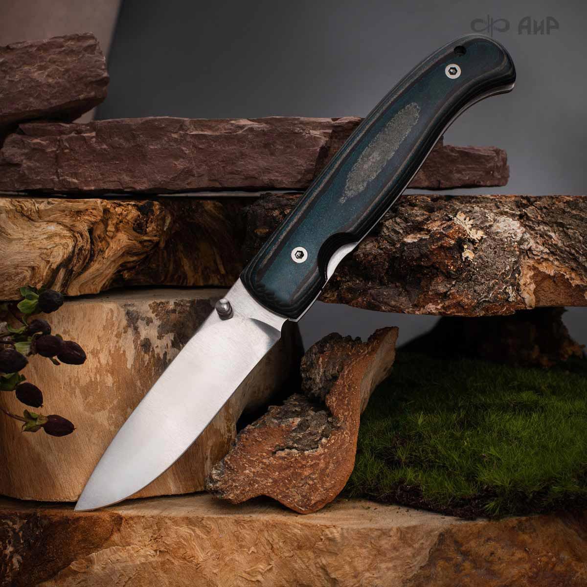 Складной нож с фиксатором удобен для повседневного ношения и использования. Клинок с прямыми спусками от обуха. Классический ручной механизм раскрытия/складывания лезвия имеет жесткий пружинный фиксатор. Монтаж рукояти накладной. Болты, стягивающие накладки рукояти, открыты, не спрятаны пинами, при необходимости их можно раскрутить и собрать заново. Довольно длинная рукоять удобно лежит в любой, даже крупной, ладони. Клеймо с логотипом «АиР» нанесено на обух, а не на традиционную пяту клинка ножа. За счет крайне надежного фиксатора такой складной нож прослужит долго и верно.