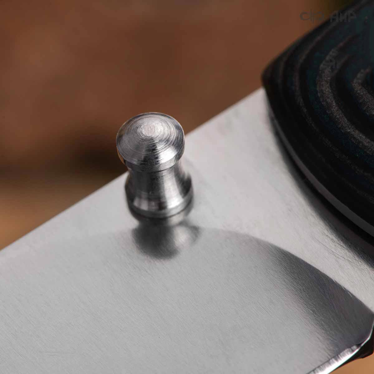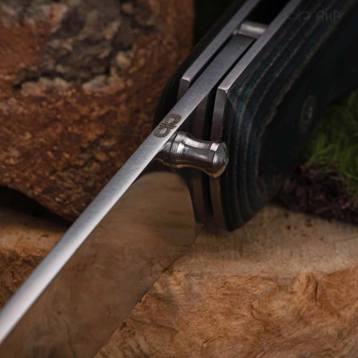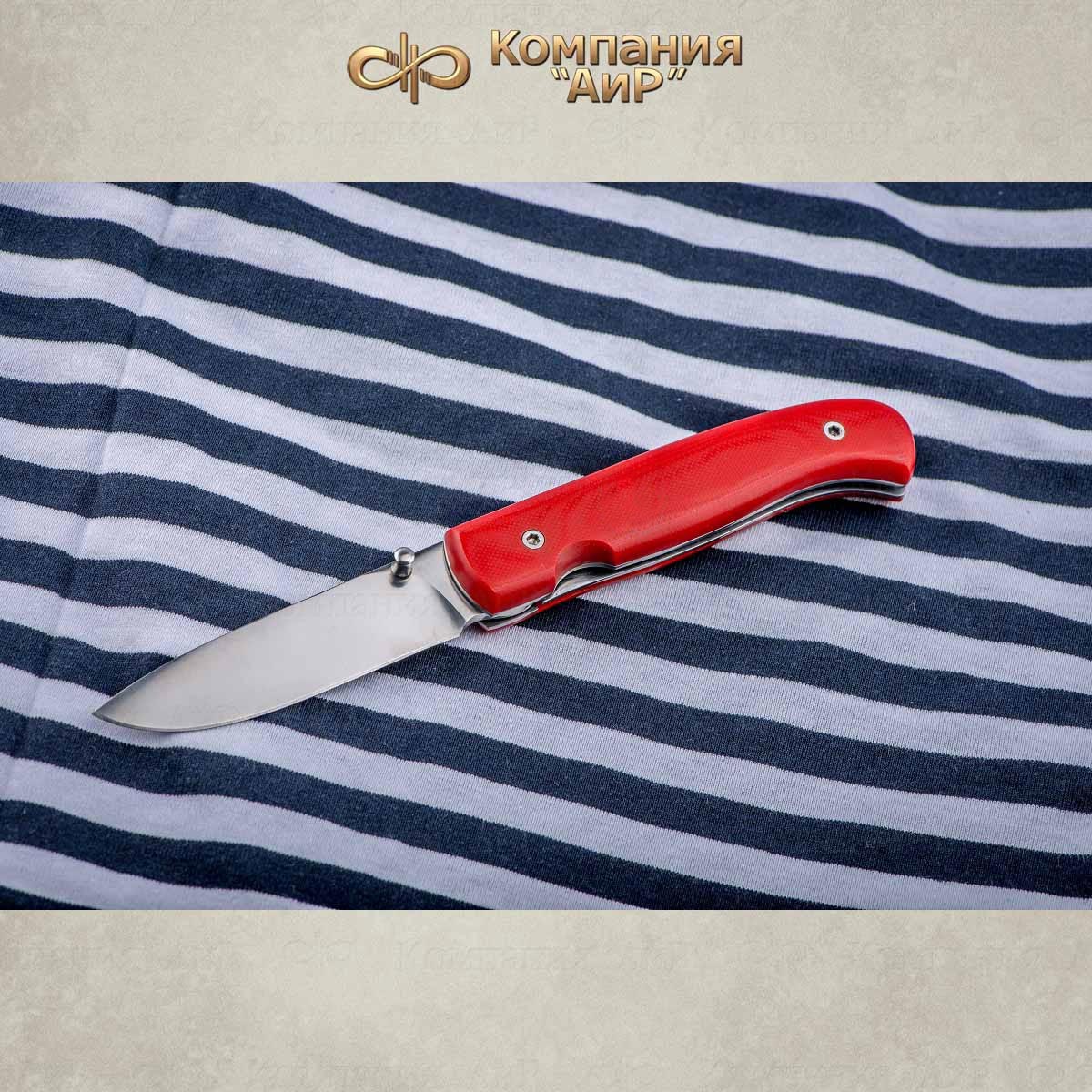 Складной нож с фиксатором удобен для повседневного ношения и использования. Клинок с прямыми спусками от обуха. Классический ручной механизм раскрытия/складывания лезвия имеет жесткий пружинный фиксатор. Монтаж рукояти накладной. Болты, стягивающие накладки рукояти, открыты, не спрятаны пинами, при необходимости их можно раскрутить и собрать заново. Довольно длинная рукоять удобно лежит в любой, даже крупной, ладони. Клеймо с логотипом «АиР» нанесено на обух, а не на традиционную пяту клинка ножа. За счет крайне надежного фиксатора такой складной нож прослужит долго и верно.