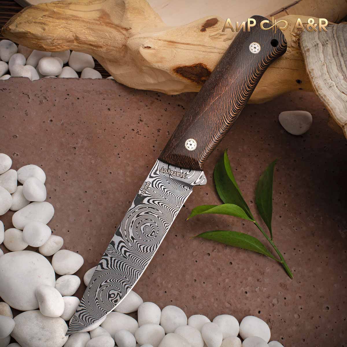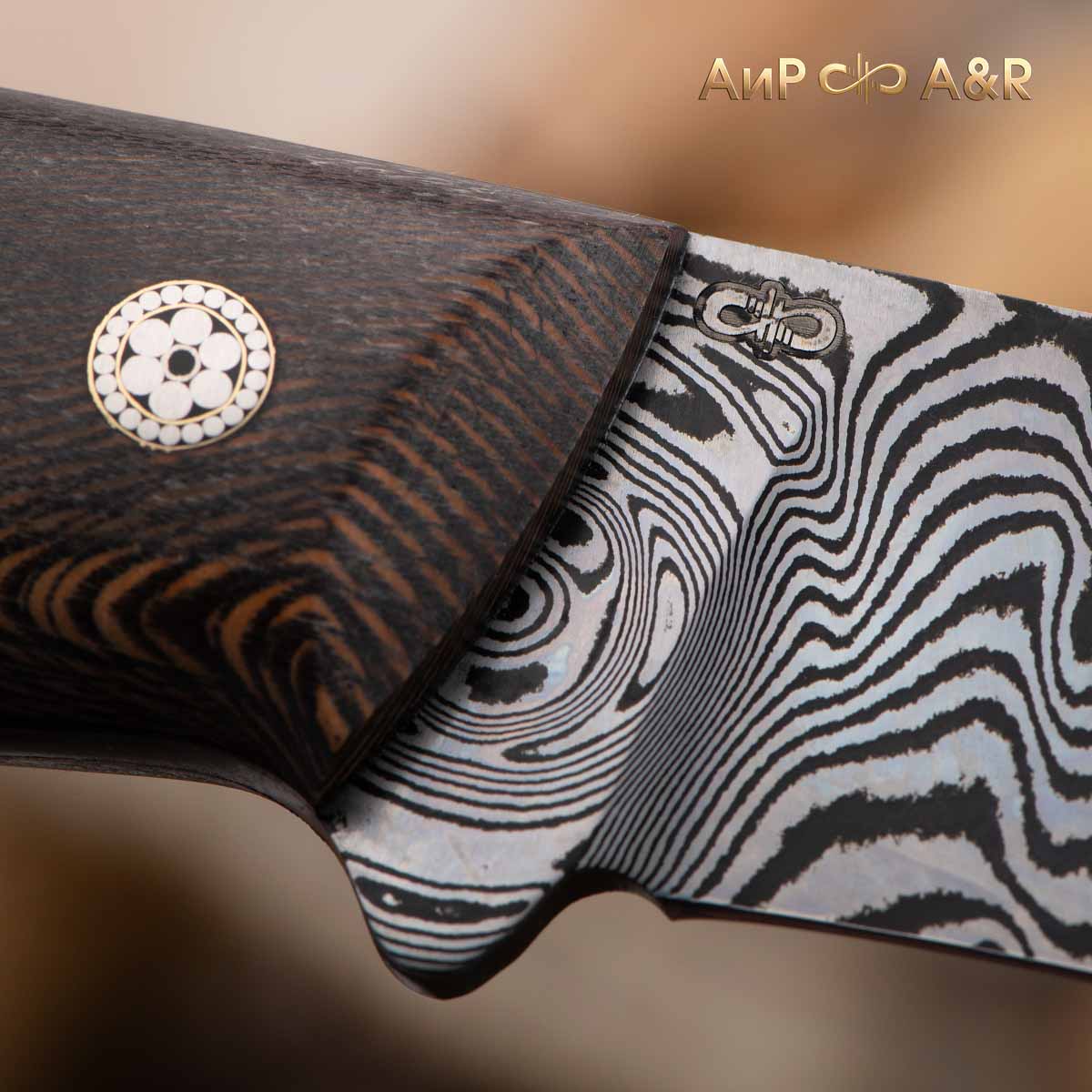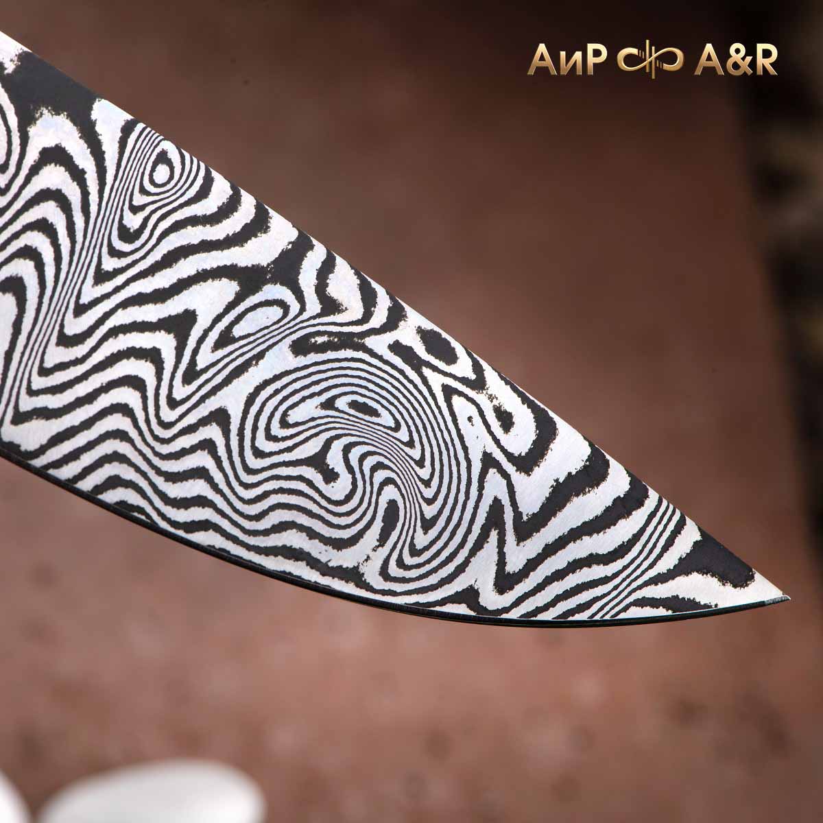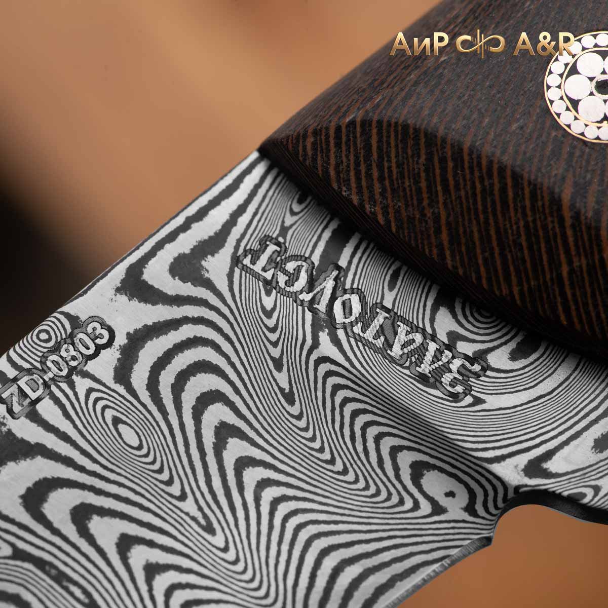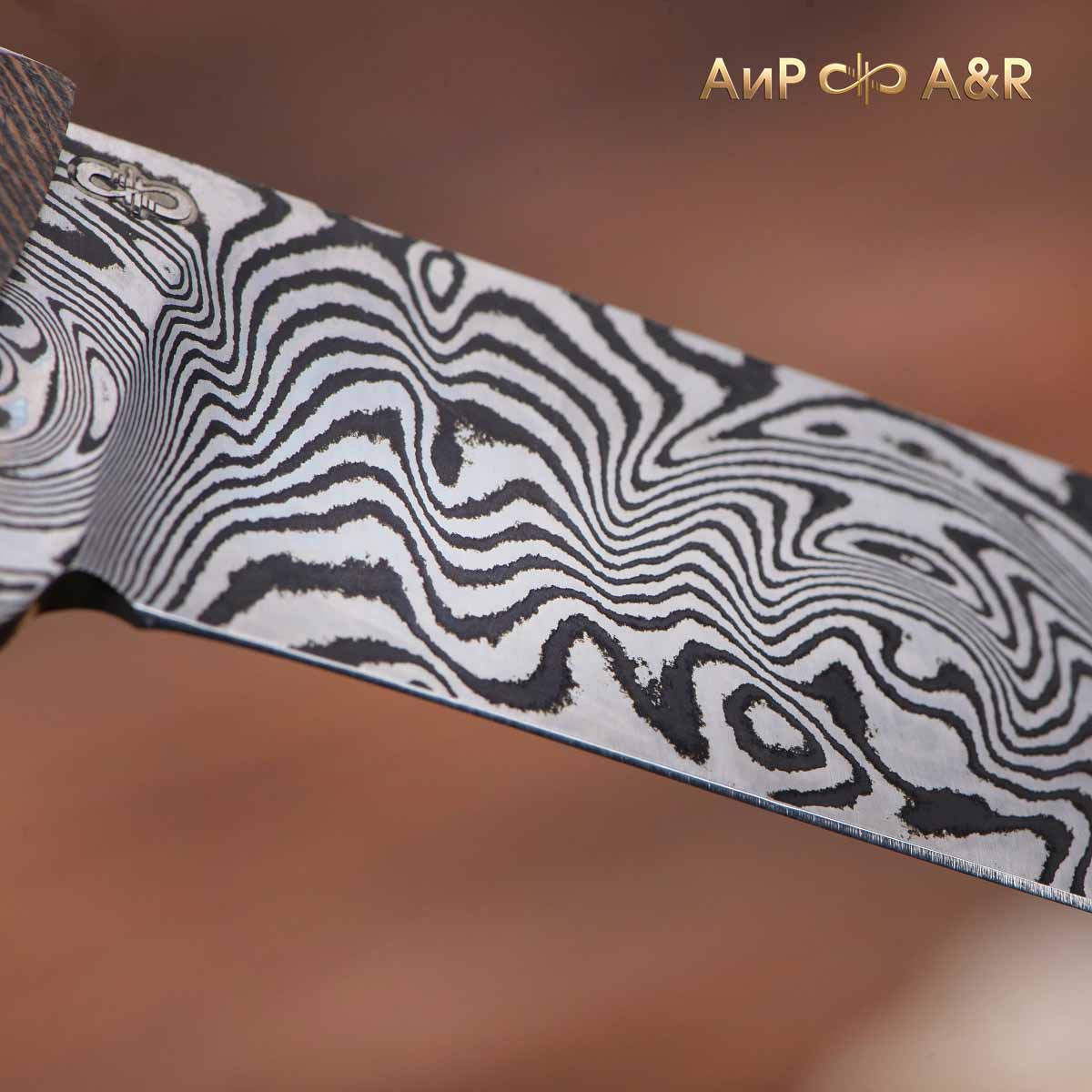 Клинок из композиционной (дамасской) стали производства Компании "АиР" ZD-0803 (ZLAtoust+Damast, 08 – среднее содержание углерода 0,8%, 03 – среднее содержание легирующих элементов (хром, никель, молибден, ванадий и т.д.).