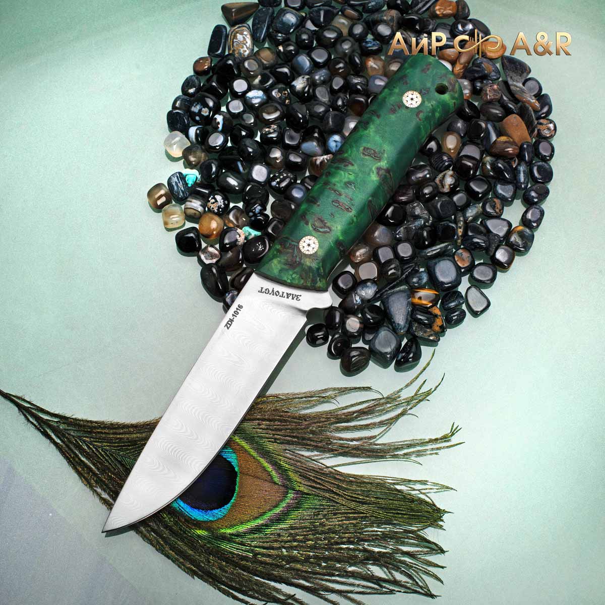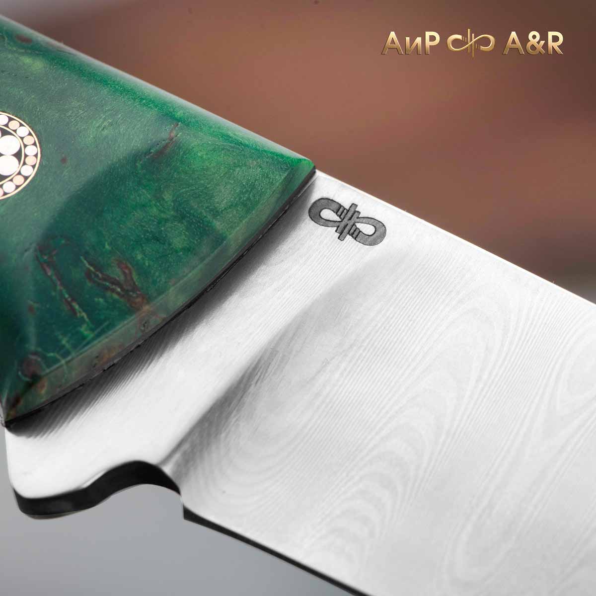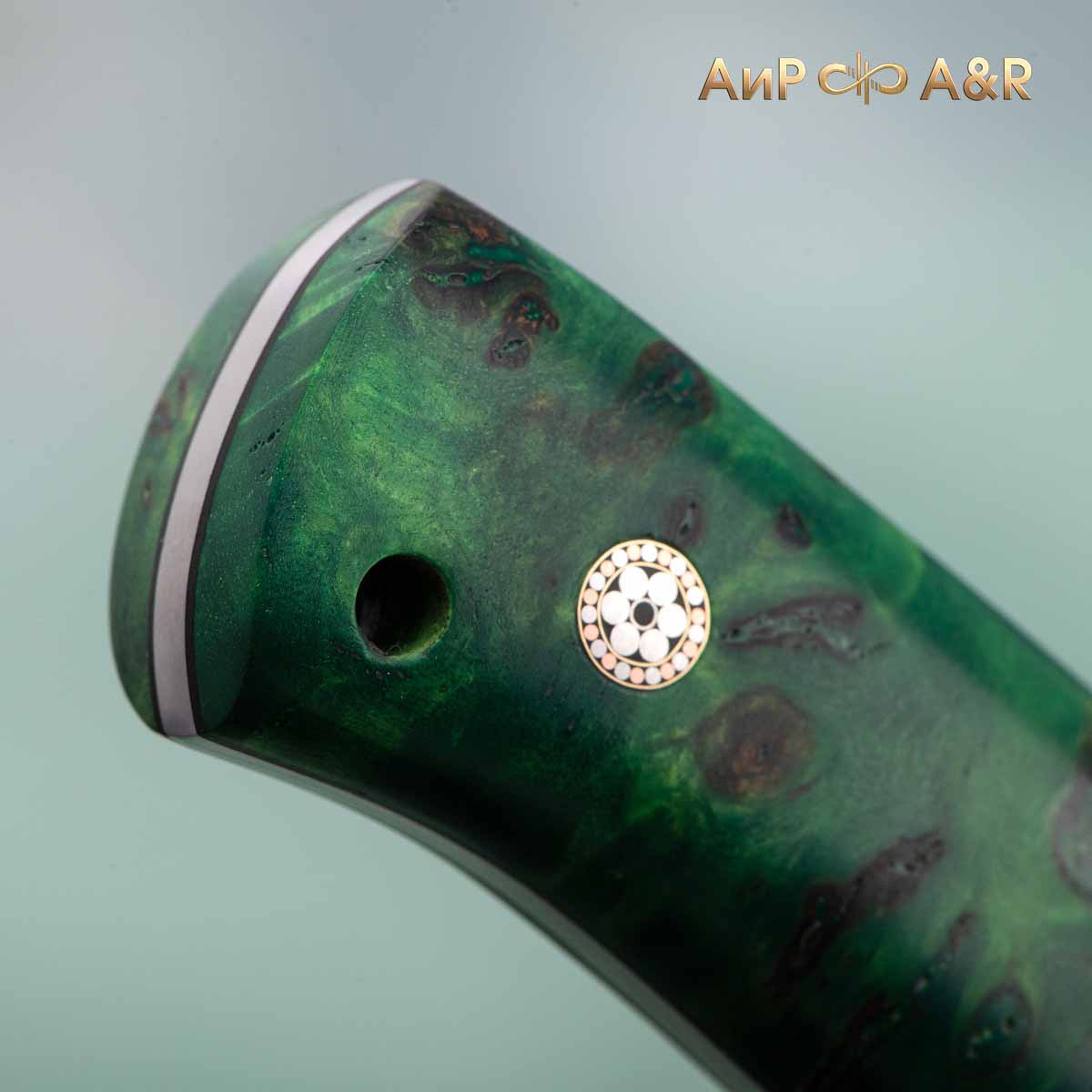 Стриж (стабилизированный кап тополя зеленый, фибра, мозаичные пины) дамасская сталь ZDI-1016, узор ступени