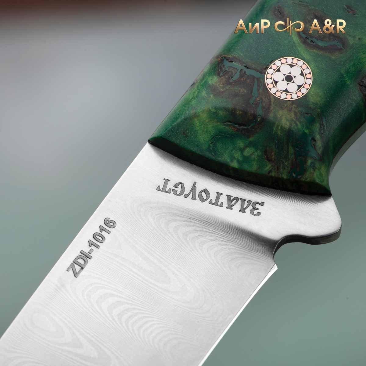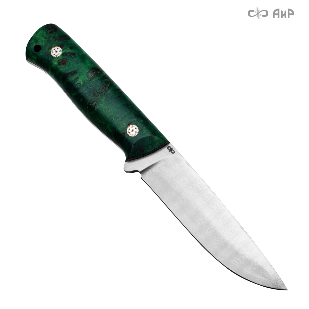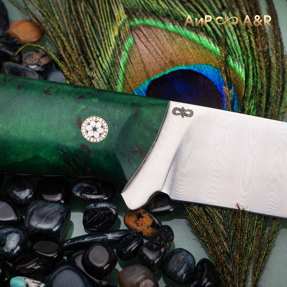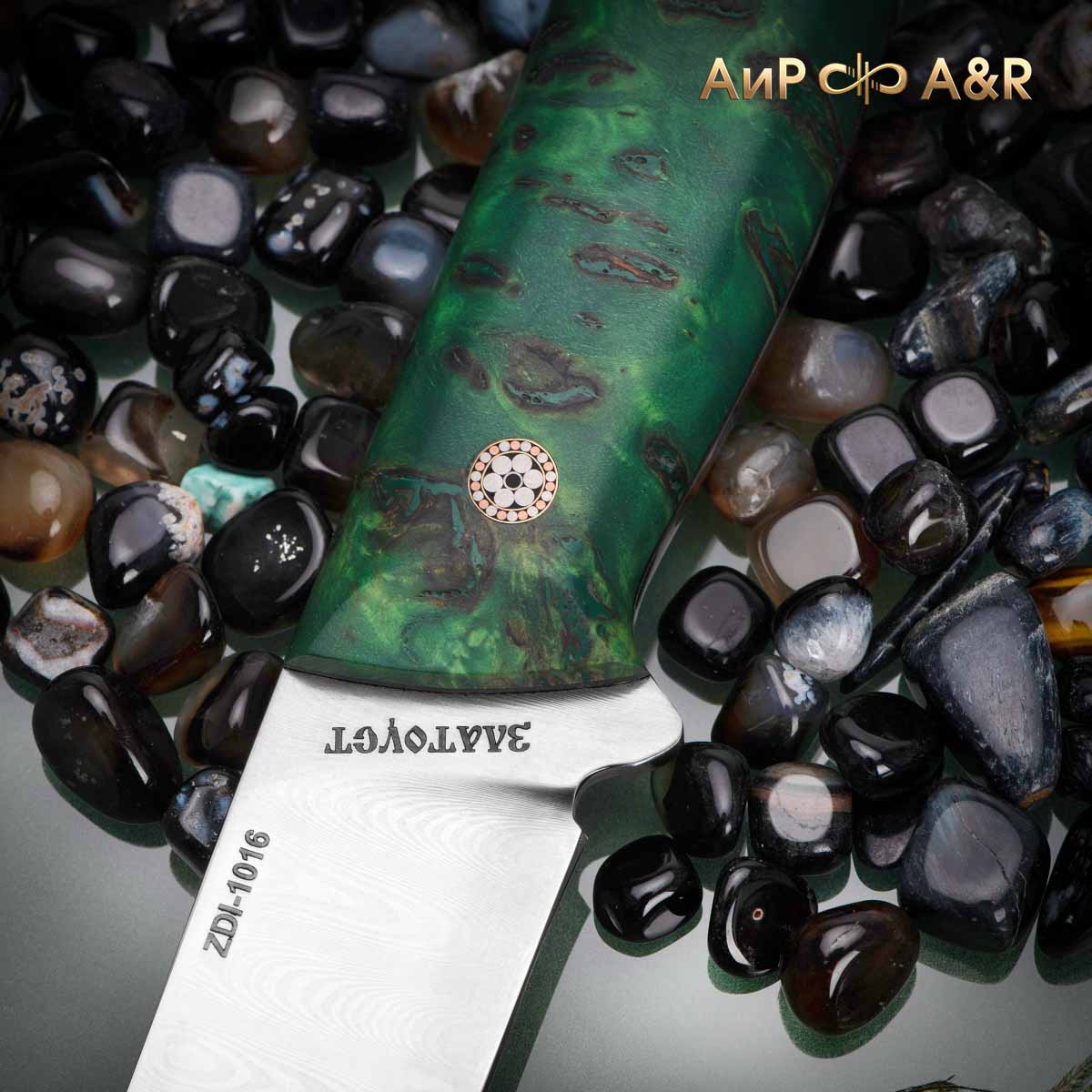 Стриж (стабилизированный кап тополя зеленый, фибра, мозаичные пины) дамасская сталь ZDI-1016, узор ступени