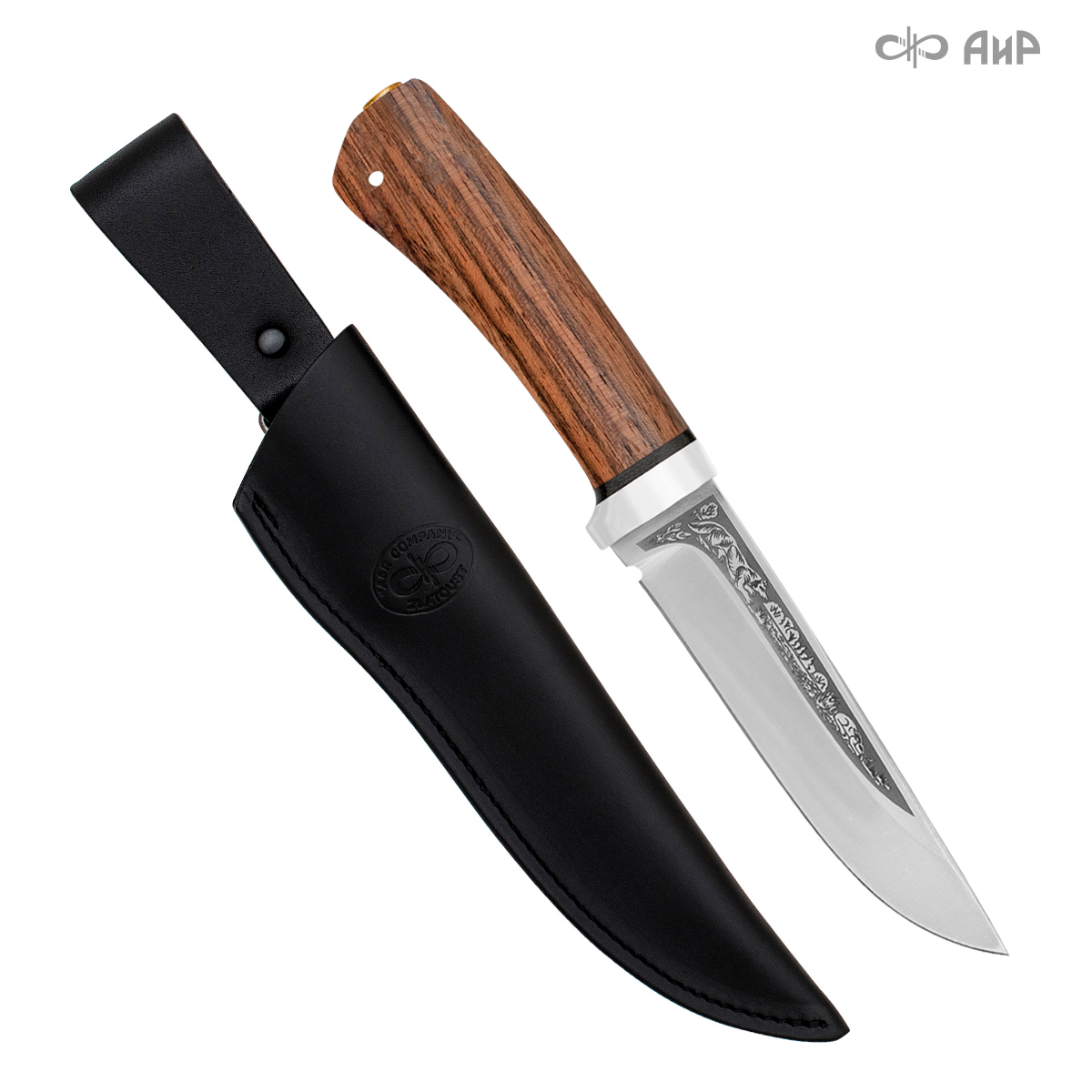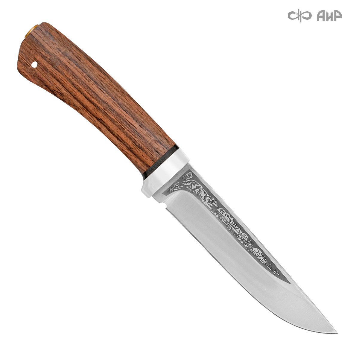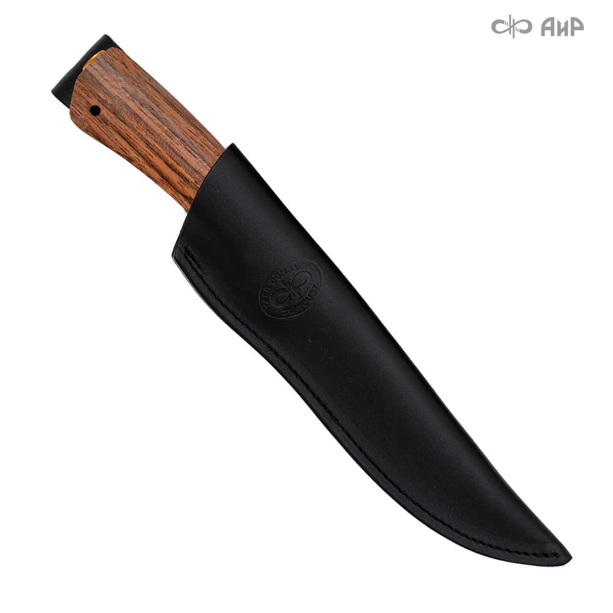 Сравнительно небольшой, универсальный, легкий и прочный нож с клинком, имеющим чуть приспущенный к острию обушок. Спуски в виде линзы на большую часть ширины клинка образуют тонкое, изумительно режущее лезвие. Толщина обуха в 2,6 мм позволяет оставить приличную голомень, что придает ему дополнительную прочность. Рукоятка имеет эргономичную форму, что позволяет пользоваться ножом человеку с любым размером ладони. Гарда умеренной величины защищает пальцы при резе. Монтаж рукояти сквозной, неразборный. На навершии рукояти имеется отверстие под темляк. Великолепное решение для тех, кто любит проводить время на природе и вдали от городской суеты. Пользуется неизменной популярностью у покупателей.