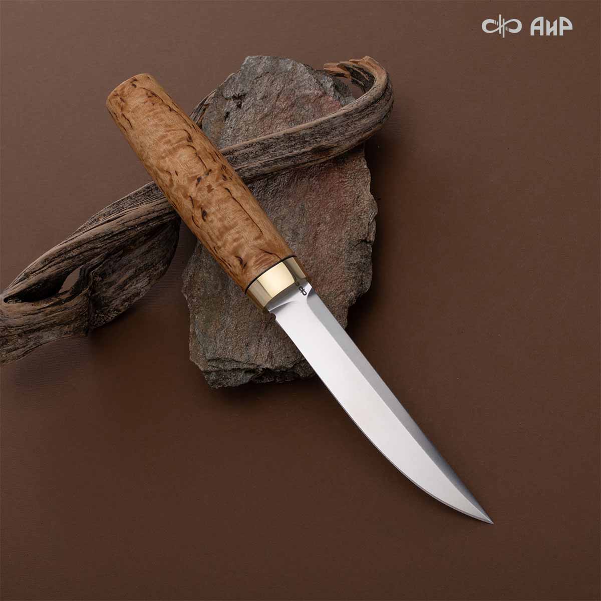 Нож «Финка Сканди» представляет собой современное воплощение традиционной для скандинавских народов формы финского ножа, который будет верным помощником человеку в любых его начинаниях. Высокие спуски клинка придают ему отличные режущие характеристики, при этом проникающие свойства остаются на высоте из-за прекрасной геометрии клинка. Удобная рукоять, имеющая многовековой опыт использования ее народами Севера, прекрасно подходит под любую руку. При этом используется очень надежный сквозной монтаж рукояти.