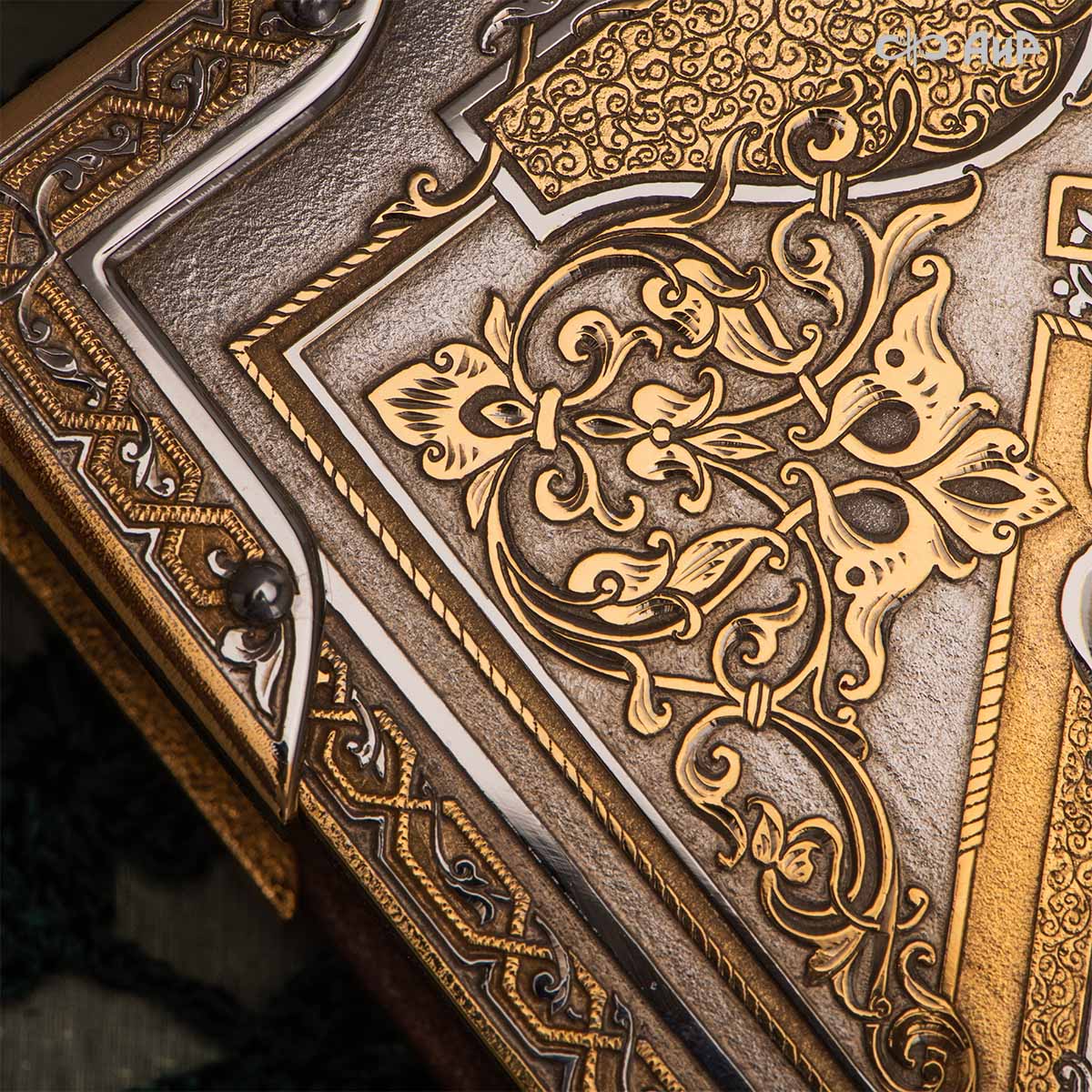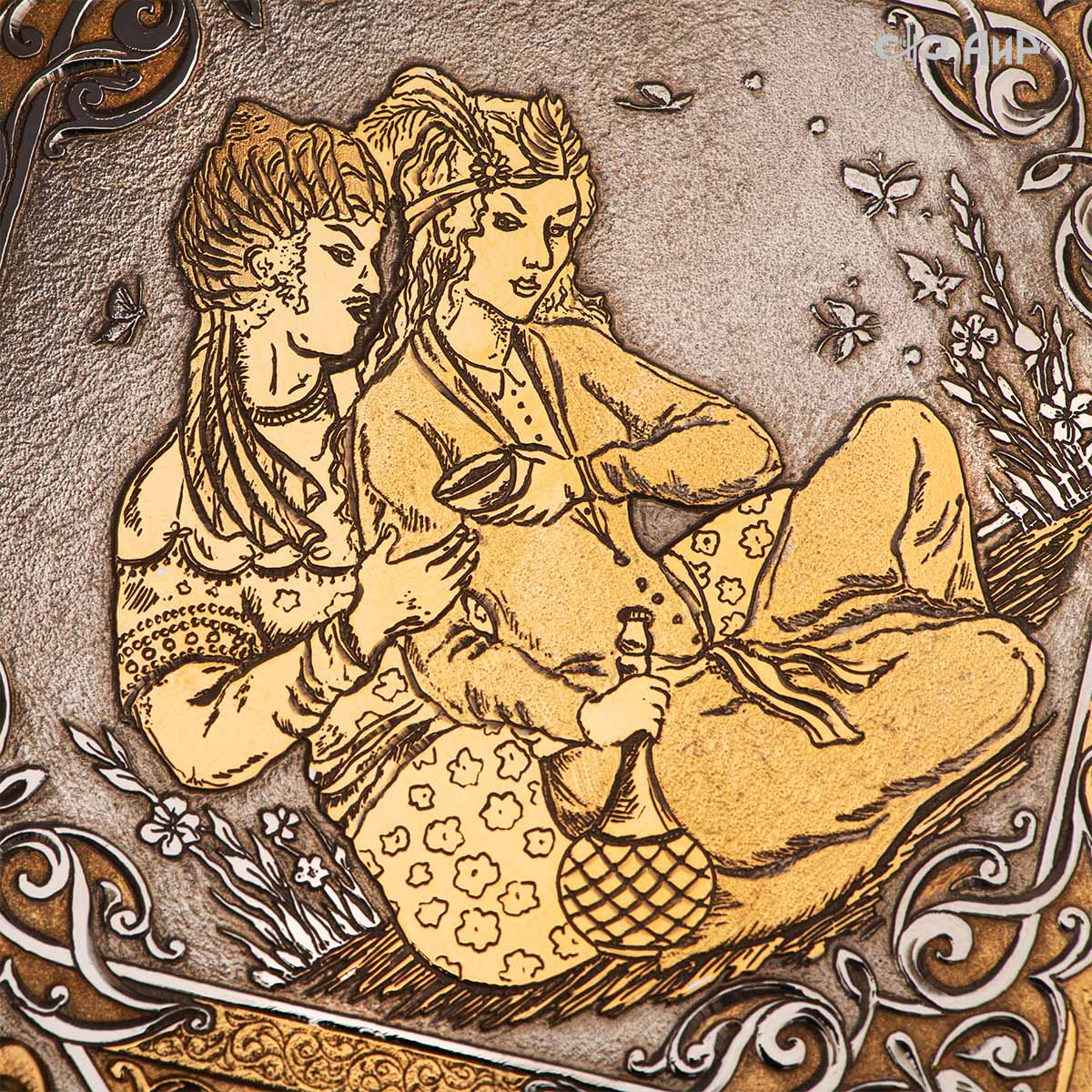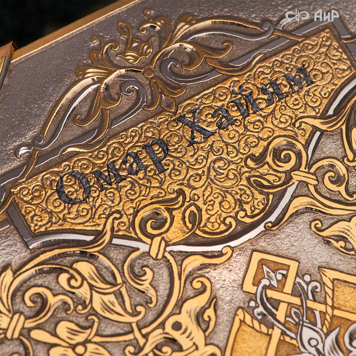 Оклад для книги «Омар Хайям. Рубаи» изготовлен в стиле златоустовской гравюры на металле, покрыт золотом высшей пробы, украшен ювелирными камнями. Техника исполнения: многоступенчатый цикл нанесения художественной гравюры: травление, гравирование, золочение, никелирование. Покрытия позволяют получить практически не подверженные влиянию времени высокохудожественные изделия.