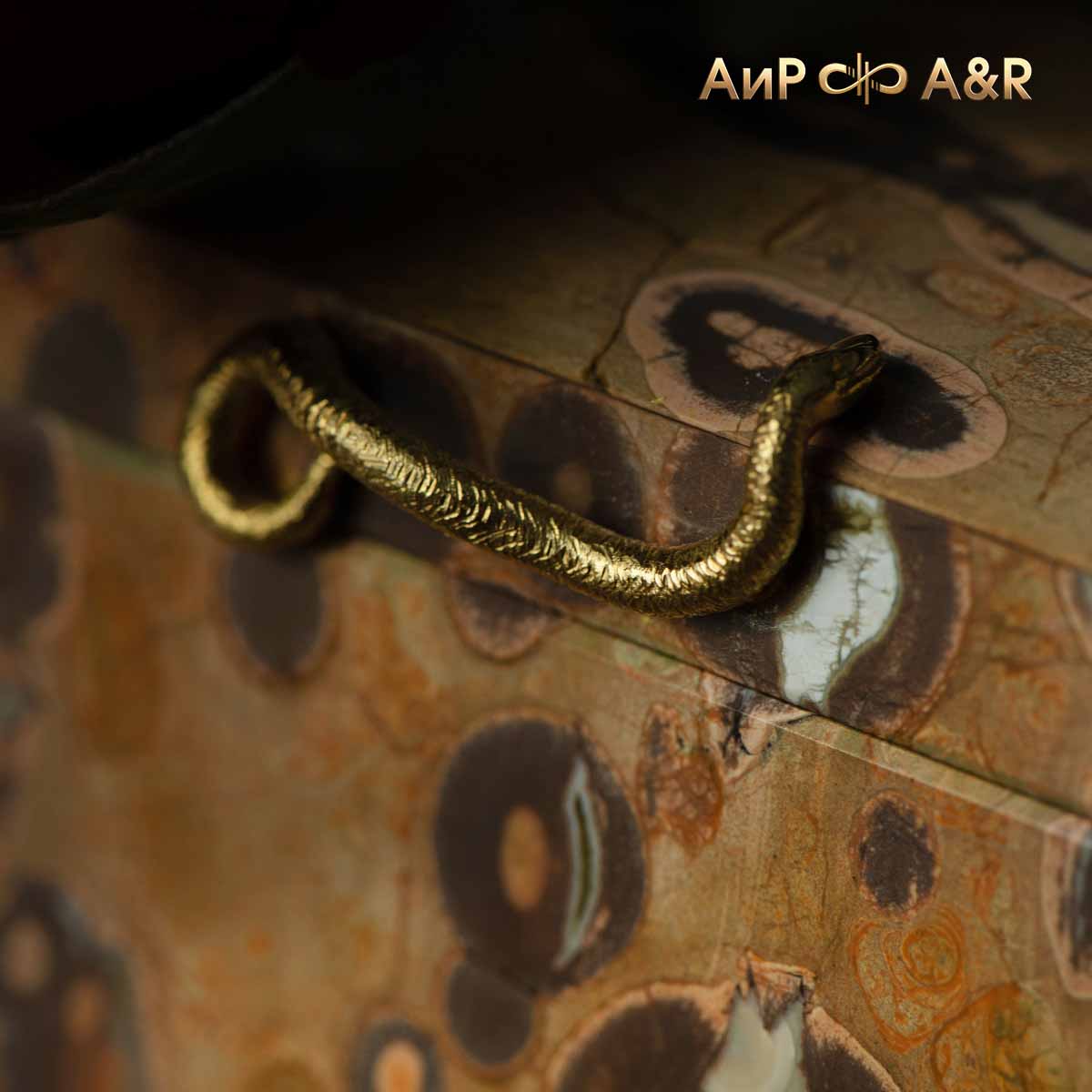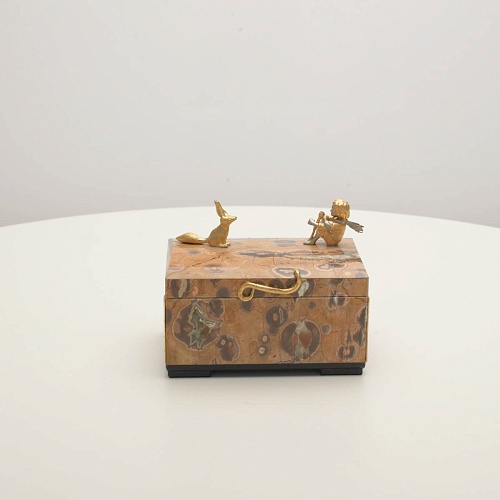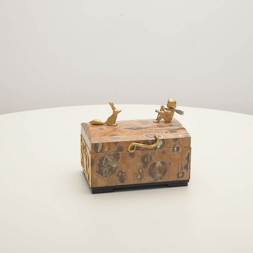 Шкатулка изготовлена из риолита редкой красоты. Боковые стороны шкатулки украшены декоративными накладками в стиле златоустовской гравюры на металле. С особым изяществом исполнены фигурки Маленького принца с розой, лиса и змеи. Элементы шкатулки покрыты золотом и серебром, которые придают всему изделию элегантный вид.