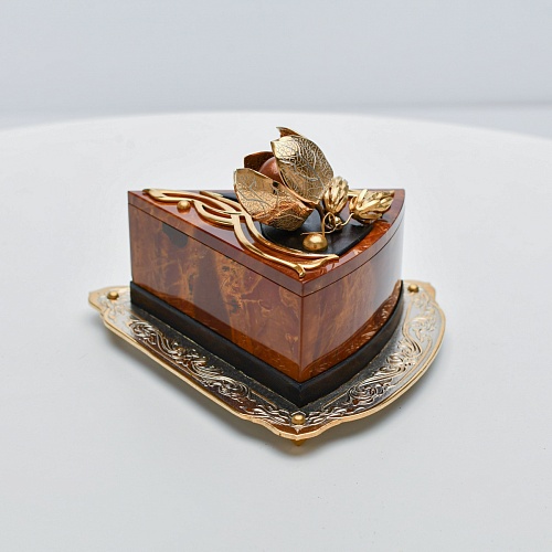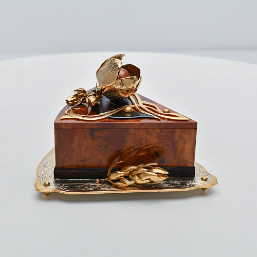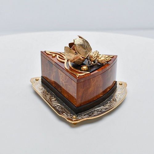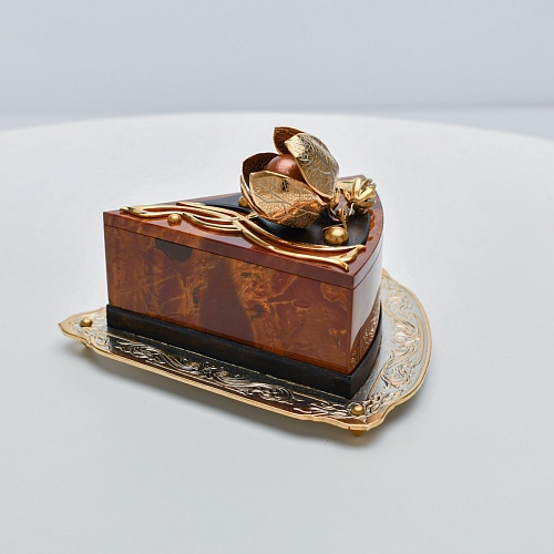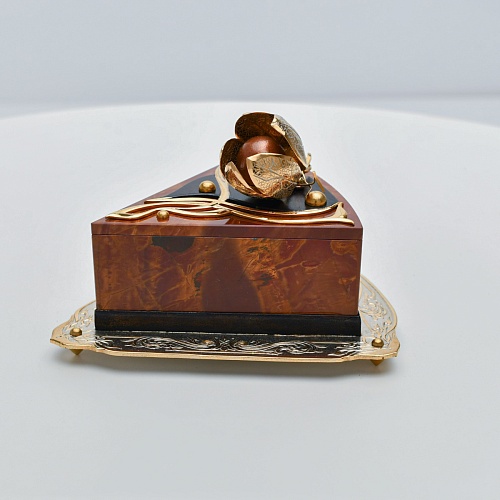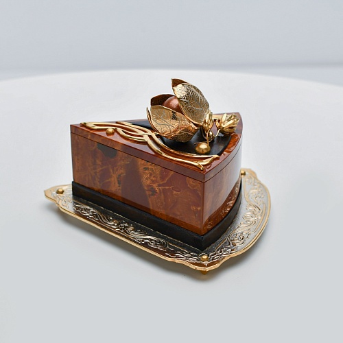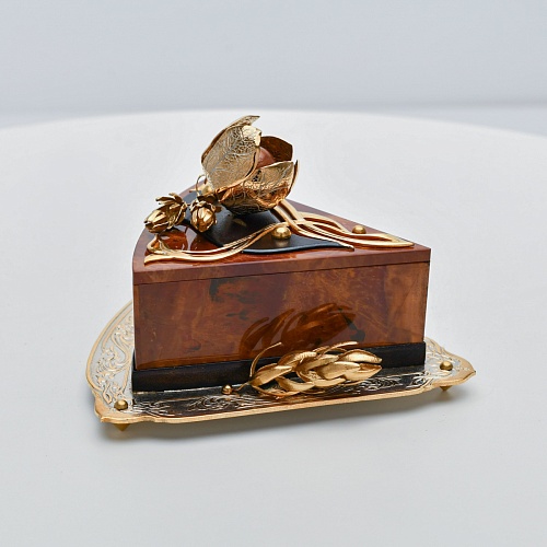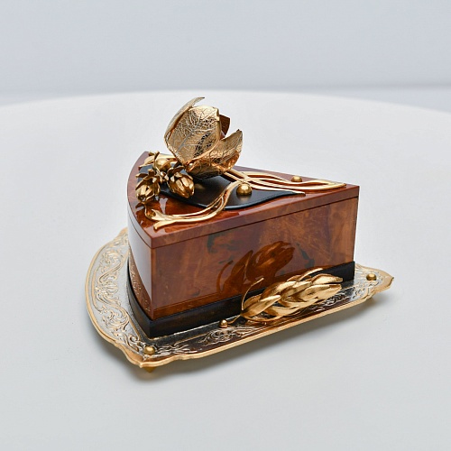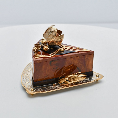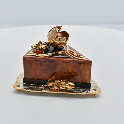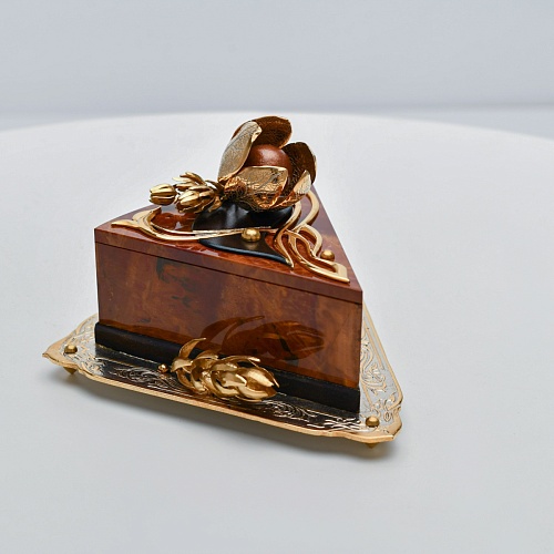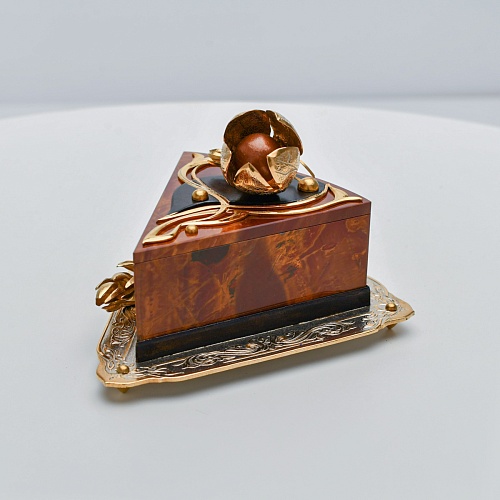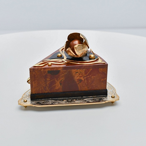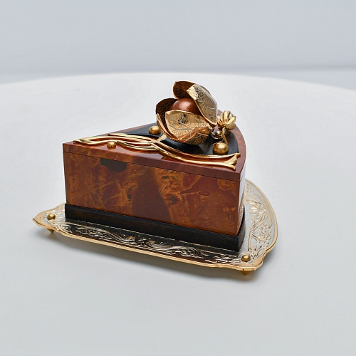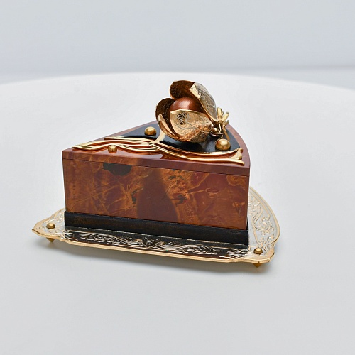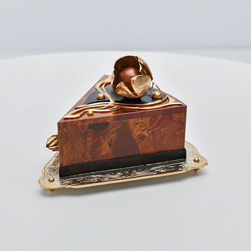 Шкатулка изготовлена из уральской яшмы насыщенных красок. Выполнена в форме кусочка торта на блюдце. Ягода физалиса служит стилизованной ручкой для съемной крышки. Подставка и крышка шкатулки украшены накладками в стиле златоустовской гравюры на металле. Элементы шкатулки покрыты золотом, которое придает всему изделию элегантный вид.