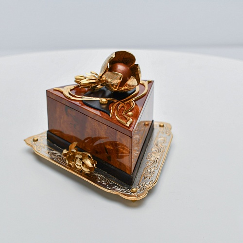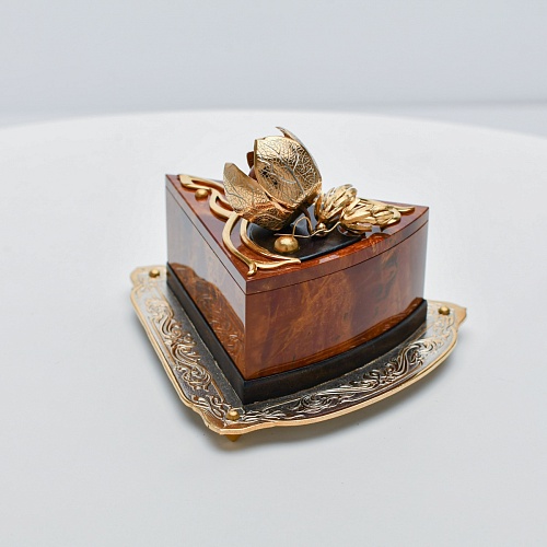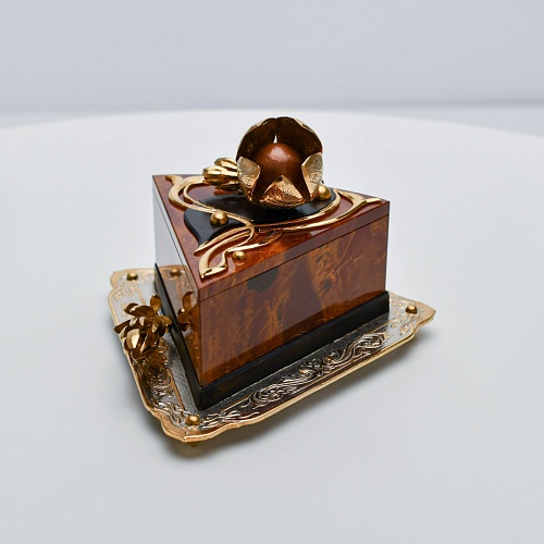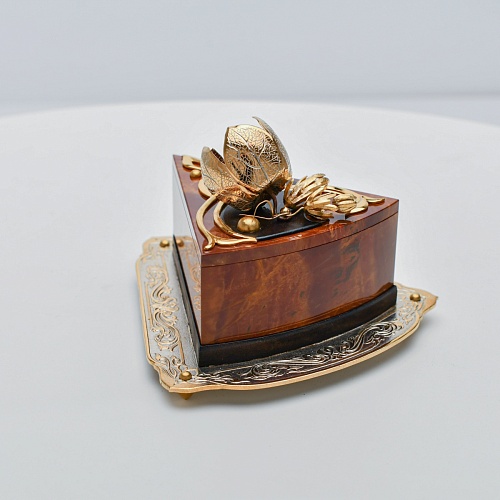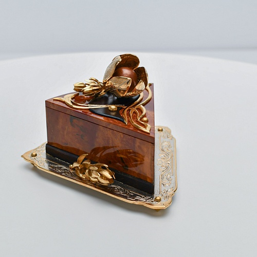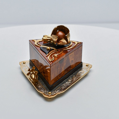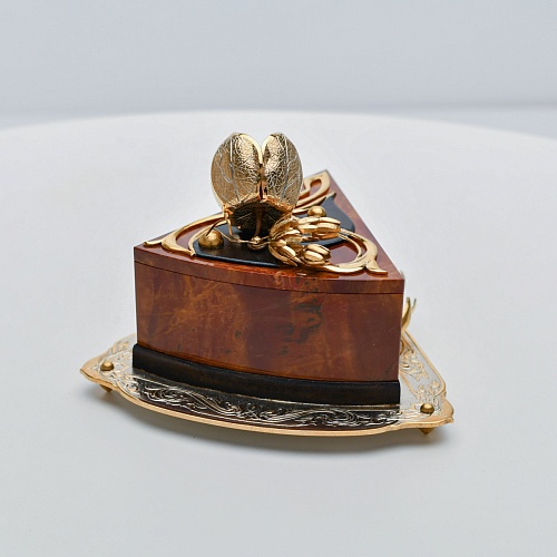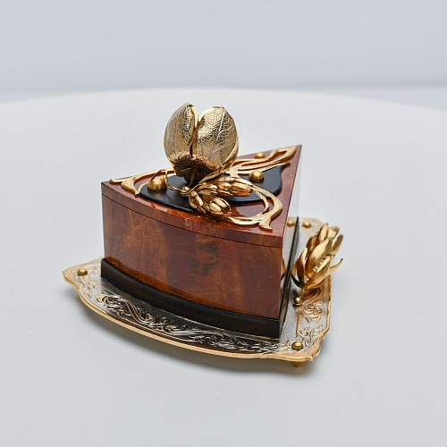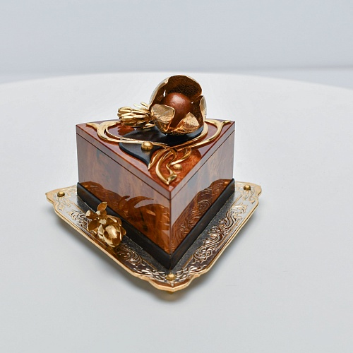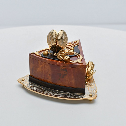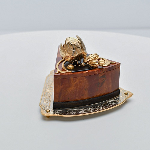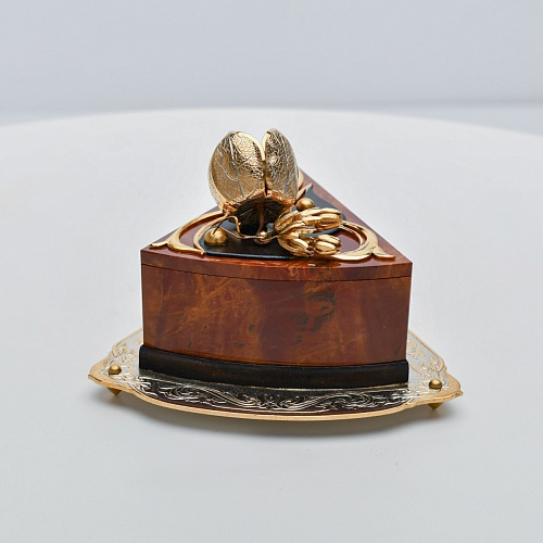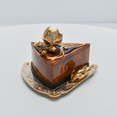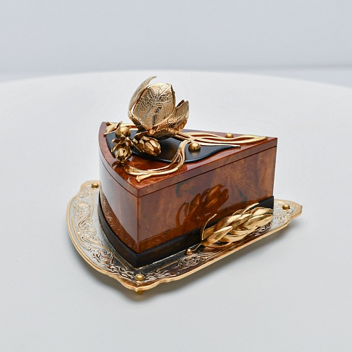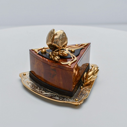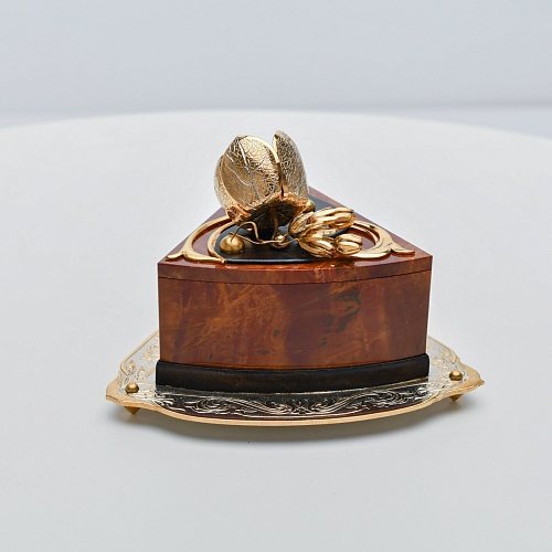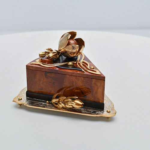 Шкатулка изготовлена из уральской яшмы насыщенных красок. Выполнена в форме кусочка торта на блюдце. Ягода физалиса служит стилизованной ручкой для съемной крышки. Подставка и крышка шкатулки украшены накладками в стиле златоустовской гравюры на металле. Элементы шкатулки покрыты золотом, которое придает всему изделию элегантный вид.