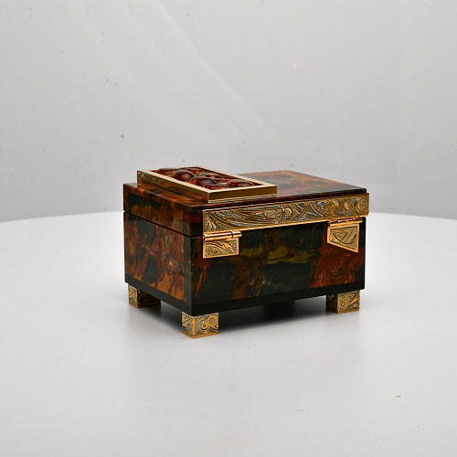 Шкатулка "Энергия солнца" изготовлена из яшмы Пикассо редкой красоты и украшена кабошонами янтаря. Ножки, боковые стороны и крышка шкатулки украшены накладками в стиле златоустовской гравюры на металле. Эта шкатулка хранит тепло рук мастеров, она - как кладовая солнца, которое запечатано в янтаре и природном камне.