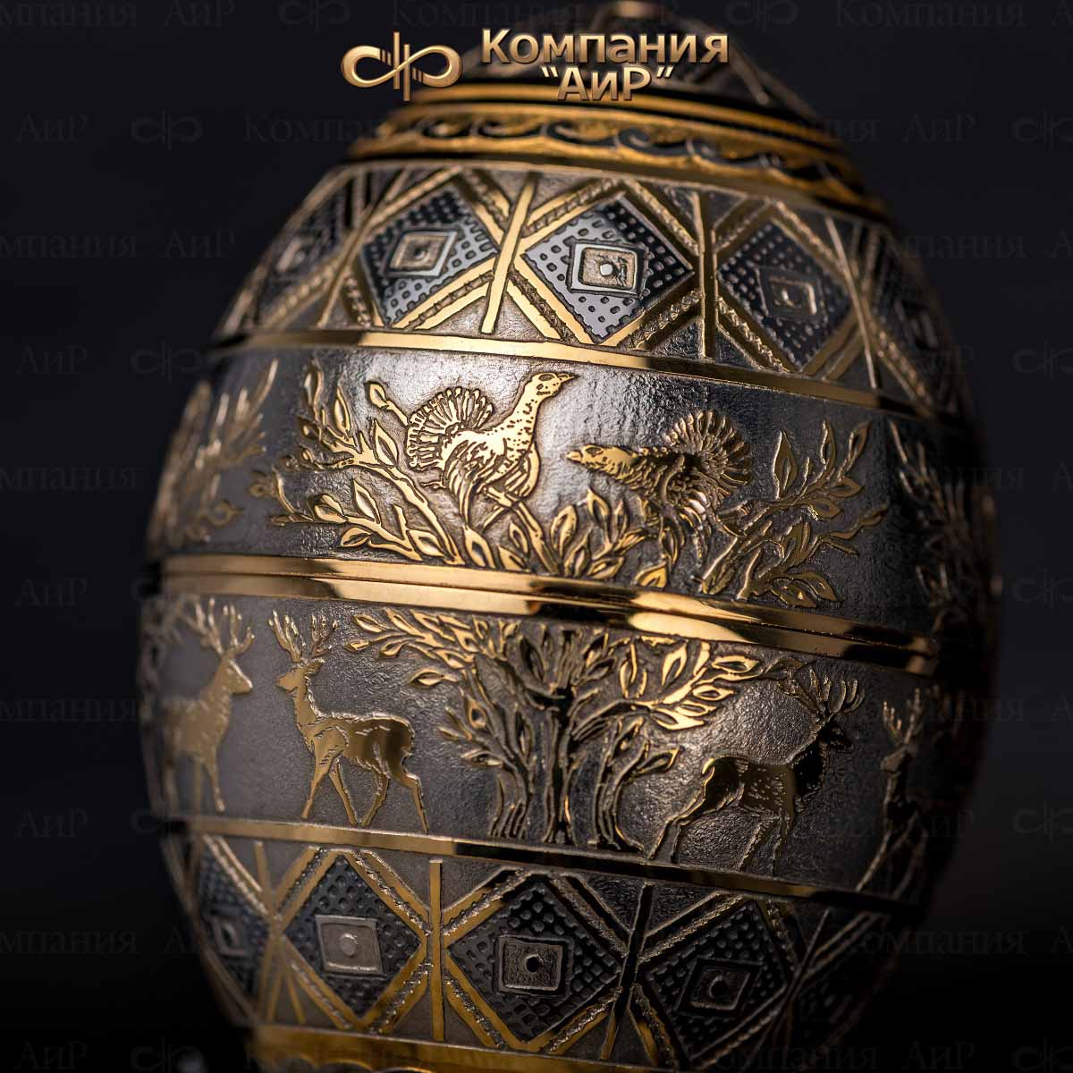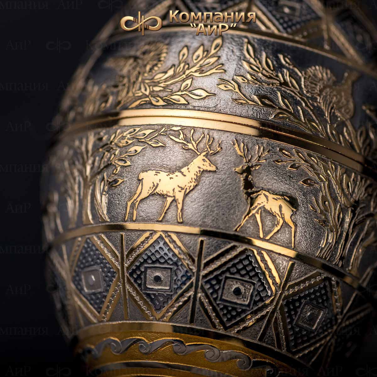 Представленное изделие – это сувенирное яйцо с древней символикой, изображающее мировое древо, где в верхнем мире в кроне древа живут птицы, а в среднем мире - олени, тотемные существа, охраняющие славянский род. В мифологии многих народов небесные оленихи являются прародителями человеческого рода. Художники Компании «АиР» объединили в одном изделии две известные традиции – златоустовское искусство гравюры на металле и древнее искусство славянской писанки.
