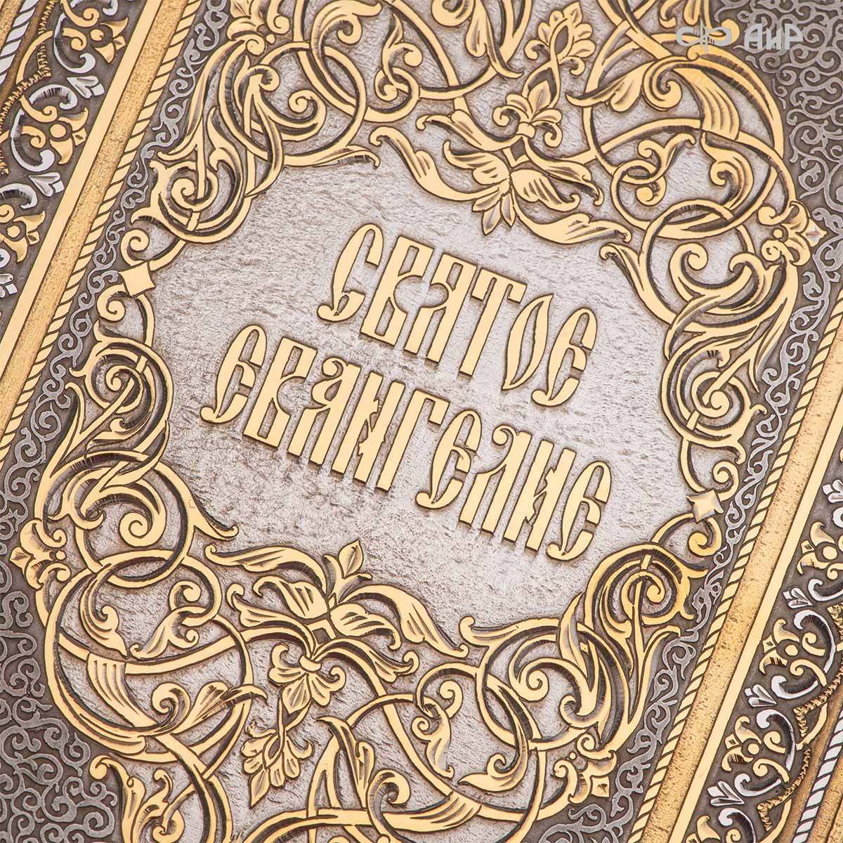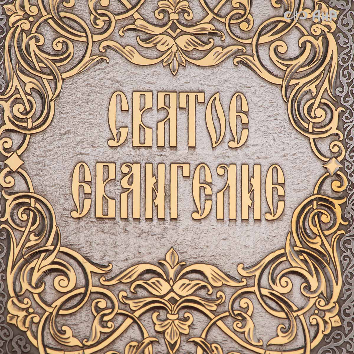 Декоративная накладка для кожаного оклада этой книги изготовлена в стиле златоустовской гравюры на металле, покрыта золотом высшей пробы. Узор на декоративной накладке выполнен в христианской символике.