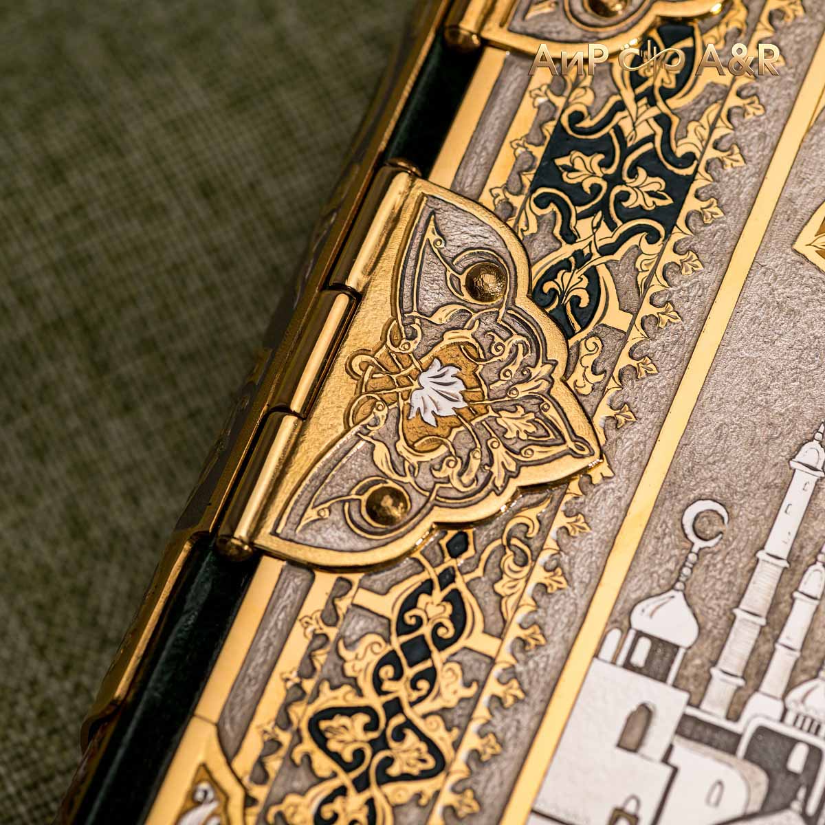 Оклад для Корана - священной книги мусульман, изготовлен в стиле златоустовской гравюры на металле, покрыт золотом высшей пробы. Узор на лицевой и оборотной сторонах оклада выполнен в восточных мотивах с арабской вязью.