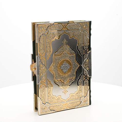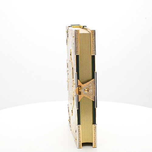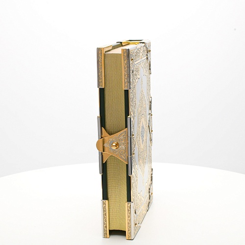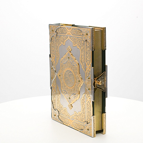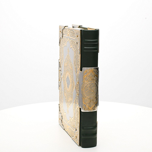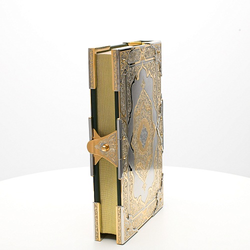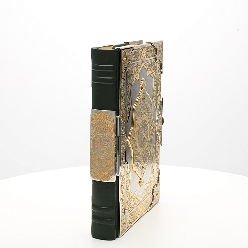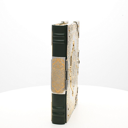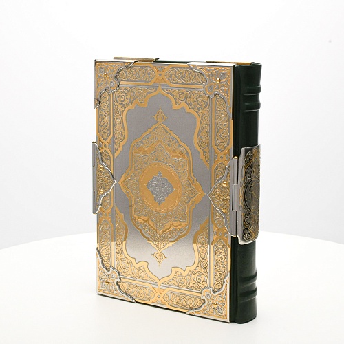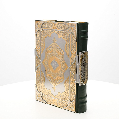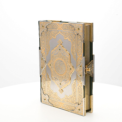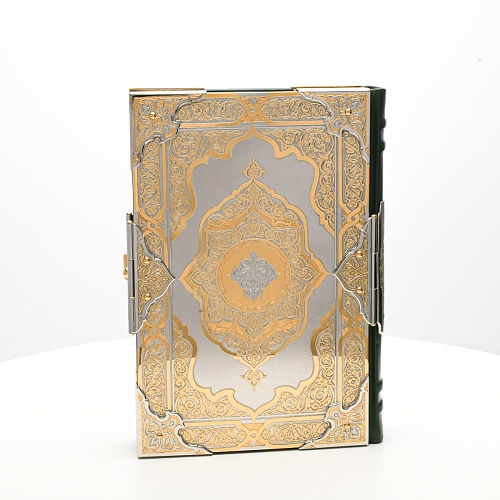 Оклад для Корана - священной книги мусульман, изготовлен в стиле златоустовской гравюры на металле, покрыт золотом высшей пробы. Узор на лицевой и оборотной сторонах оклада выполнен в восточных мотивах с арабской вязью.