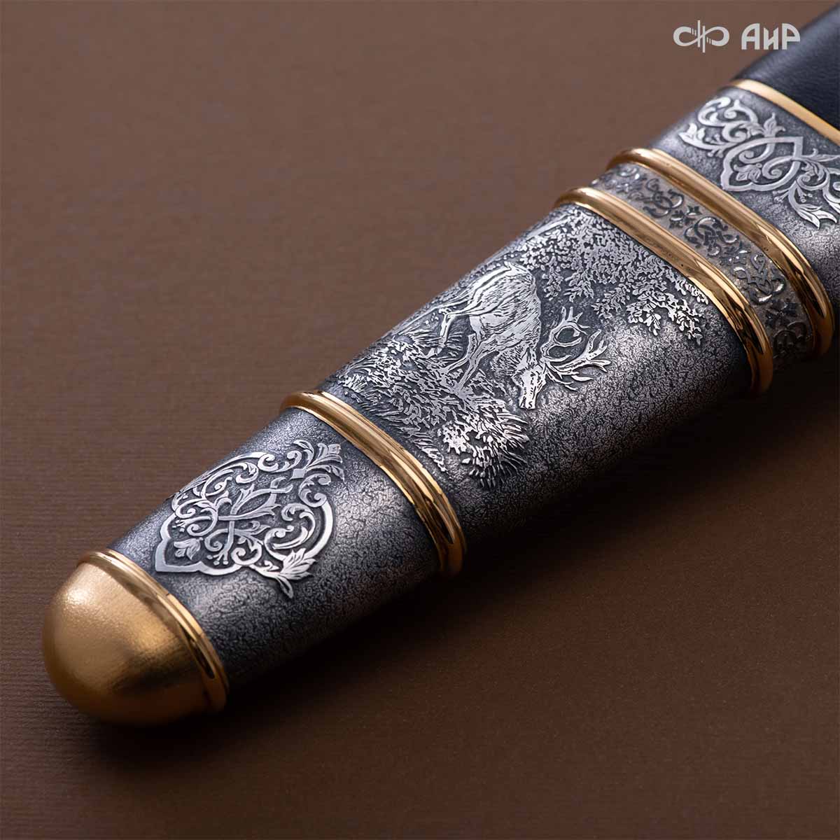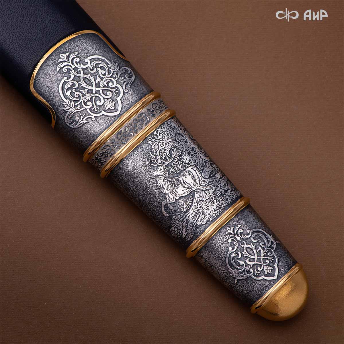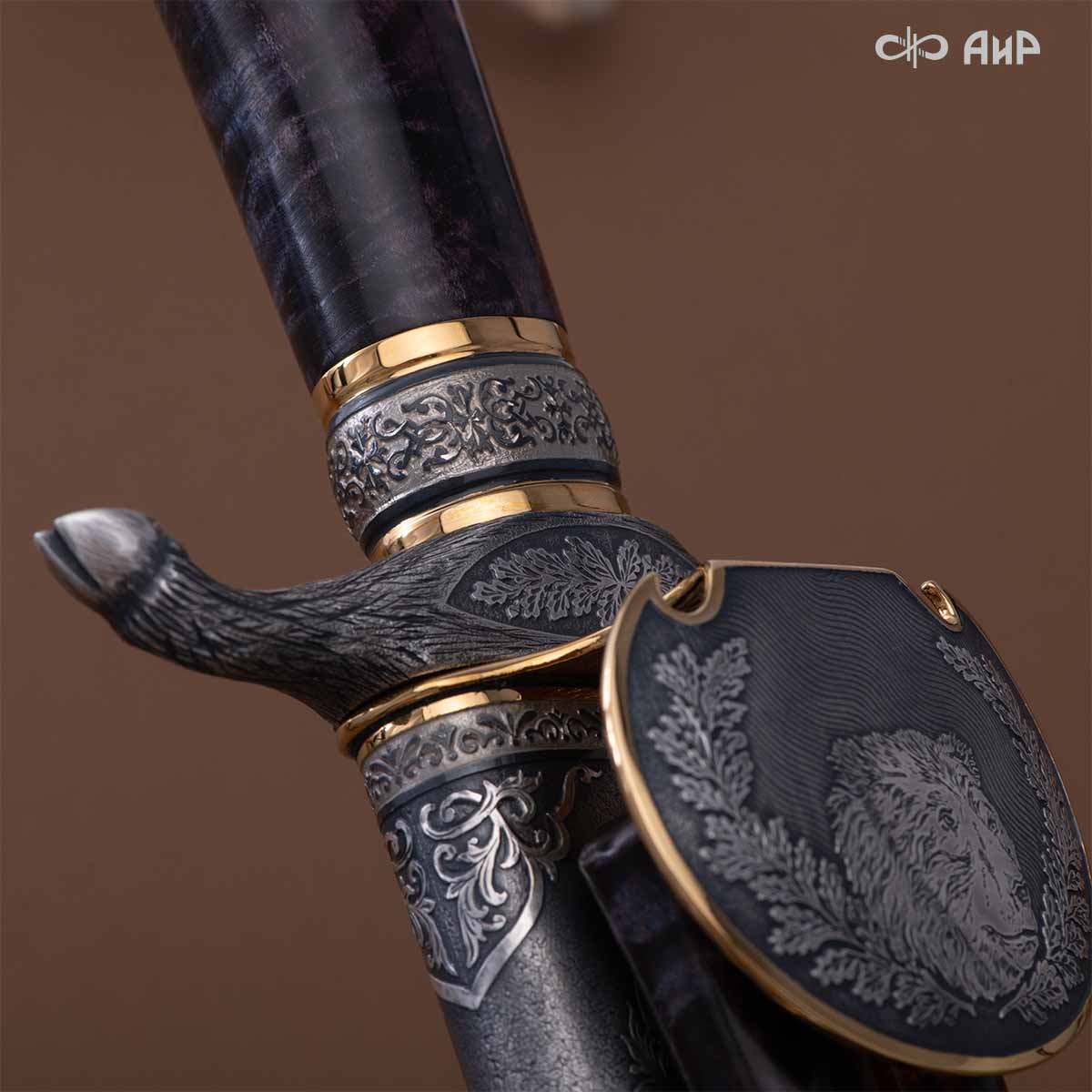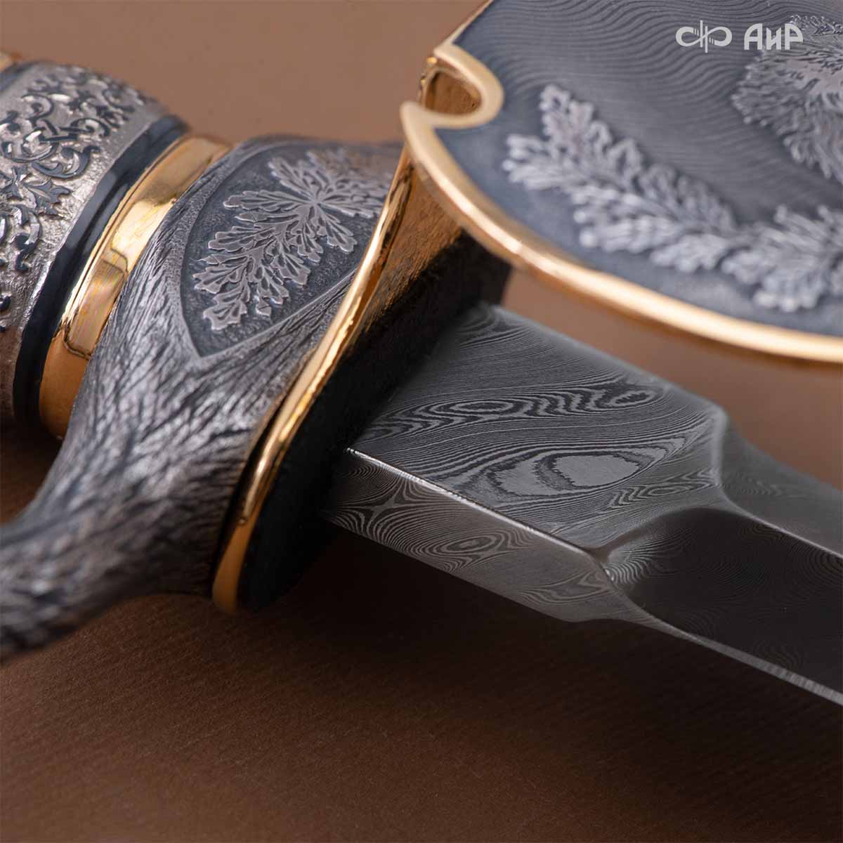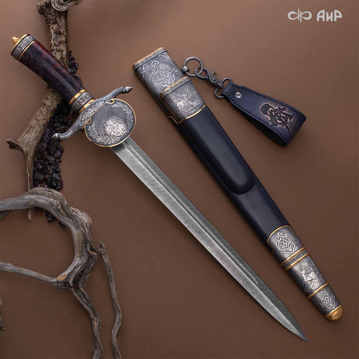 Оружейники и художники Компании «АиР», авторы современной версии хиршфангера, создали изделие в духе европейских традиций. Большой кинжал имеет клинок из атмосферостойкого дамаска ZLADINOX ZDI-1016, прямой, однолезвийный, с одним широким долом с обеих сторон, боевой конец двулезвийный. Рукоять изготовлена из стабилизированной карельской березы. Окончания крестовины загнуты в противоположные стороны и выполнены в виде ножек оленя. Под крестовиной располагается декоративный щитик в виде раковины, декорированной в стиле златоустовской гравюры на металле. Отличительная черта охотничьего кортика ‒ ножны, в которых сделан дополнительный карман для хранения вкладного малого ножа и вилки с клинком из атмосферостойкой дамасской стали ZLADINOX ZDI-1016. Обычно они используются для разделки дичи или для бытовых нужд герцогов и монархов. Ножны и клинок украшены в стиле королевских и егерских хиршфангеров: элементы с изображениями желудей, дубовых листьев и геральдических знаков.