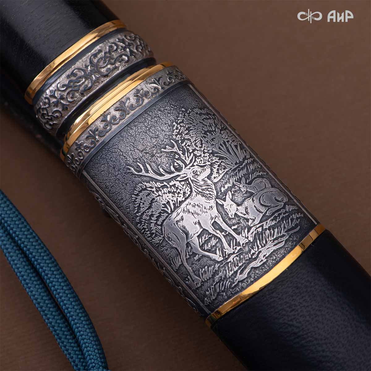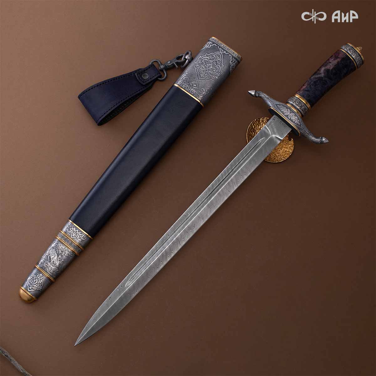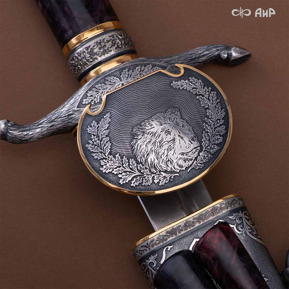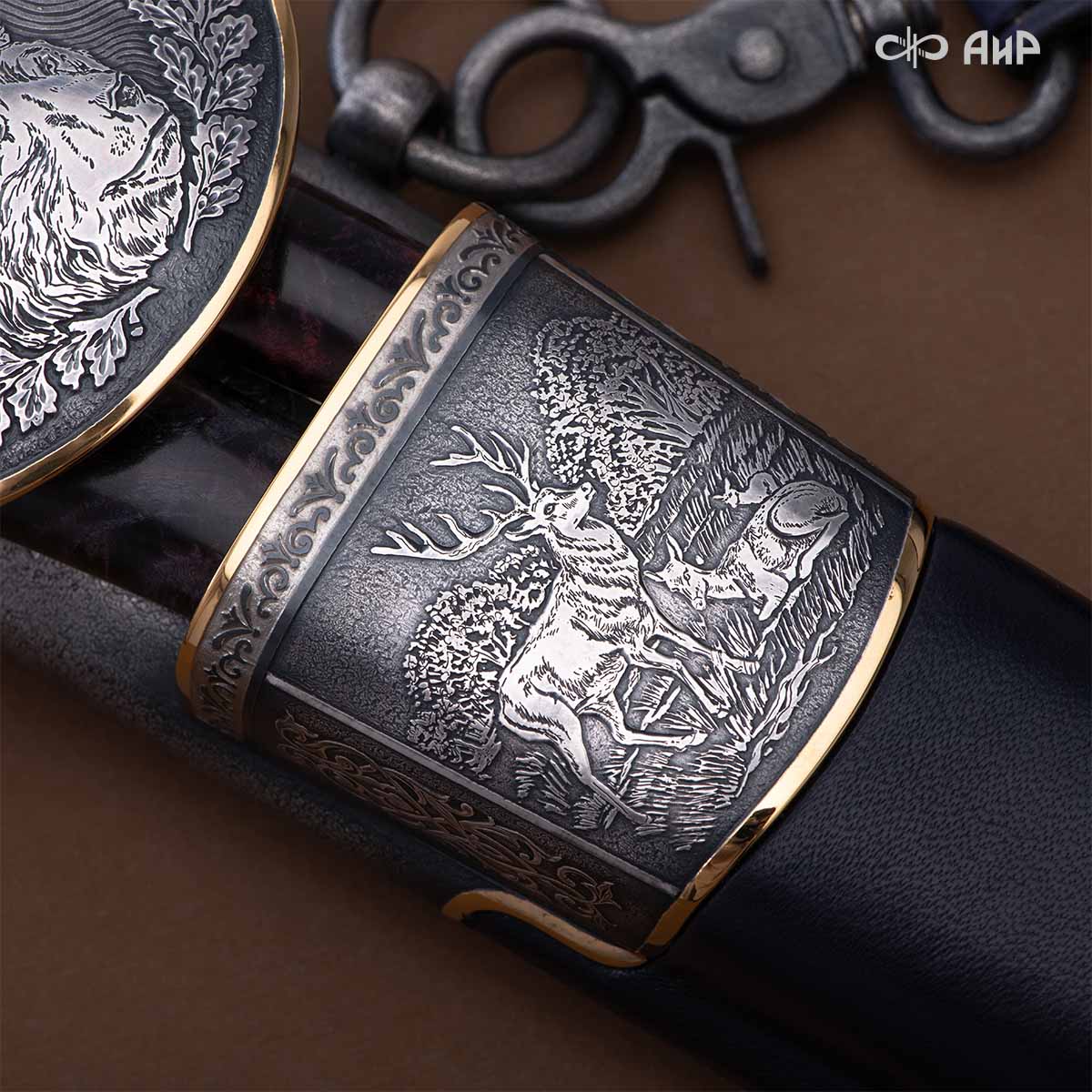 Оружейники и художники Компании «АиР», авторы современной версии хиршфангера, создали изделие в духе европейских традиций. Большой кинжал имеет клинок из атмосферостойкого дамаска ZLADINOX ZDI-1016, прямой, однолезвийный, с одним широким долом с обеих сторон, боевой конец двулезвийный. Рукоять изготовлена из стабилизированной карельской березы. Окончания крестовины загнуты в противоположные стороны и выполнены в виде ножек оленя. Под крестовиной располагается декоративный щитик в виде раковины, декорированной в стиле златоустовской гравюры на металле. Отличительная черта охотничьего кортика ‒ ножны, в которых сделан дополнительный карман для хранения вкладного малого ножа и вилки с клинком из атмосферостойкой дамасской стали ZLADINOX ZDI-1016. Обычно они используются для разделки дичи или для бытовых нужд герцогов и монархов. Ножны и клинок украшены в стиле королевских и егерских хиршфангеров: элементы с изображениями желудей, дубовых листьев и геральдических знаков.