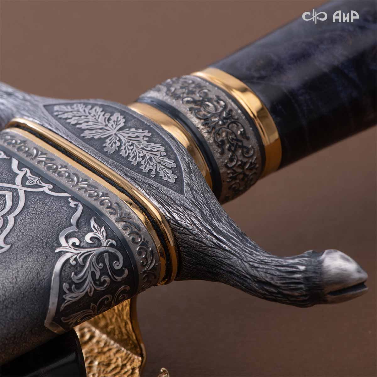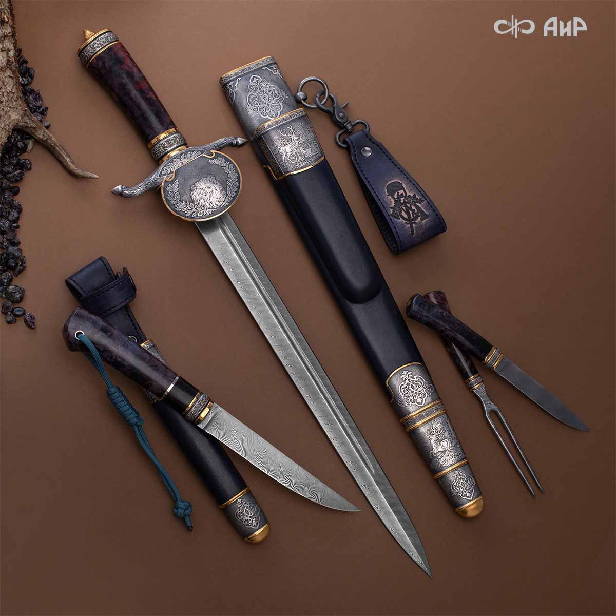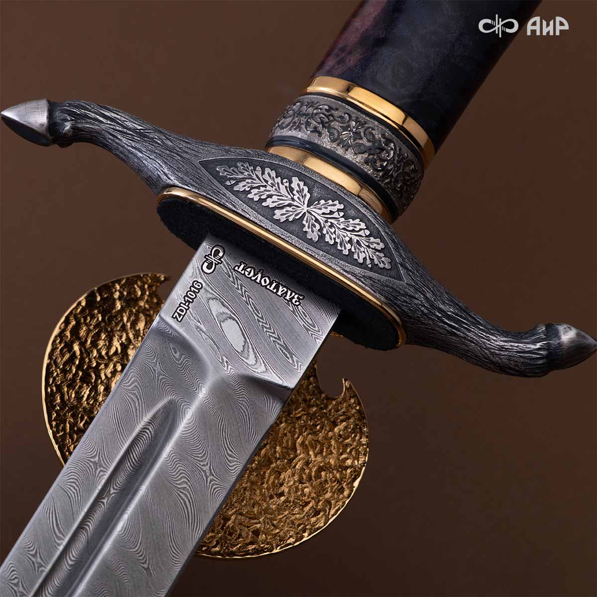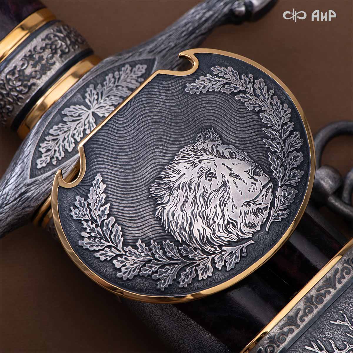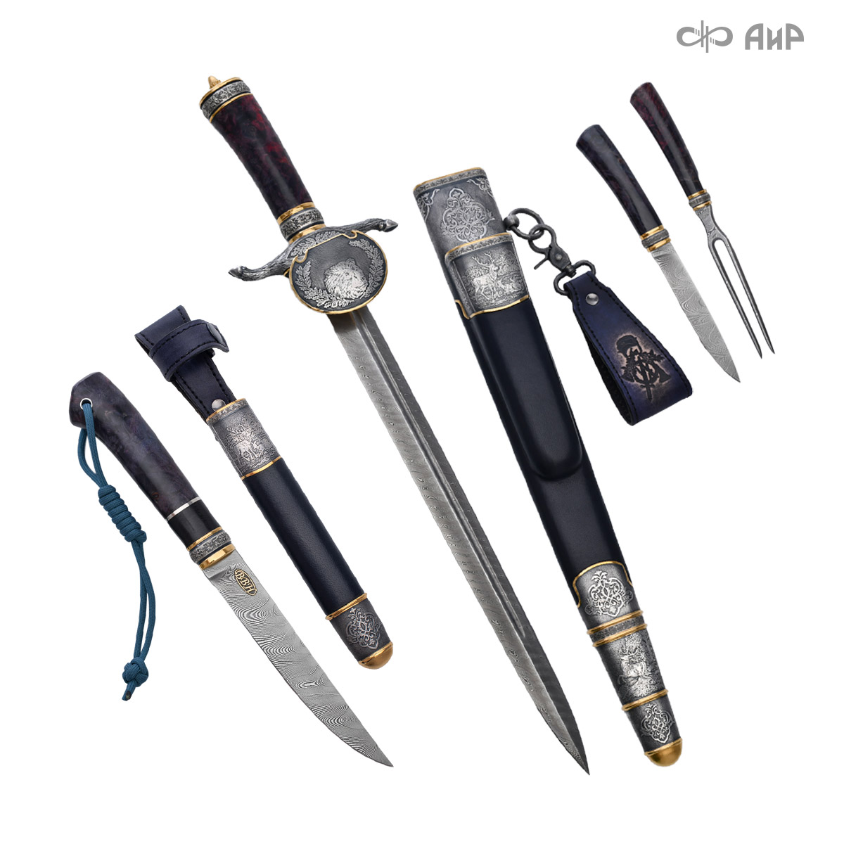 Оружейники и художники Компании «АиР», авторы современной версии хиршфангера, создали изделие в духе европейских традиций. Большой кинжал имеет клинок из атмосферостойкого дамаска ZLADINOX ZDI-1016, прямой, однолезвийный, с одним широким долом с обеих сторон, боевой конец двулезвийный. Рукоять изготовлена из стабилизированной карельской березы. Окончания крестовины загнуты в противоположные стороны и выполнены в виде ножек оленя. Под крестовиной располагается декоративный щитик в виде раковины, декорированной в стиле златоустовской гравюры на металле. Отличительная черта охотничьего кортика ‒ ножны, в которых сделан дополнительный карман для хранения вкладного малого ножа и вилки с клинком из атмосферостойкой дамасской стали ZLADINOX ZDI-1016. Обычно они используются для разделки дичи или для бытовых нужд герцогов и монархов. Ножны и клинок украшены в стиле королевских и егерских хиршфангеров: элементы с изображениями желудей, дубовых листьев и геральдических знаков.