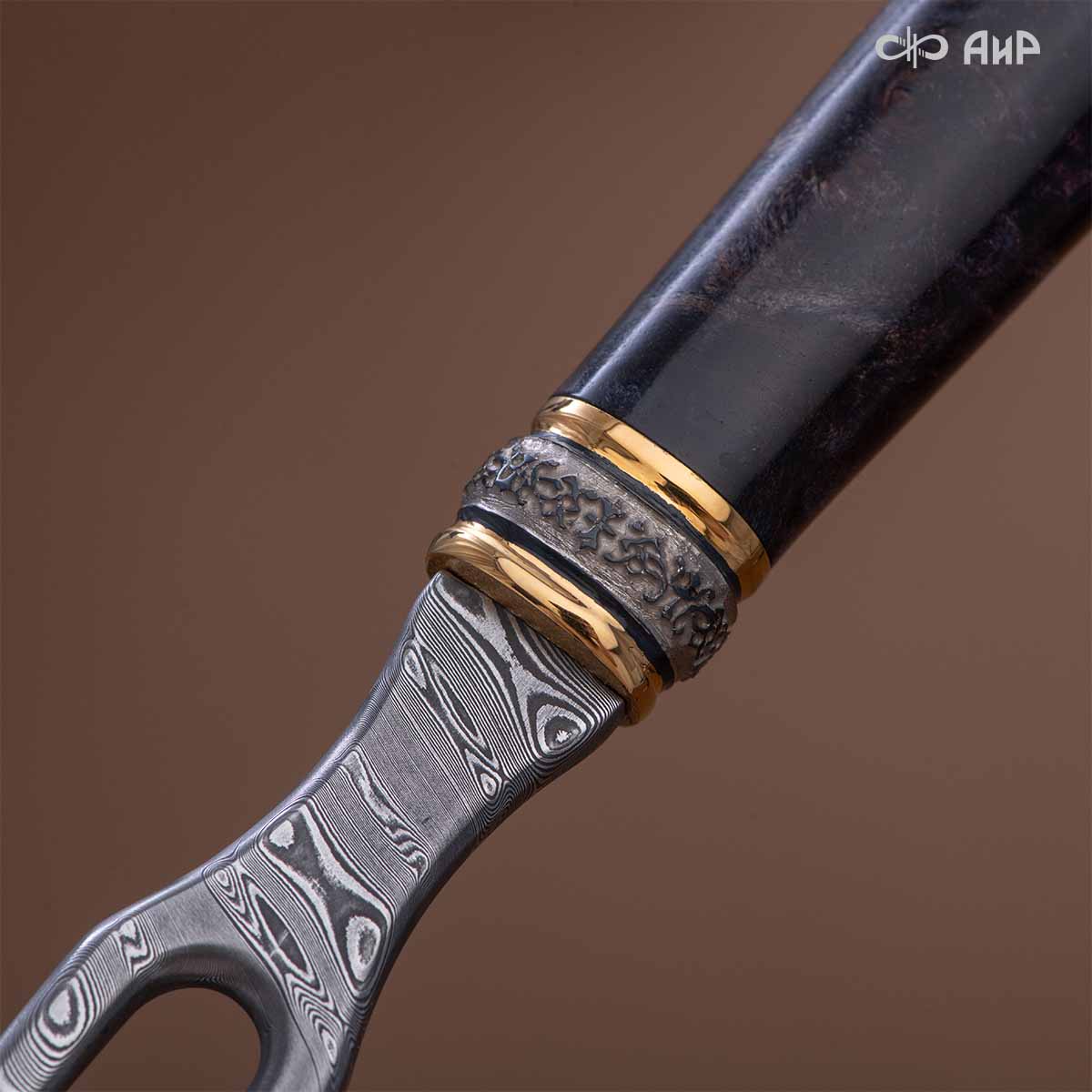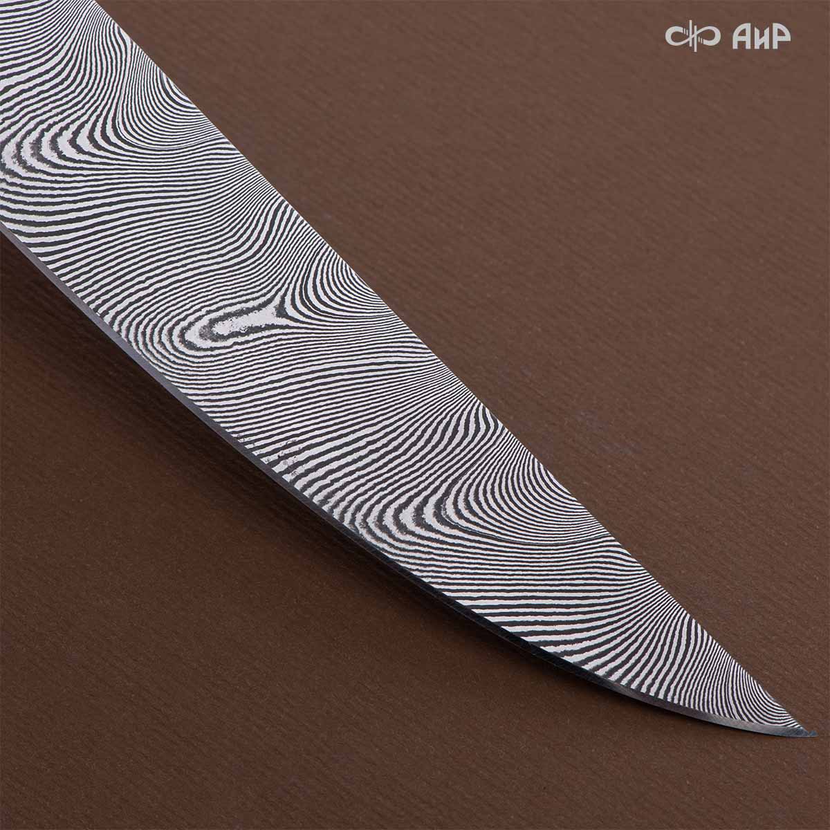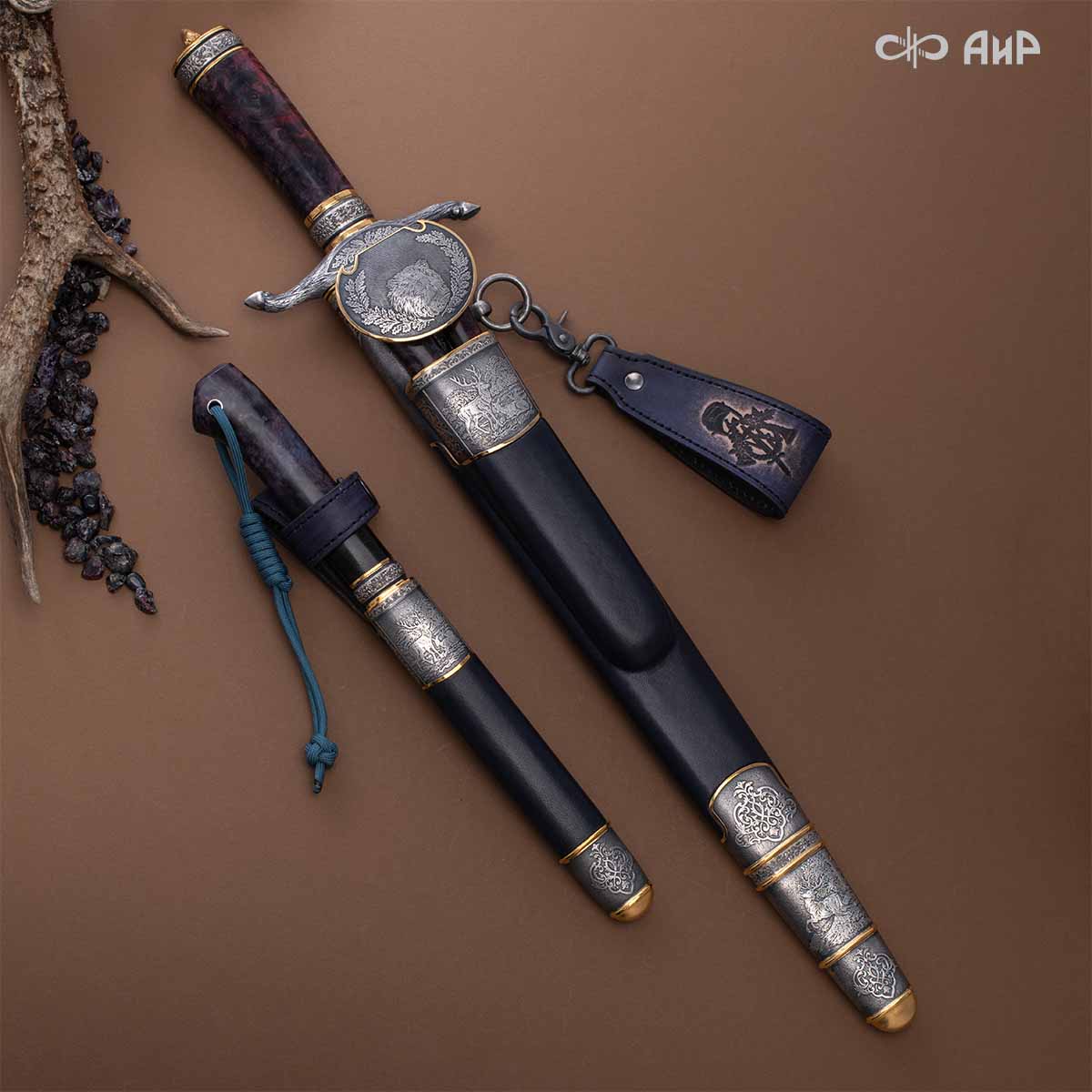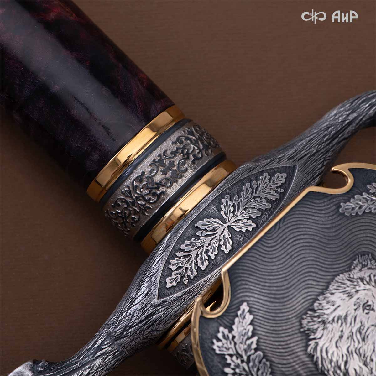 Оружейники и художники Компании «АиР», авторы современной версии хиршфангера, создали изделие в духе европейских традиций. Большой кинжал имеет клинок из атмосферостойкого дамаска ZLADINOX ZDI-1016, прямой, однолезвийный, с одним широким долом с обеих сторон, боевой конец двулезвийный. Рукоять изготовлена из стабилизированной карельской березы. Окончания крестовины загнуты в противоположные стороны и выполнены в виде ножек оленя. Под крестовиной располагается декоративный щитик в виде раковины, декорированной в стиле златоустовской гравюры на металле. Отличительная черта охотничьего кортика ‒ ножны, в которых сделан дополнительный карман для хранения вкладного малого ножа и вилки с клинком из атмосферостойкой дамасской стали ZLADINOX ZDI-1016. Обычно они используются для разделки дичи или для бытовых нужд герцогов и монархов. Ножны и клинок украшены в стиле королевских и егерских хиршфангеров: элементы с изображениями желудей, дубовых листьев и геральдических знаков.