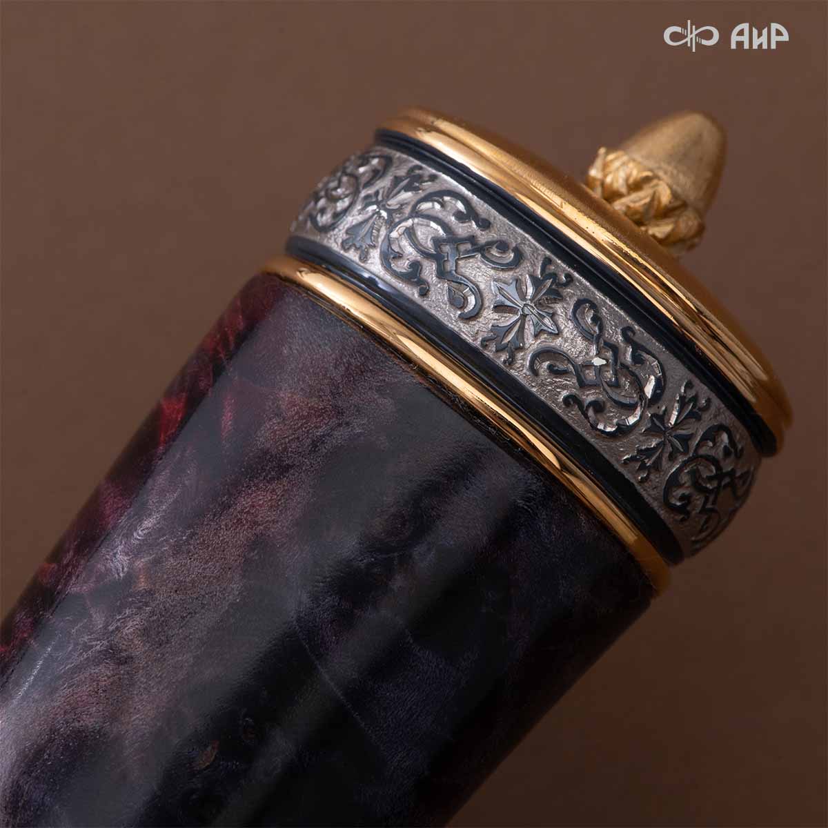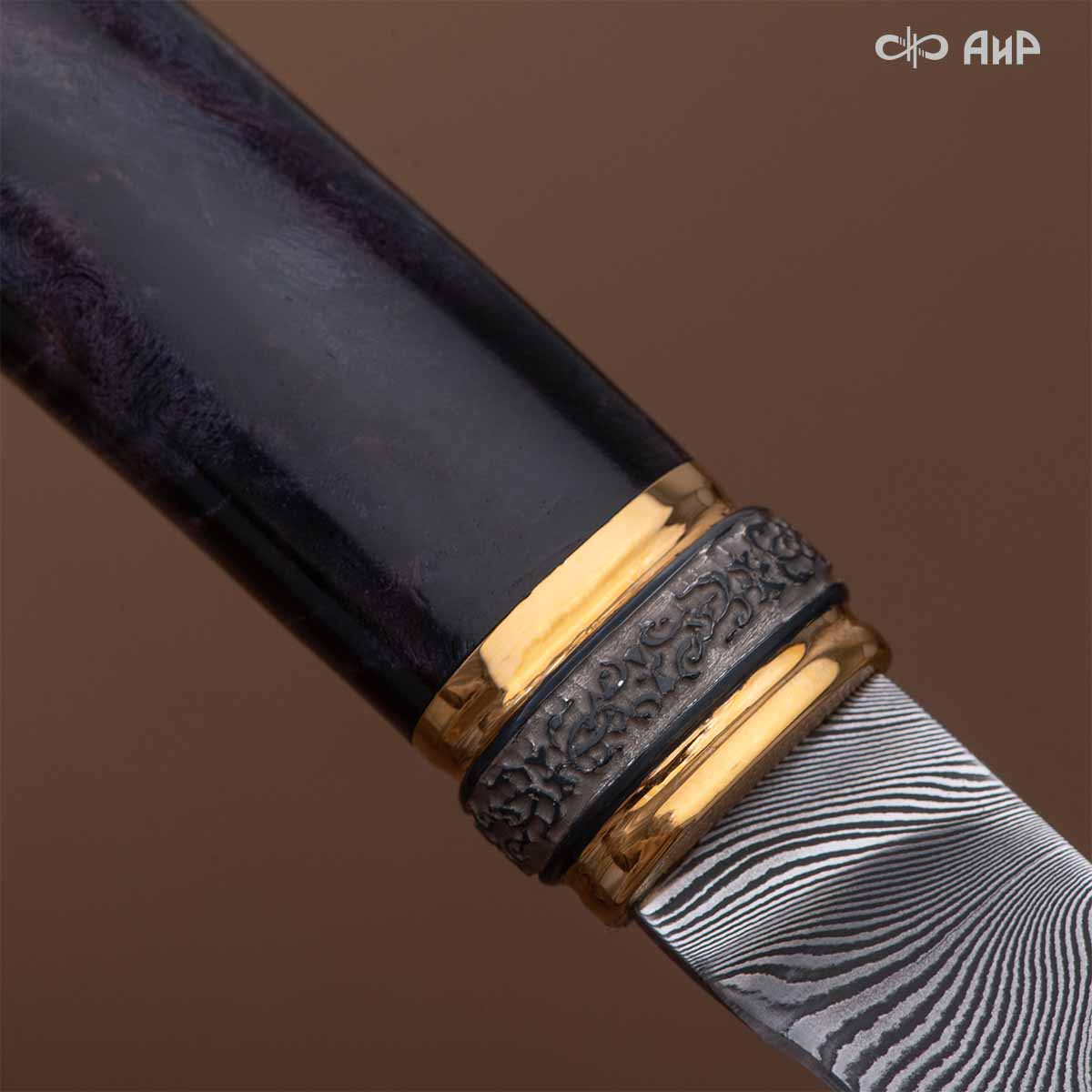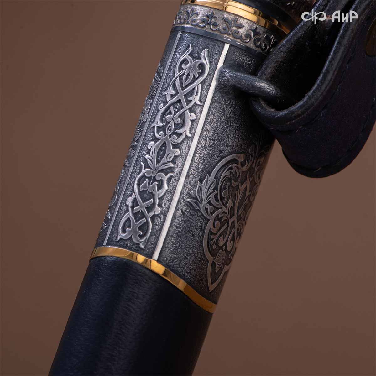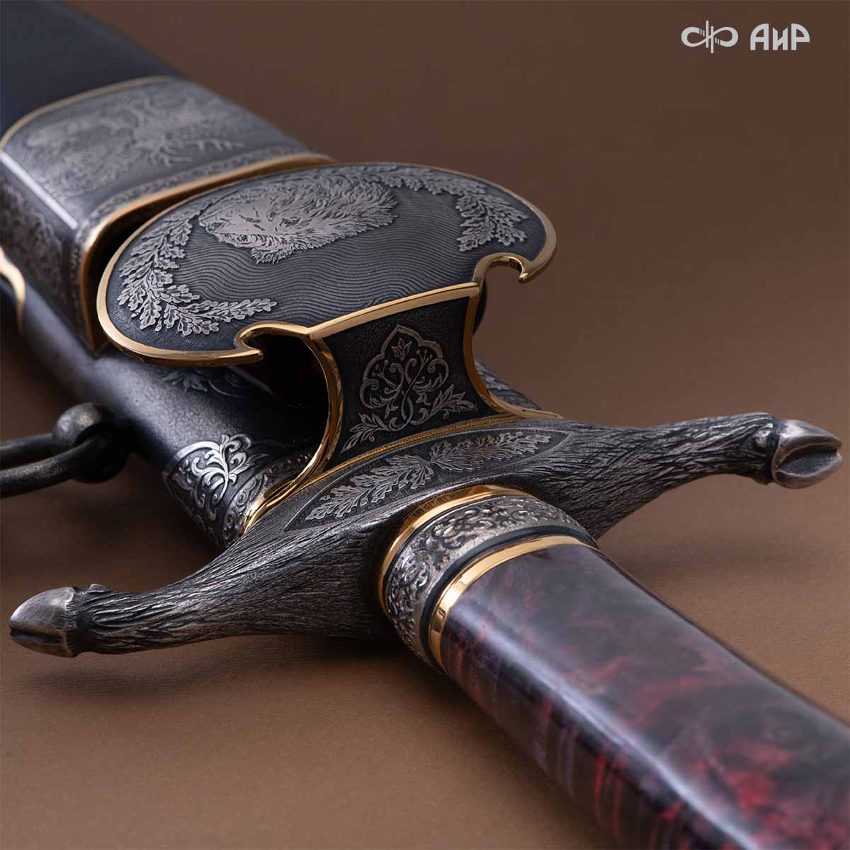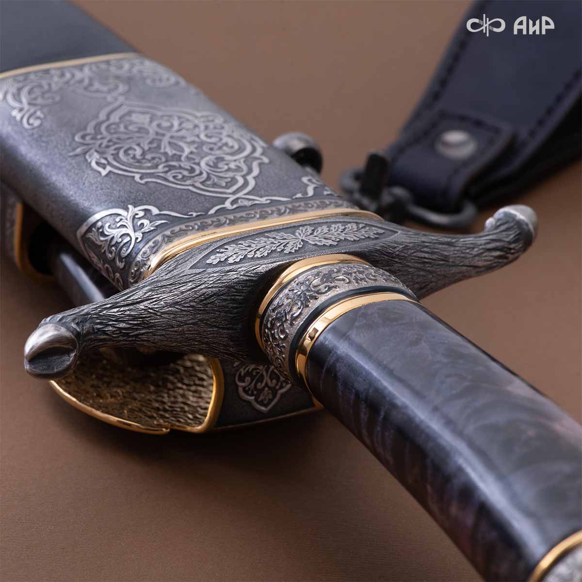 Оружейники и художники Компании «АиР», авторы современной версии хиршфангера, создали изделие в духе европейских традиций. Большой кинжал имеет клинок из атмосферостойкого дамаска ZLADINOX ZDI-1016, прямой, однолезвийный, с одним широким долом с обеих сторон, боевой конец двулезвийный. Рукоять изготовлена из стабилизированной карельской березы. Окончания крестовины загнуты в противоположные стороны и выполнены в виде ножек оленя. Под крестовиной располагается декоративный щитик в виде раковины, декорированной в стиле златоустовской гравюры на металле. Отличительная черта охотничьего кортика ‒ ножны, в которых сделан дополнительный карман для хранения вкладного малого ножа и вилки с клинком из атмосферостойкой дамасской стали ZLADINOX ZDI-1016. Обычно они используются для разделки дичи или для бытовых нужд герцогов и монархов. Ножны и клинок украшены в стиле королевских и егерских хиршфангеров: элементы с изображениями желудей, дубовых листьев и геральдических знаков.