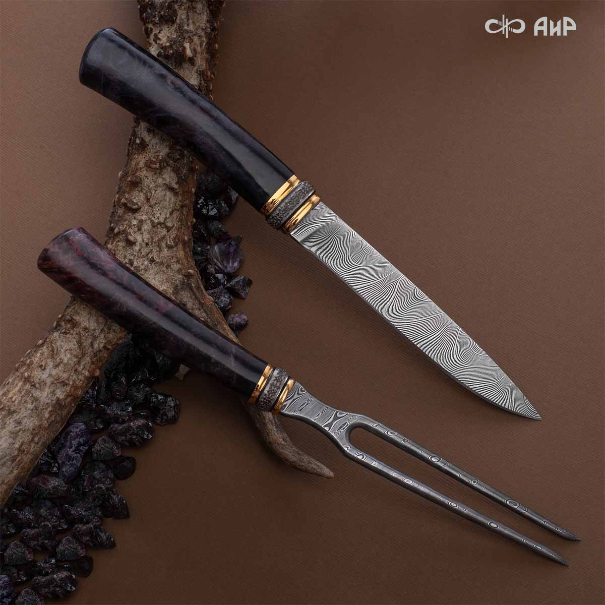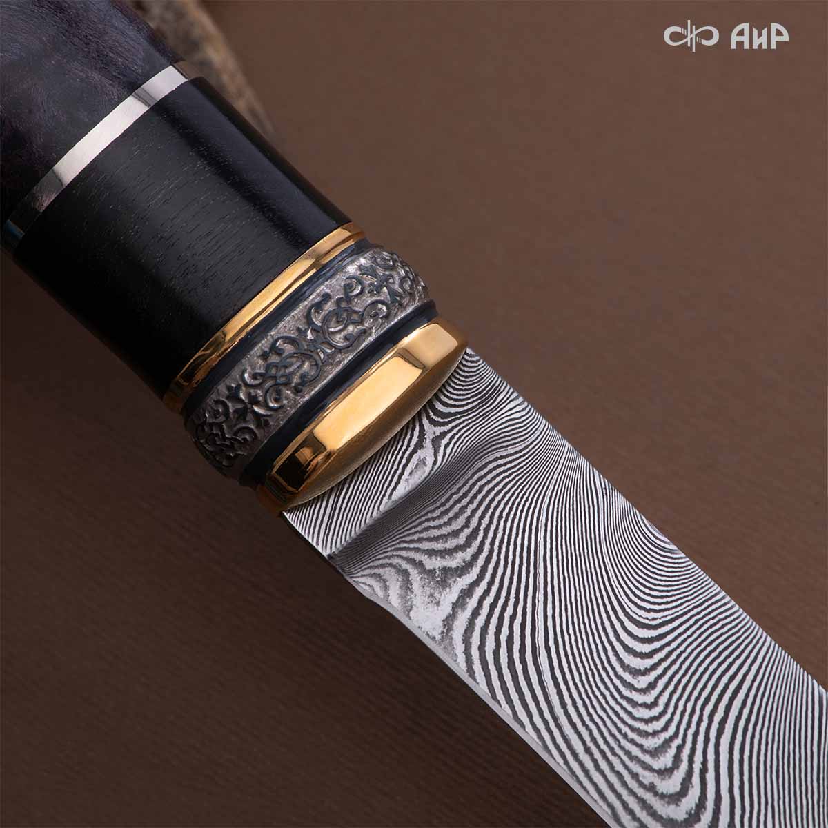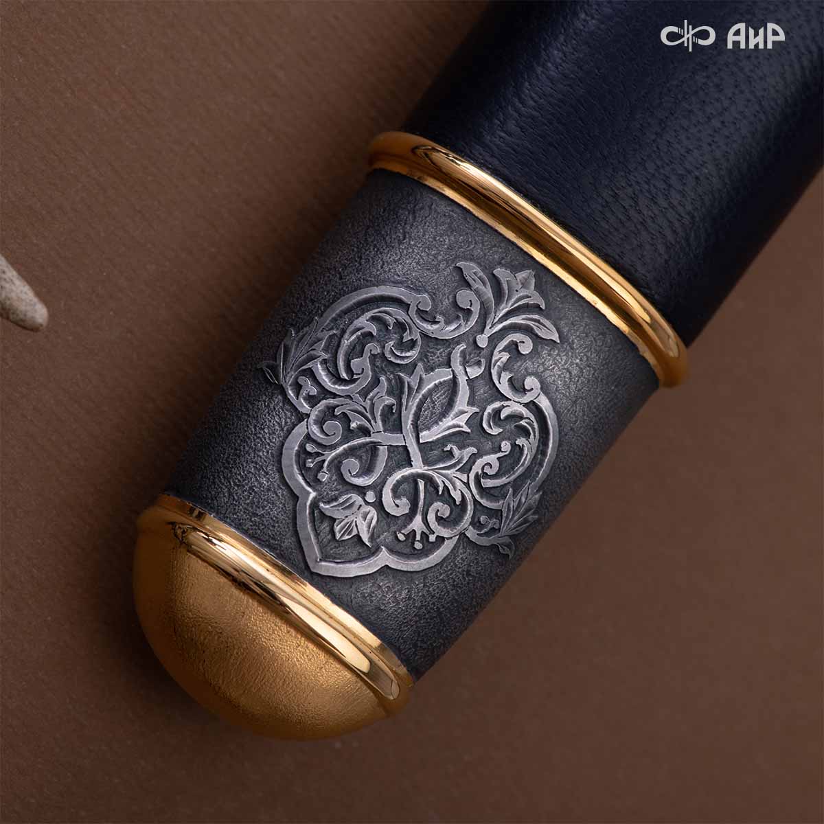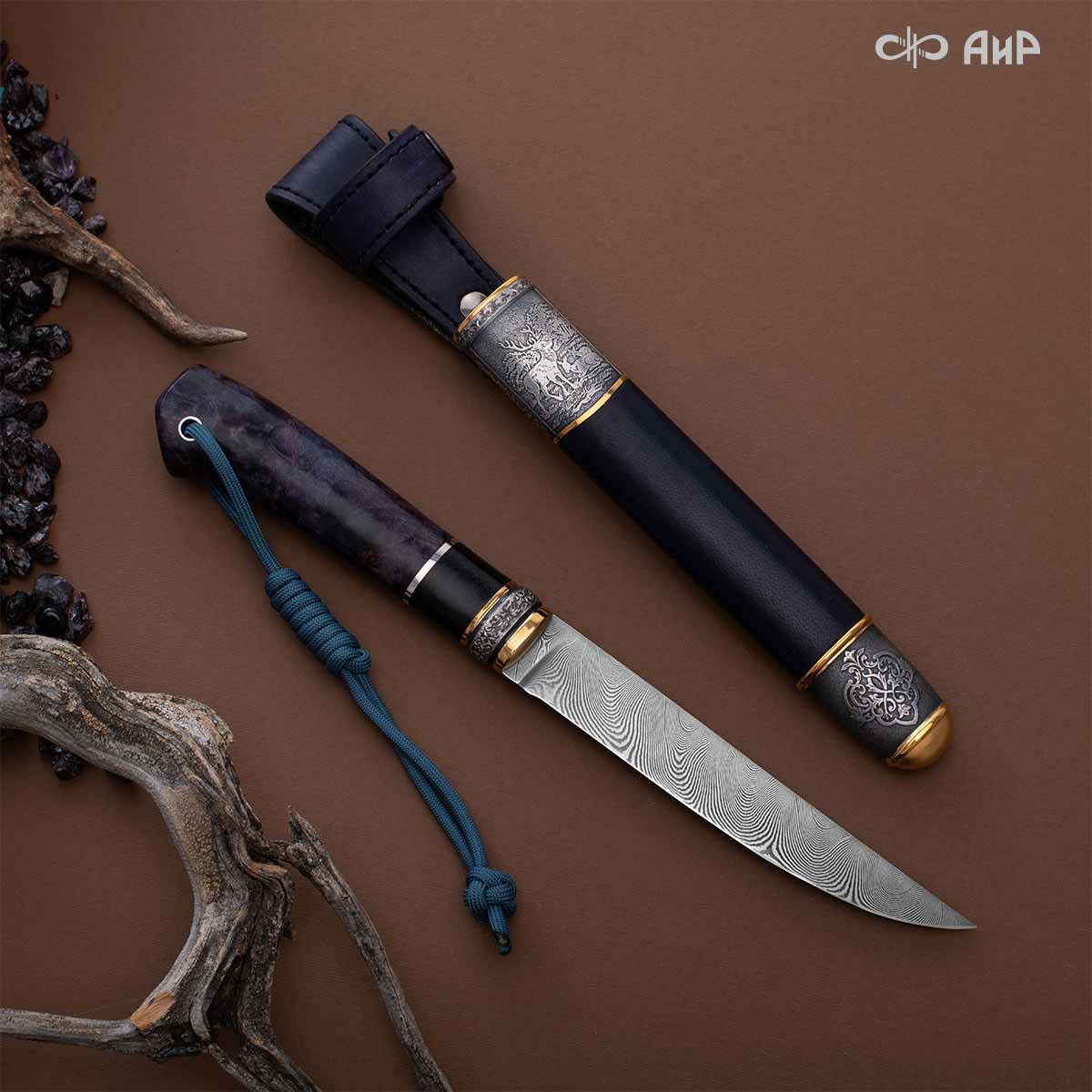 Оружейники и художники Компании «АиР», авторы современной версии хиршфангера, создали изделие в духе европейских традиций. Большой кинжал имеет клинок из атмосферостойкого дамаска ZLADINOX ZDI-1016, прямой, однолезвийный, с одним широким долом с обеих сторон, боевой конец двулезвийный. Рукоять изготовлена из стабилизированной карельской березы. Окончания крестовины загнуты в противоположные стороны и выполнены в виде ножек оленя. Под крестовиной располагается декоративный щитик в виде раковины, декорированной в стиле златоустовской гравюры на металле. Отличительная черта охотничьего кортика ‒ ножны, в которых сделан дополнительный карман для хранения вкладного малого ножа и вилки с клинком из атмосферостойкой дамасской стали ZLADINOX ZDI-1016. Обычно они используются для разделки дичи или для бытовых нужд герцогов и монархов. Ножны и клинок украшены в стиле королевских и егерских хиршфангеров: элементы с изображениями желудей, дубовых листьев и геральдических знаков.