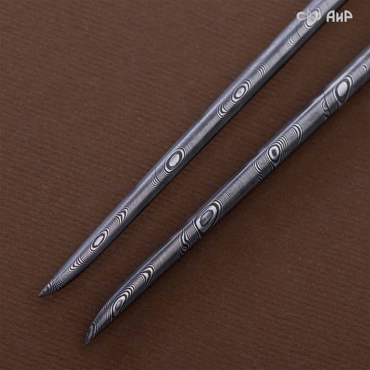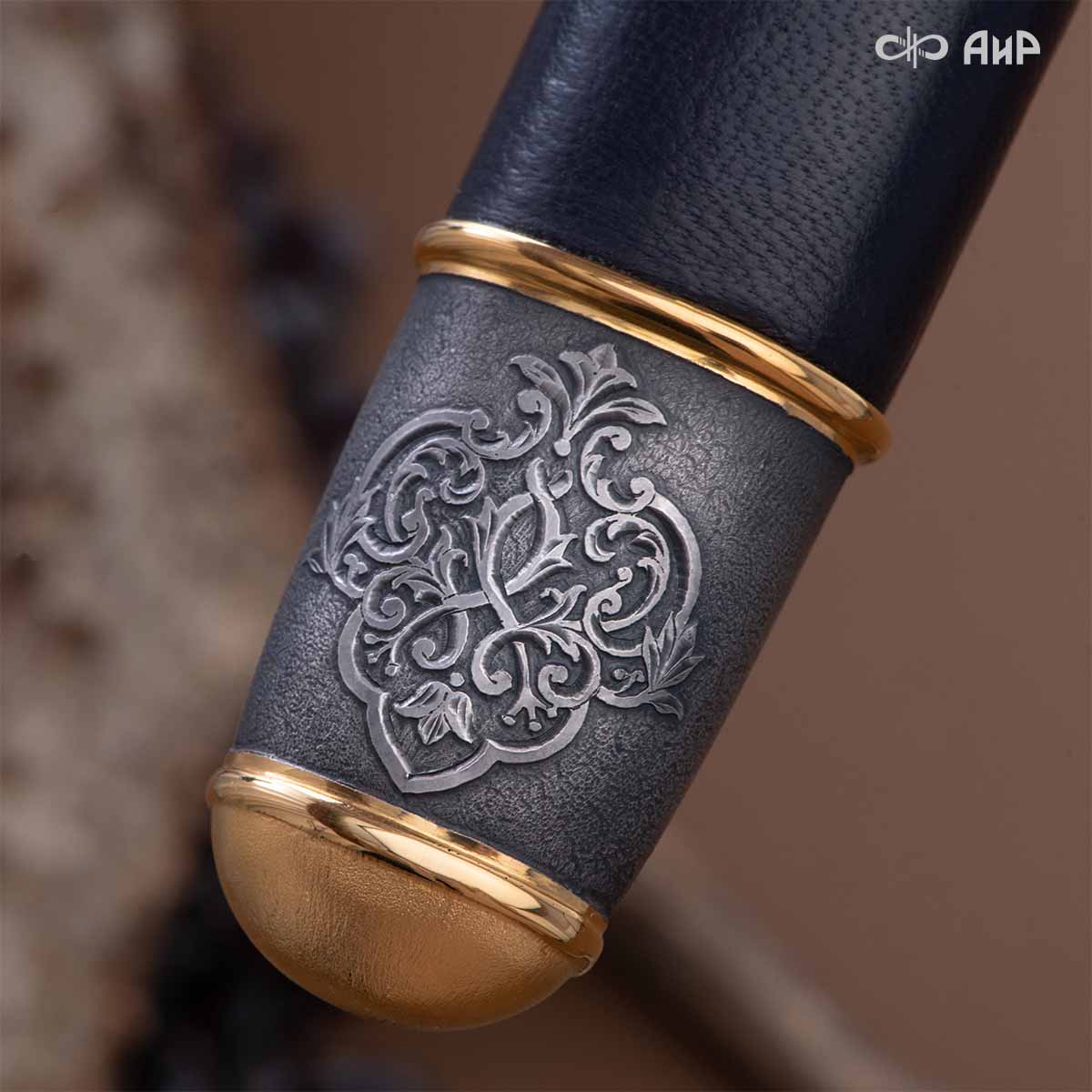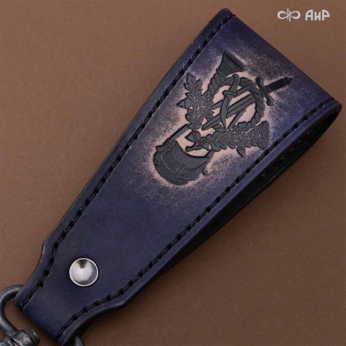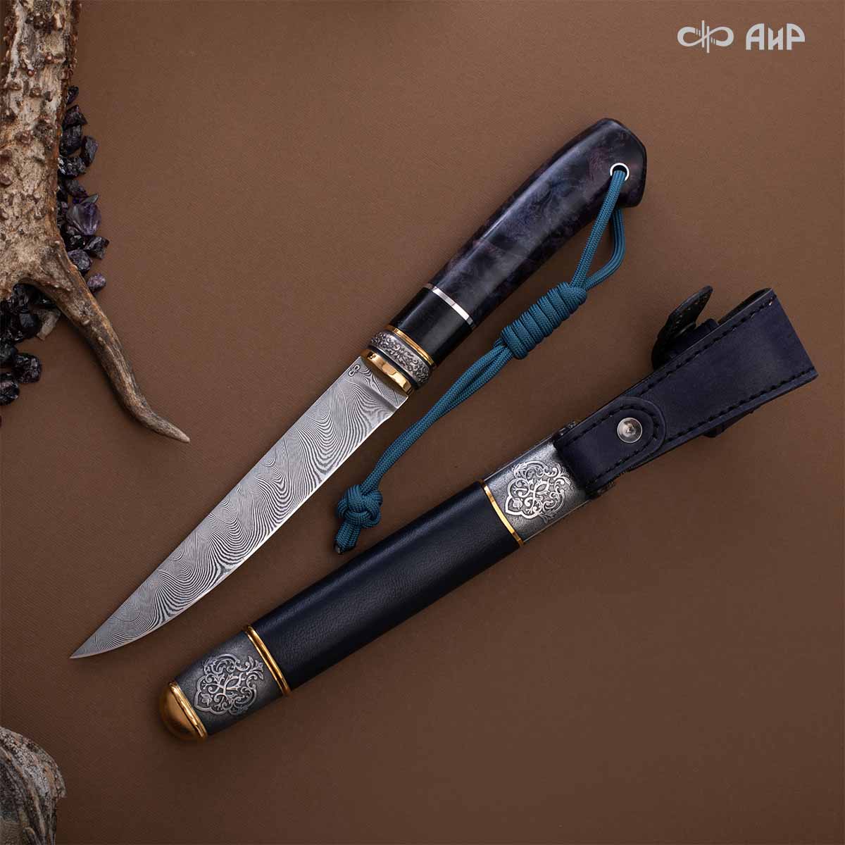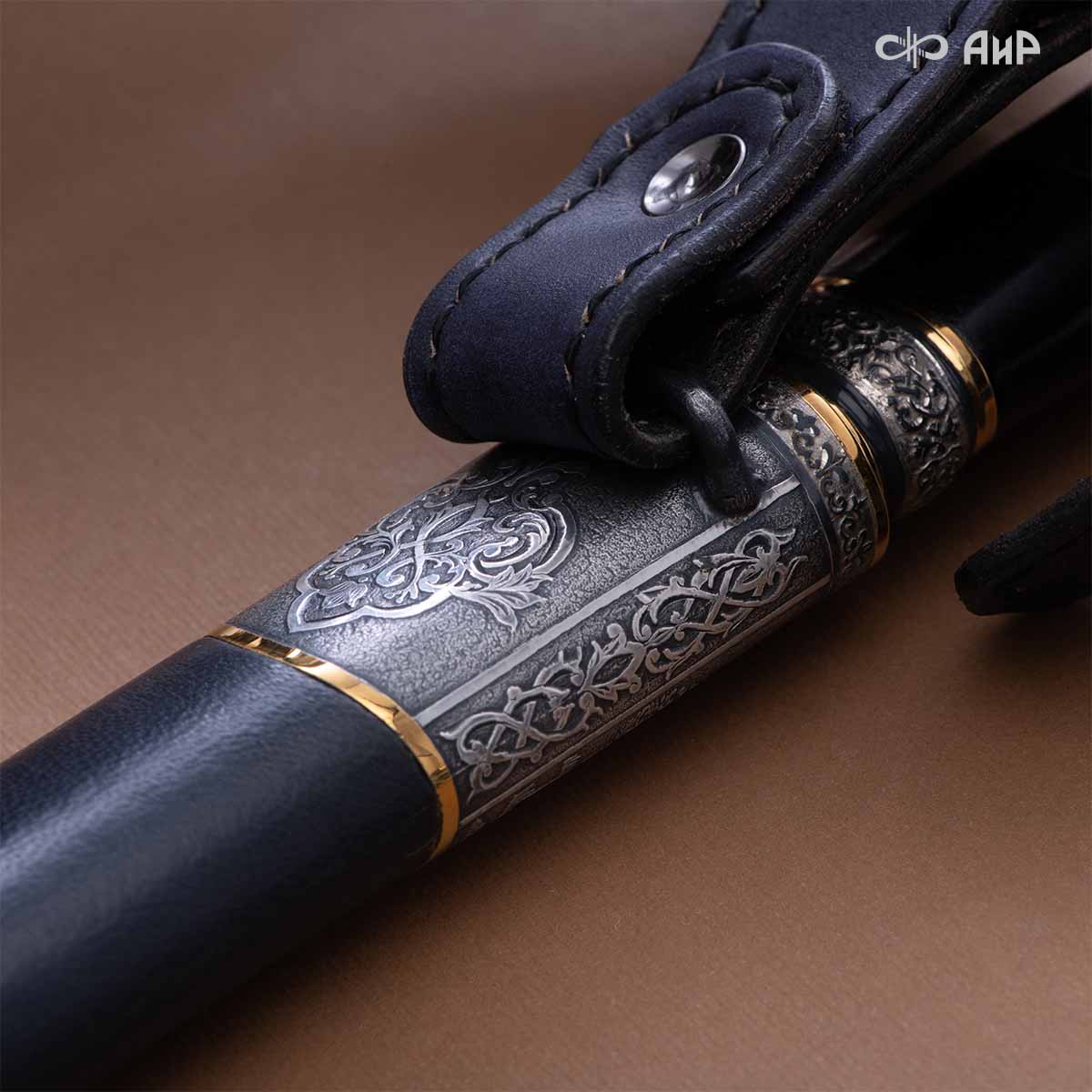 Оружейники и художники Компании «АиР», авторы современной версии хиршфангера, создали изделие в духе европейских традиций. Большой кинжал имеет клинок из атмосферостойкого дамаска ZLADINOX ZDI-1016, прямой, однолезвийный, с одним широким долом с обеих сторон, боевой конец двулезвийный. Рукоять изготовлена из стабилизированной карельской березы. Окончания крестовины загнуты в противоположные стороны и выполнены в виде ножек оленя. Под крестовиной располагается декоративный щитик в виде раковины, декорированной в стиле златоустовской гравюры на металле. Отличительная черта охотничьего кортика ‒ ножны, в которых сделан дополнительный карман для хранения вкладного малого ножа и вилки с клинком из атмосферостойкой дамасской стали ZLADINOX ZDI-1016. Обычно они используются для разделки дичи или для бытовых нужд герцогов и монархов. Ножны и клинок украшены в стиле королевских и егерских хиршфангеров: элементы с изображениями желудей, дубовых листьев и геральдических знаков.