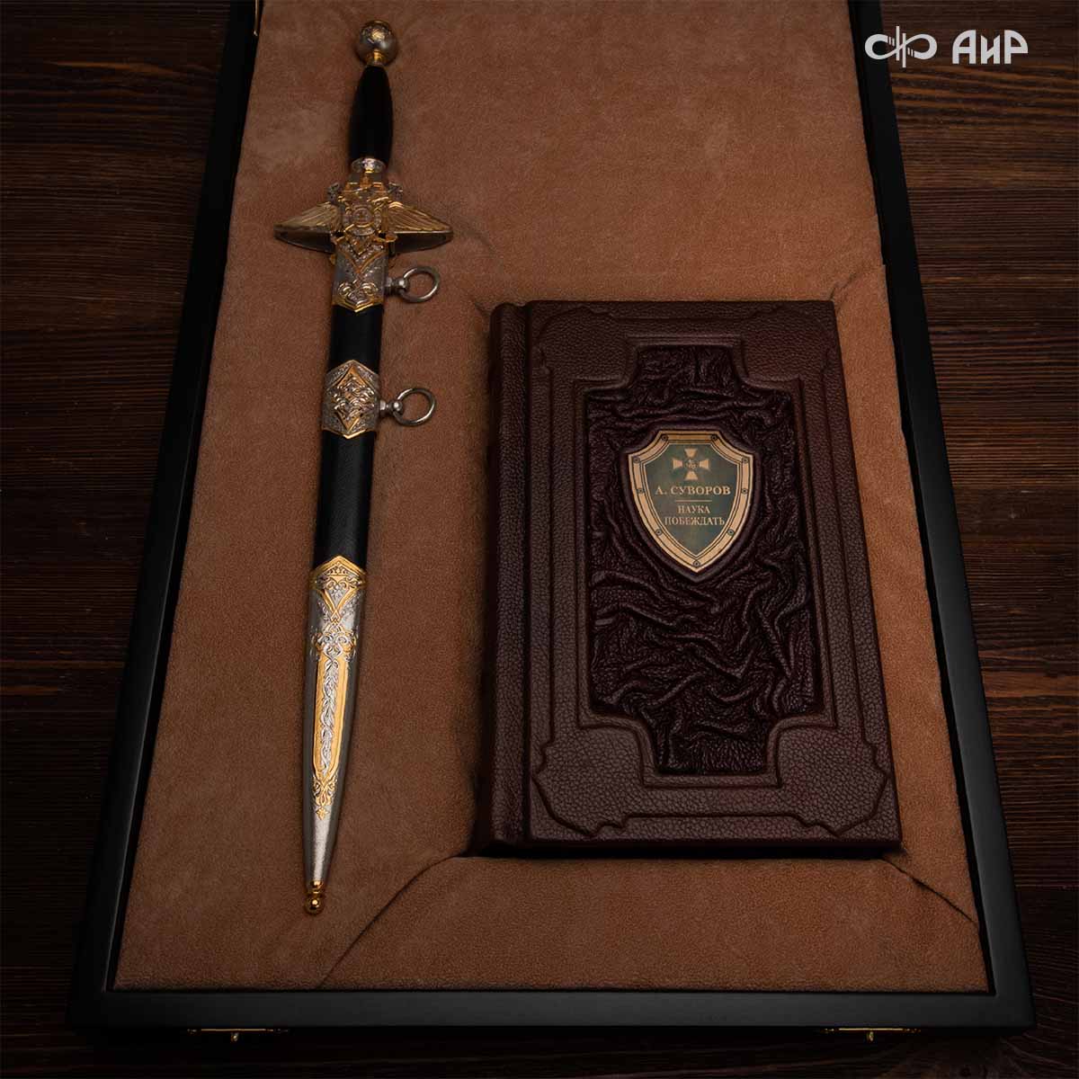 В наборе с кортиком предлагается подарочная книга «Суворов А.В. Наука побеждать». Это замечательное издание, содержащее историю побед великого полководца во всех подробностях. Удивительная автобиография, правдивое описание походов и важных событий в жизни, стихотворения известных авторов об Александре Суворове, его собственные высказывания и наиболее удачные афоризмы напечатаны на ярких страницах в разноцветных рамках. Внешнее убранство издания вполне соответствует богатому содержанию. Твердый, изготовленный по древней технологии вручную кожаный переплет украшен вставками из мятки, специально изготовленными табличками и тиснением золотой фольгой. Для прочности и удобства в книгу вставлены плотные цветные форзацы и шелковый ляссе.