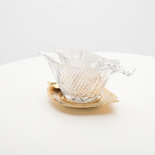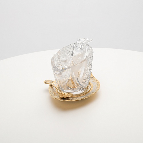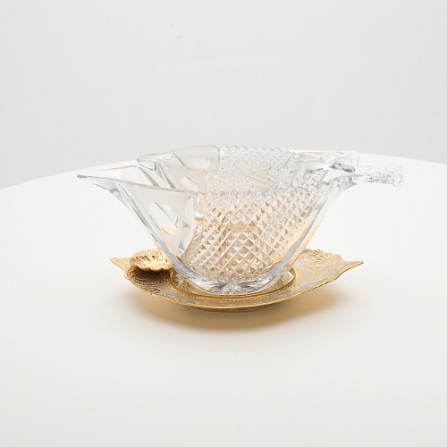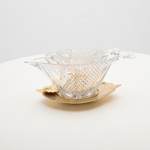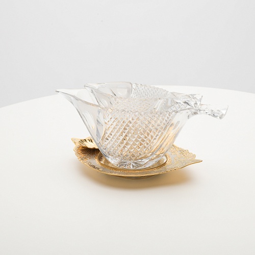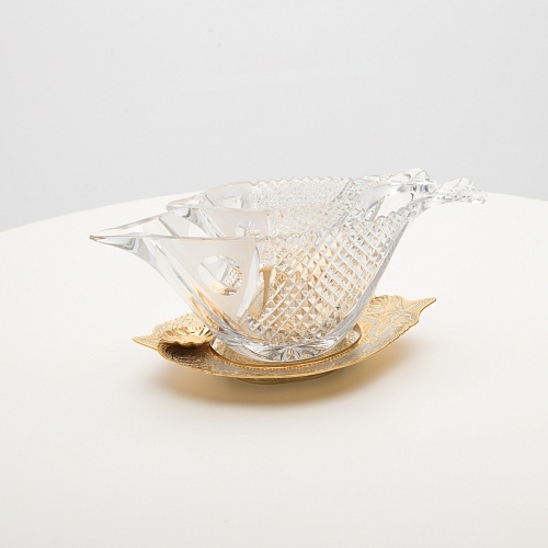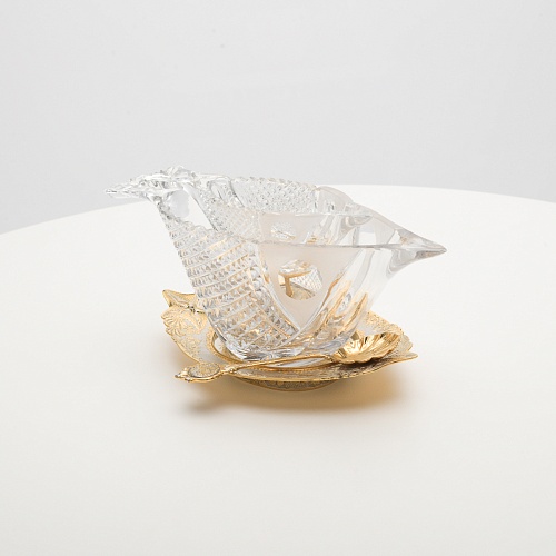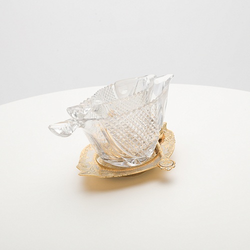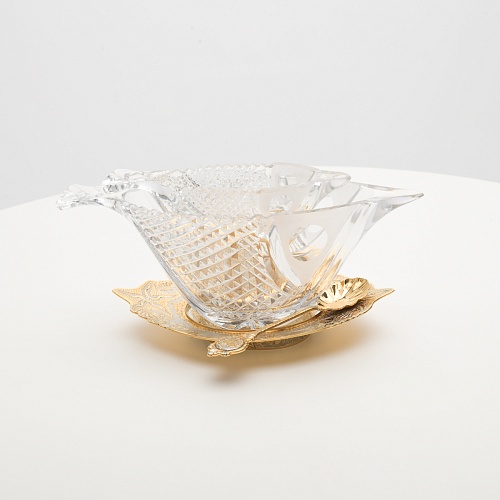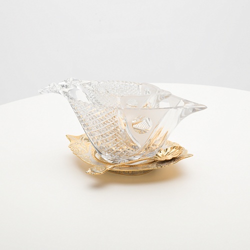 В набор икорницы для черной икры входят: хрустальная чаша с трапециевидным дном для икры, хрустальная чаша для льда, ложечка, подставка для икорницы из металла, подставка для чаши под лед. Подставки и ложечка выполнены в технике златоустовской гравюры на металле, декорированы сюжетами на морскую тематику.