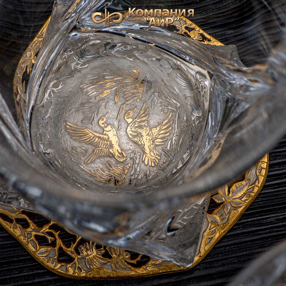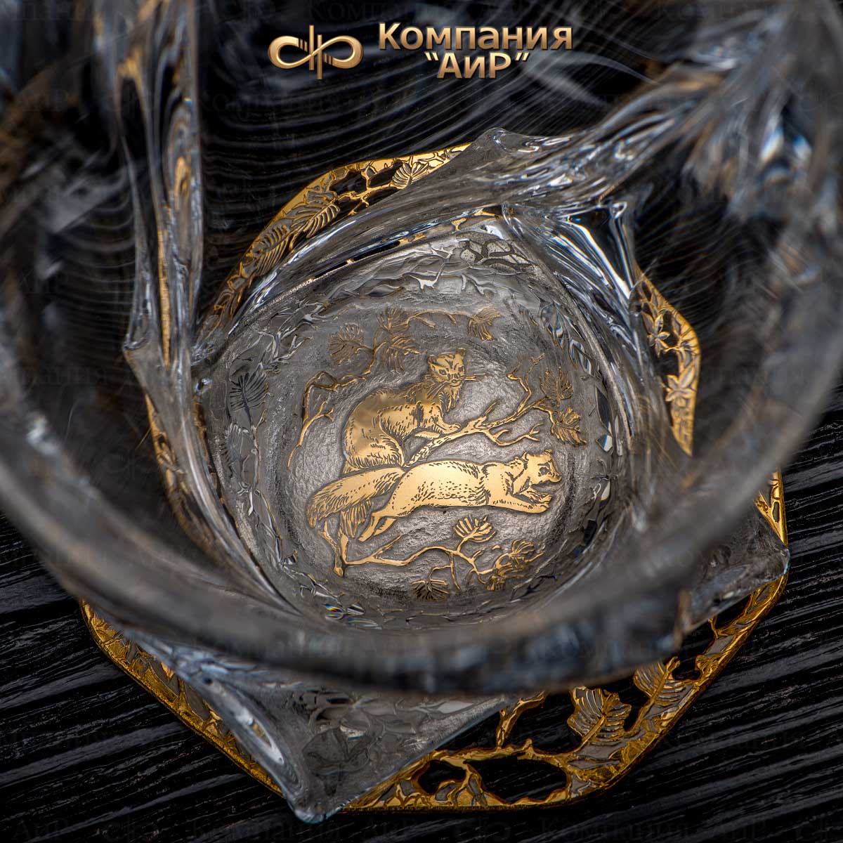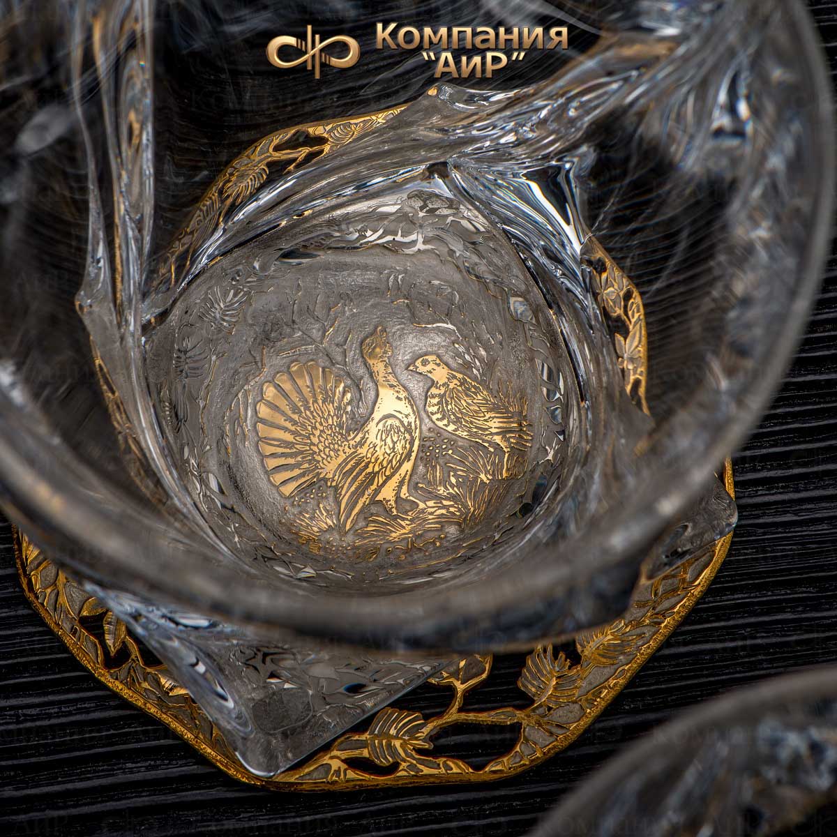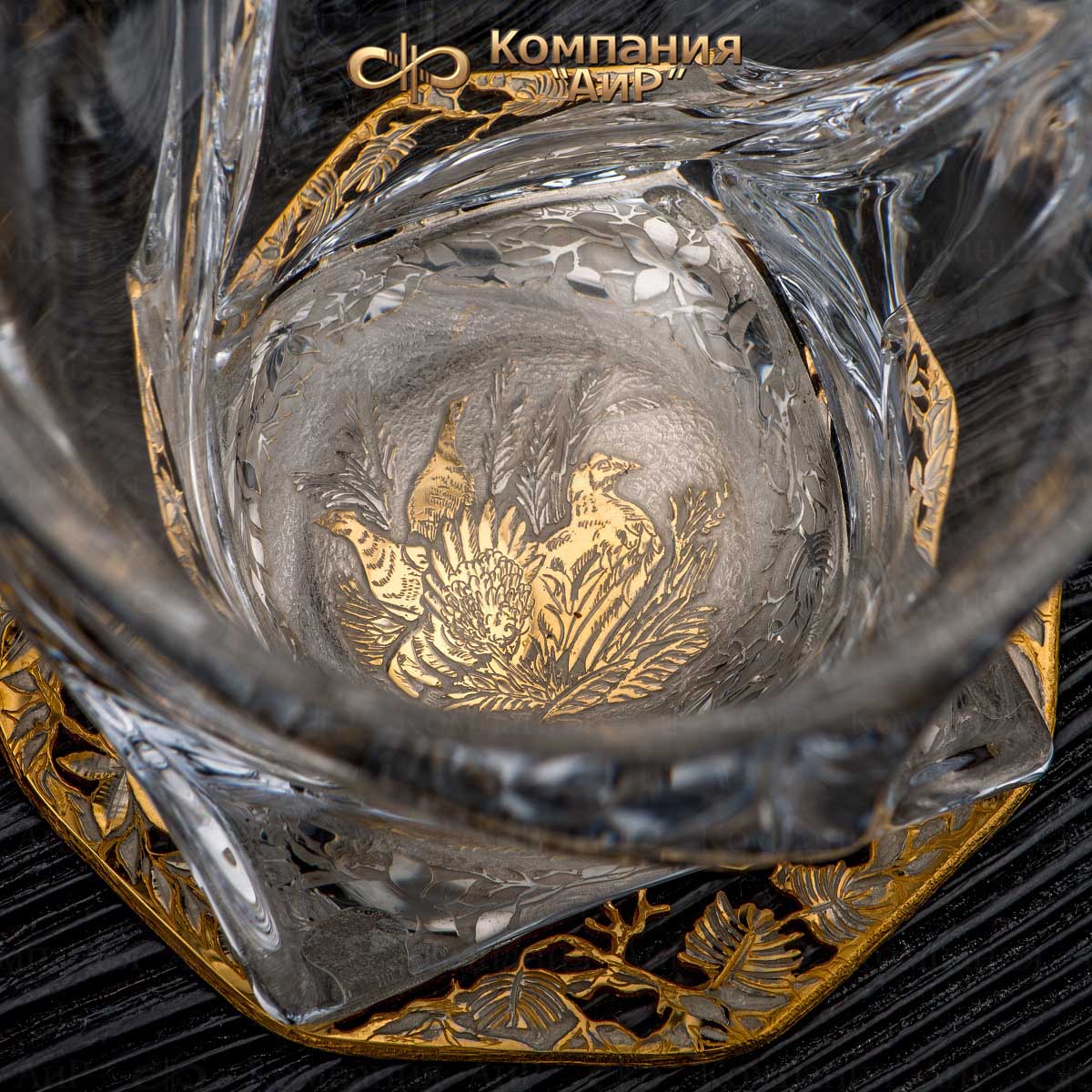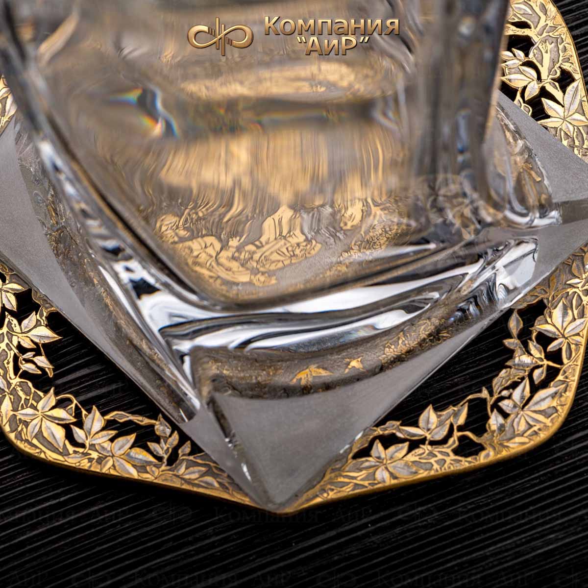 Подставки украшены сюжетами на природную тему. Сквозь прозрачное стекло бокалов и штофа можно спокойно любоваться игрой золотистого цвета виски, а потом, осушив бокал, увидеть лесного зверя или птицу, которые по воле художника открываются на дне бокала. Бокалы под виски принято заполнять не более чем на треть. При подаче виски должно быть охлажденным, но не слишком холодным. Виски принято пить маленькими глотками, подолгу держа во рту, чтобы распробовать его вкус. Виски по традиции считаются напитком второй половины дня, как нельзя лучше подходящим для вечерних встреч, бесед, размышлений.