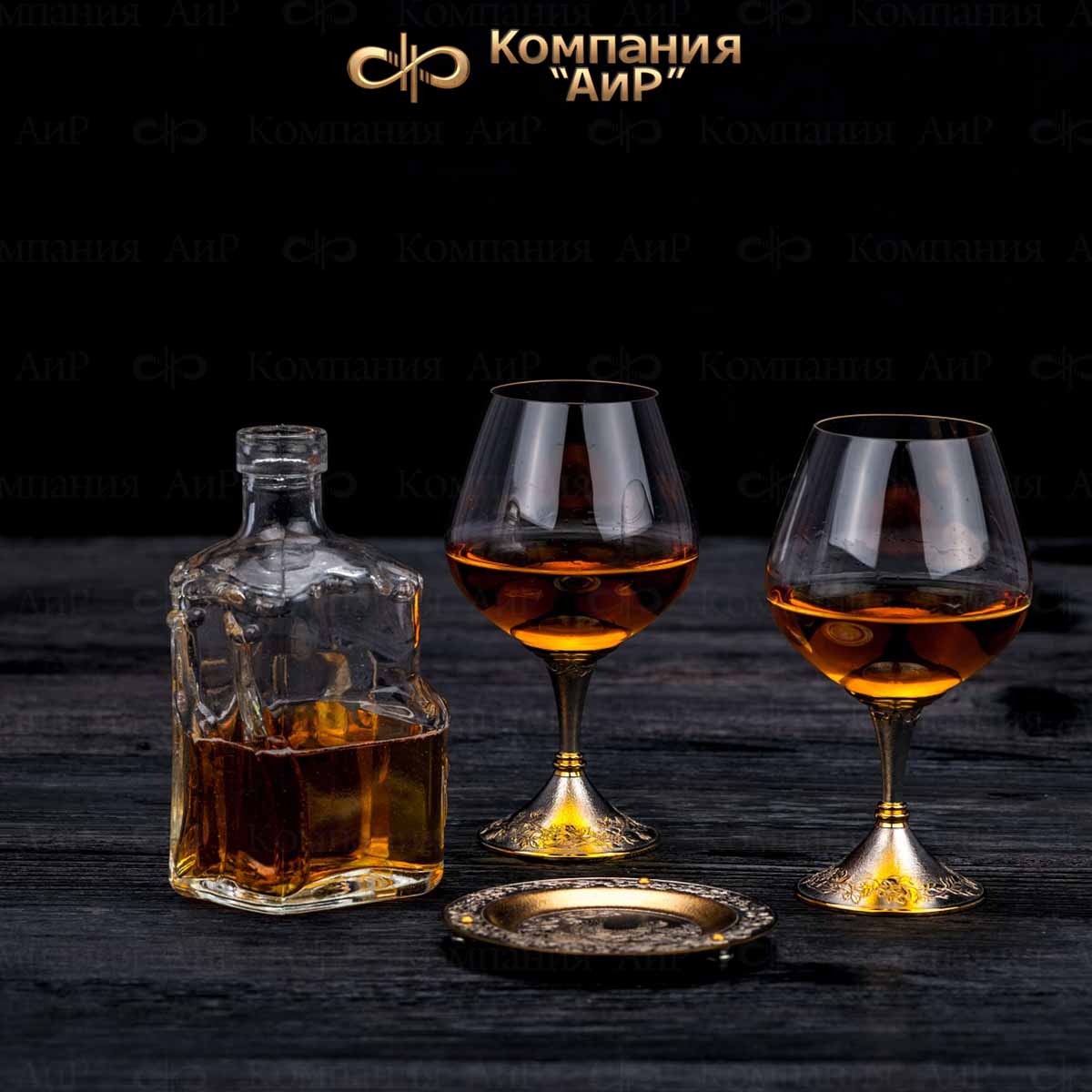В коньячный «Мужской» набор входят два снифтера (снифтер – это традиционный бокал для коньяка, в переводе с английского «snift» означает «нюхать») и блюдце под закуску. Бокалы и блюдце выполнены в художественном стиле златоустовской гравюры на металле.
