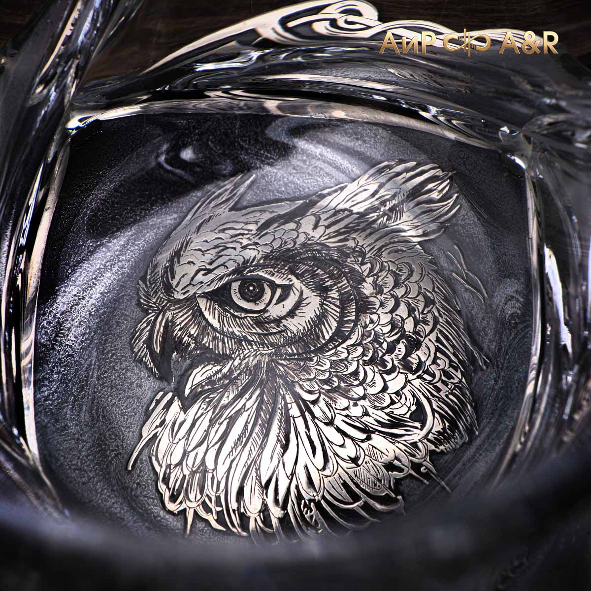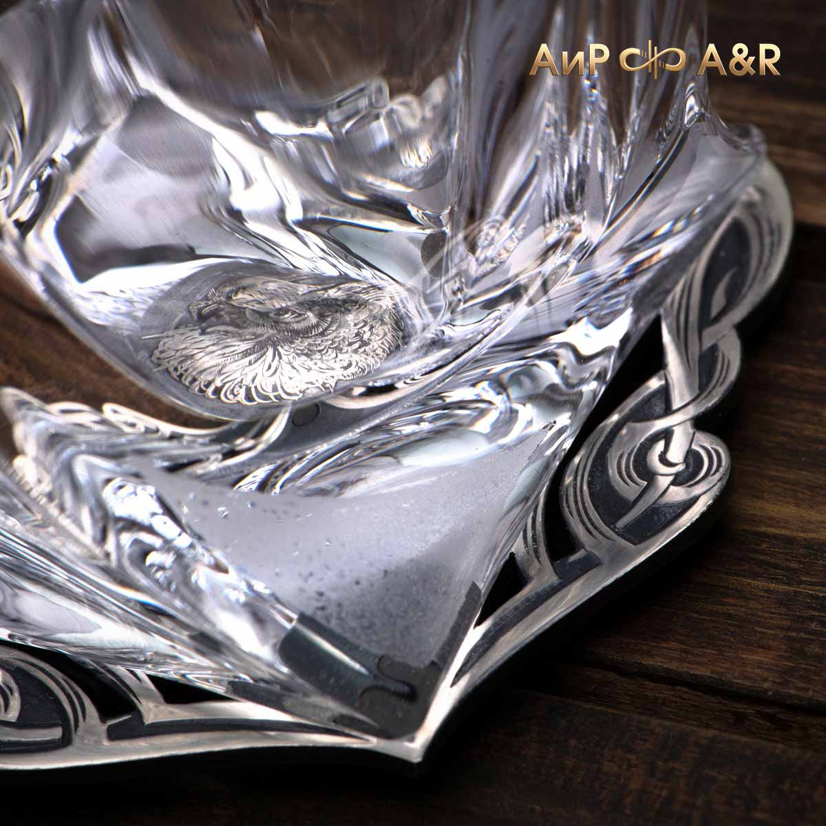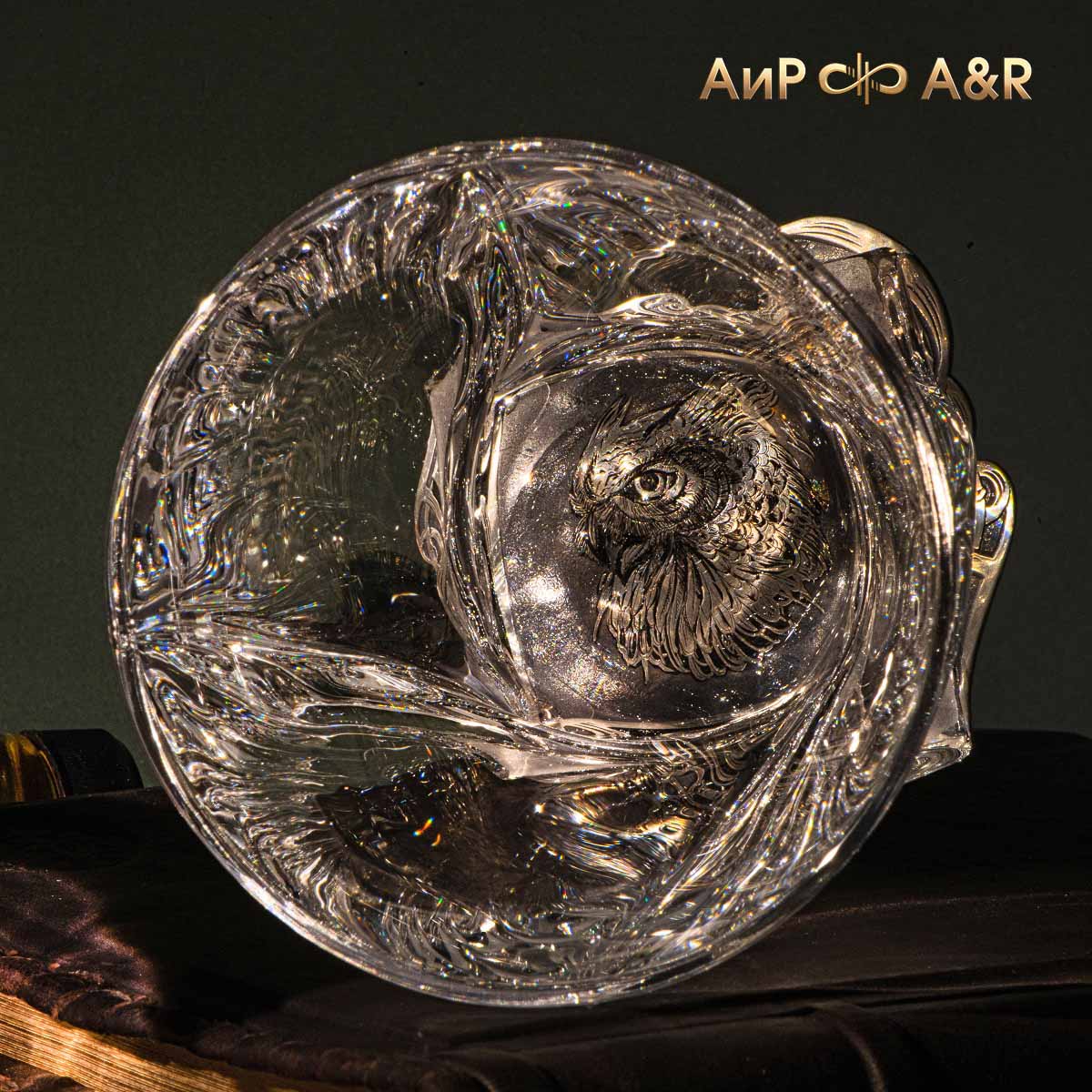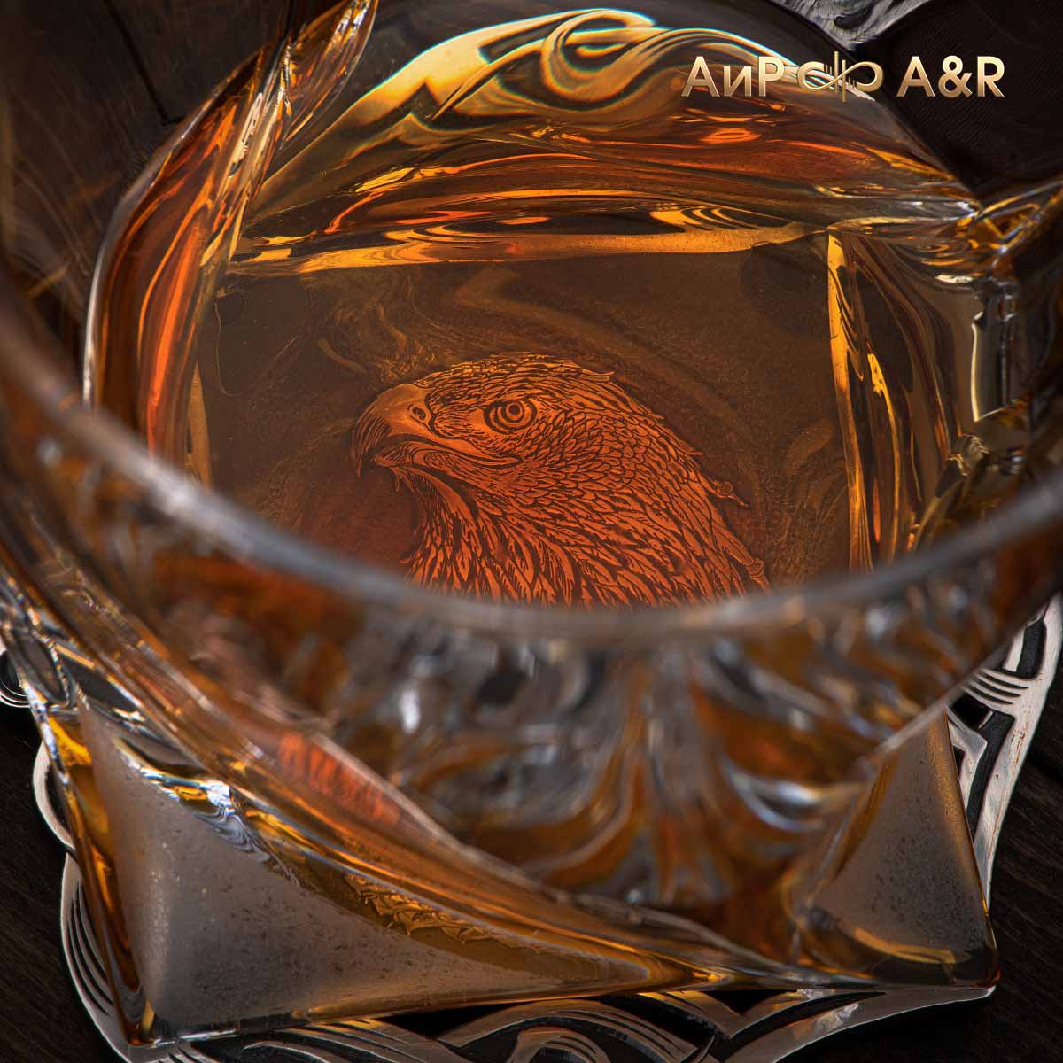 В набор для виски "Хозяин" входят два бокала из чешского стекла Bohemia и небольшое блюдо под закуску. Бокалы и блюдо украшены в художественном стиле златоустовской гравюры на металле. Миниатюры с изображением лесных зверей и птиц: медведь, филин, беркут. У стеклянных бокалов на дне имеются украшенные металлические подставки.