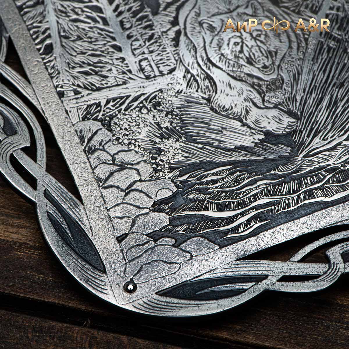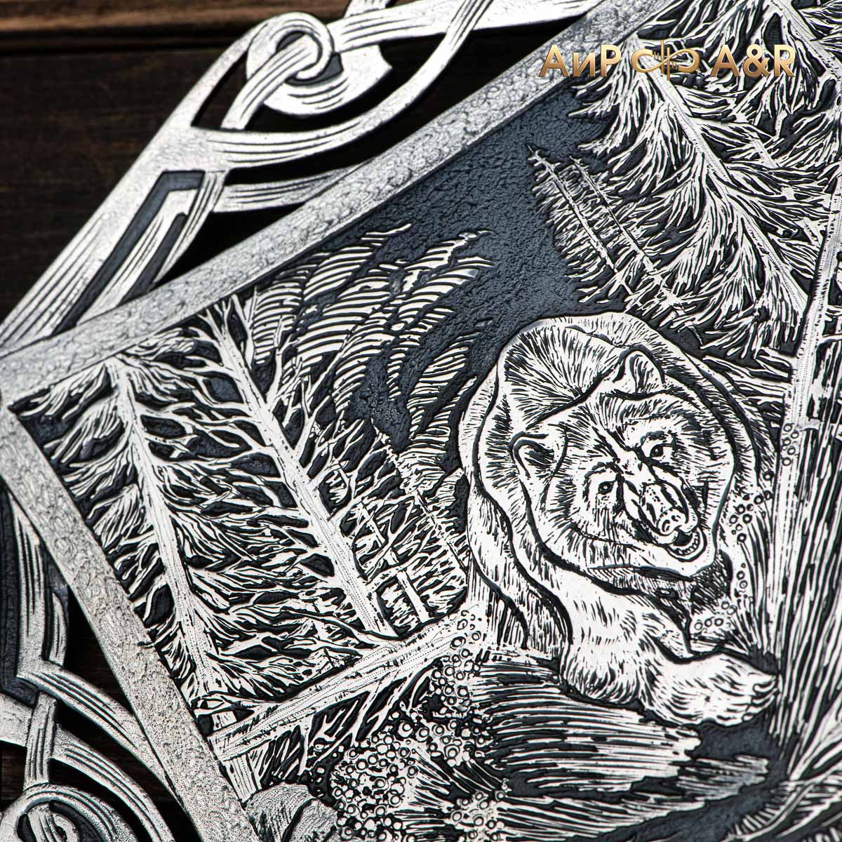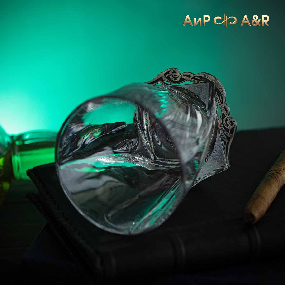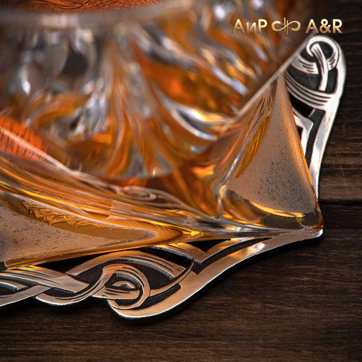 В набор для виски "Хозяин" входят два бокала из чешского стекла Bohemia и небольшое блюдо под закуску. Бокалы и блюдо украшены в художественном стиле златоустовской гравюры на металле. Миниатюры с изображением лесных зверей и птиц: медведь, филин, беркут. У стеклянных бокалов на дне имеются украшенные металлические подставки.