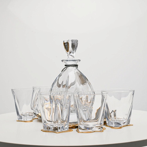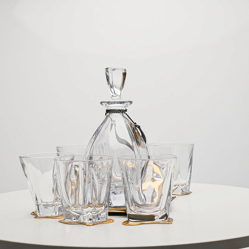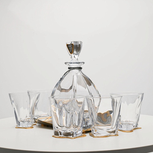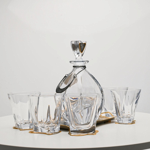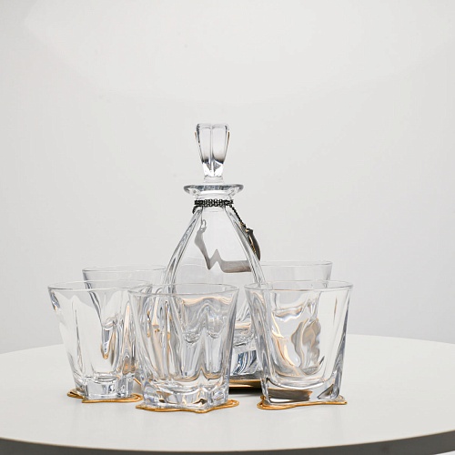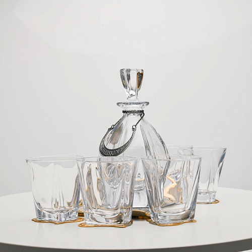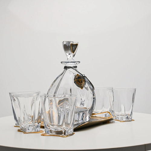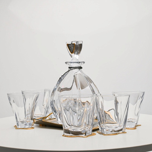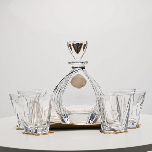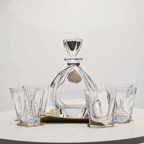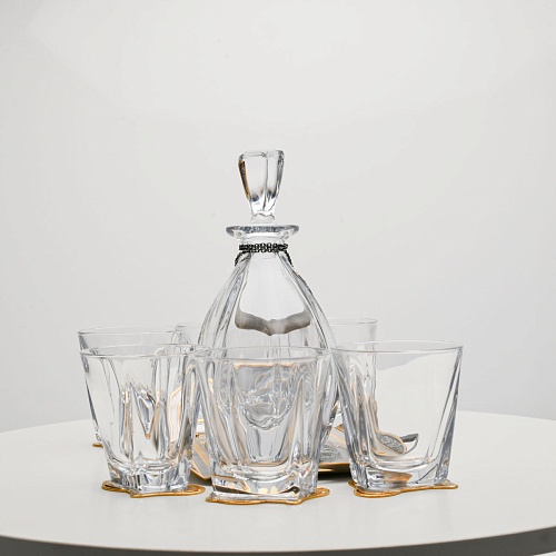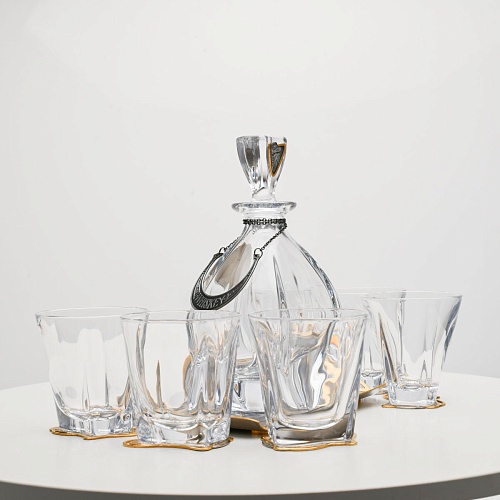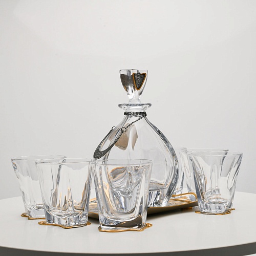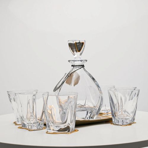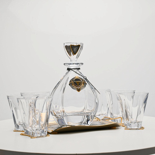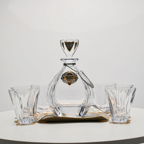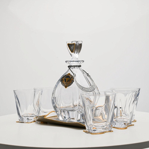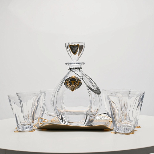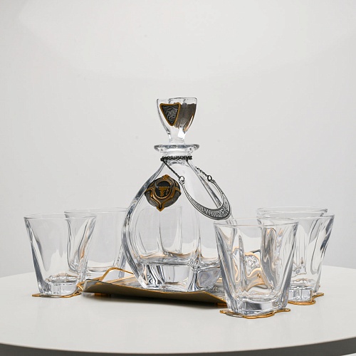 В набор для виски "Rodeo" входят шесть бокалов, поднос и штоф объемом 750 мл из богемского стекла. Поднос, бокалы и штоф украшены в художественном стиле златоустовской гравюры на металле. У стеклянных бокалов и штофа на дне имеются украшенные металлические подставки. Кроме того, стеклянная пробка штофа также декорирована накладкой.