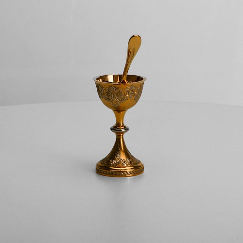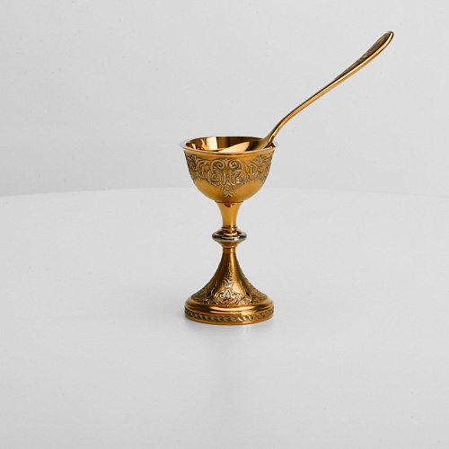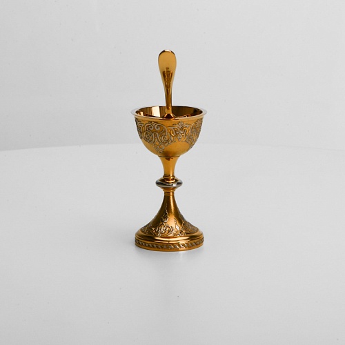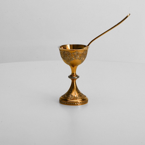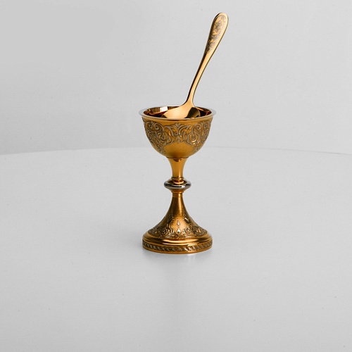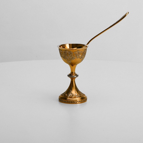 Пашотница имеет форму небольшой рюмочки на ножке. Основание и боковые стороны пашотницы и ложечки украшены растительным орнаментом.